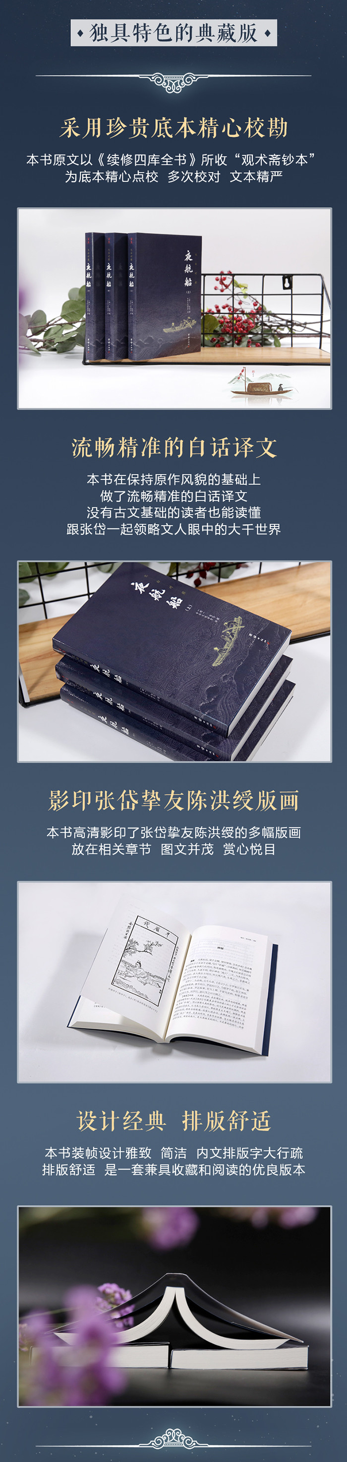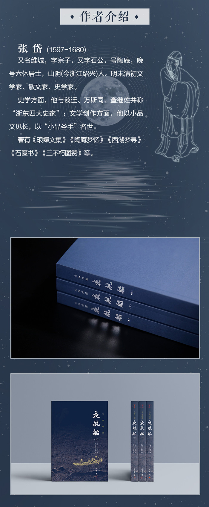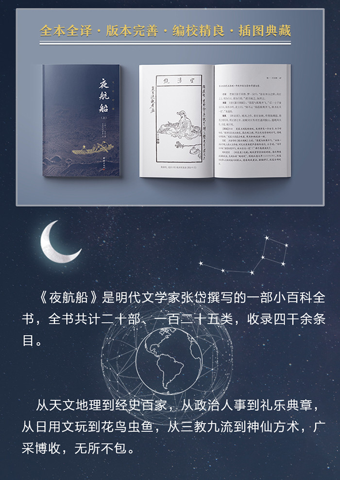【基本信息】 书名:夜航船(全本全译) (插图典藏版,余秋雨教授大力推荐,张岱挚友陈洪绶经典插图本,三百多年前的百科全书,中国文人眼中的大千世界) 出版社:团结出版社 定价:136.00元(全3册) 书号:9787512660472 出版日期:2019.6 作者:(明)张岱 撰;中华文化讲堂 译 版次:1 页数:1384 印刷时间:2019-6 开本:32开 纸张:胶版纸 印次:1 包装:平装 中图分类号:K248.066 【书籍目录】 总目 卷一•天文部5 卷二•地理部111 卷三•人物部199 卷四•考古部295 卷五•伦类部325 卷六•选举部451 卷七•政事部571 卷八•文学部635 卷九•礼乐部745 卷十•兵刑部821 卷十一•日用部863 卷十二•宝玩部921 卷十三•容貌部945 卷十四•九流部993 卷十五•外国部1087 卷十六•植物部1109 卷十七•四灵部1151 卷十八•荒唐部1235 卷十九•物理部1275 卷二十•方术部1339 【编辑推荐】 ★采用珍贵底本精心校勘 本书原文以《续修四库全书》所收“观术斋抄本”为底本精心点校。多次校对,文本精严。 ★流畅精准的白话译文 本书在保持原作风貌的基础上,做了流畅精准的白话译文,没有古文基础的读者也能读懂。跟张岱一起领略文人眼中的大千世界。 ★影印张岱挚友陈洪绶版画 本书高清影印了张岱挚友陈洪绶的多幅版画,放在相关章节,图文并茂,赏心悦目。 ★设计经典,排版舒适 本书装帧设计雅致、简洁,内文排版字大行疏,排版舒适,是一套兼具收藏和阅读的优良版本。 【内容简介】 《夜航船》是明代文学家张岱撰写的一部小百科全书,全书共计二十部、一百二十五类,收录四干余条目。从天文地理到经史百家,从政治人事到礼乐典章,从日用文玩到花鸟虫鱼,从三教九流到神仙方术,广采博收,无所不包。 【作者简介】 张岱(1597-1680),又名维城,字宗子,又字石公,号陶庵,晚号六休居士,山阴(今浙江绍兴)人。明末清初文学家、散文家、史学家。史学方面,他与谈迁、万斯同、查继佐井称“浙东四大史家”;文学创作方面,他以小品文见长,以“小品圣手”名世。著有《琅嬛文集》《陶庵梦忆》《西湖梦寻》《石匮书》《三不朽图赞》等。 【媒体评论】 我的书架上有一部明代文学家张岱的《夜航船》。这部明代小百科的书名确实太有意思了,连我自己巡睃书架时也常常会让目光在那里顿一顿,耳边响起欸乃的橹声。——余秋雨 张宗子(岱)曾写过一部《夜航船》的书,在书中,张宗子云:天下学问,唯夜航船中zui难对付。张宗子所说的“夜航船”,系一些旁门左道的功夫,上至天文,下至地理,三教九流,诸子百家,人伦政事,草木花卉,鬼神怪异,非常高妙。——赵焰 有人这样形容:哪里人声鼎沸,锣鼓喧天,哪里肯定有张岱;曲终人散,风冷月残,有人吹出一缕悲箫,那听客肯定是张岱。一个多么丰富、美好的男人。所以,我说:若生在明清,就只嫁张岱。——章诒和 夜航船中的“考问”虽多是一些极肤浅的事,但它却包罗着“天下学问”,都应重视的。——《人民日报(海外版)》 【在线试读部分章节】 象纬 东方苍天,南方炎天,西方昊天,北方玄天,东北旻天,西北幽天,西南朱天,东南阳天,中央钧天。 日、月、星谓之三光。日、月合金、木、水、火、土五星谓之七政,又谓之七曜。日月所止舍,一日更七次,谓之七襄。 九天东方叫苍天,南方叫炎天,西方叫昊天,北方叫玄天,东北叫旻天,西北叫幽天,西南叫朱天,东南叫阳天,中央叫钧天。 太阳、月亮、星星合称“三光”。太阳、月亮与金、木、水、火五大行星合称“七政”,又称“七曜”。太阳和月亮停歇的处所,一天要变更七次,这就叫“七襄”。 东方七宿:角,木蛟;亢,金龙;氐,土貉;房,日兔;心,月狐;尾,火虎;箕,水豹。 北方七宿:斗,木獬;牛,金牛;女,土蝠;虚,日鼠;危,月燕;室,火猪;壁,水貐。 西方七宿:奎,木狼;娄,金狗;胃,土雉;昴,日鸡;毕,月乌;觜,火猴;参,水猿。 南方七宿:井,木犴;鬼,金羊;柳,土獐;星,日马;张,月鹿;翼,火蛇;轸,水蚓。 二十八宿东方是青龙七宿:角,木蛟;亢,金龙;氐,土貉;房,日兔;心,月狐;尾,火虎;箕,水豹。 北方是玄武七宿:斗,木獬;牛,金牛;女,土蝠;虚,日鼠;危,月燕;室,火猪;壁,水貐。 西方是白虎七宿:奎,木狼;娄,金狗;胃,土雉;昴,日鸡;毕,月乌;觜,火猴;参,水猿。 南方是朱雀七宿:井,木犴;鬼,金羊;柳,土獐;星,日马;张,月鹿;翼,火蛇;轸,水蚓。 角、亢、氐:郑,兖州。房心:宋,豫州。尾箕:燕,幽州。斗牛女:吴,扬州。虚危:齐,青州。室壁:卫,并州。奎娄胃:鲁,徐州。昴毕;赵,冀州。觜参:晋,益州。井鬼:秦,雍州。柳星张:周,三河。翼轸:楚,荆州。 分野二十八个星宿在地面对应的国家和州分别是:角、亢、氐对应郑国和兖州。房、心对应宋国和豫州。尾、箕对应燕国和幽州。斗、牛、女对应吴国和扬州。虚、危对应齐国和青州。室、壁对应卫国和并州。奎、娄、胃对应鲁国和徐州。昴、毕对应赵国和冀州。觜、参对应晋国和益州。井、鬼对应秦国和雍州。柳、星、张对应周国和三河。翼、轸对应楚国和荆州。 | ||