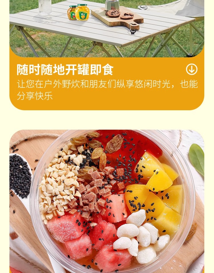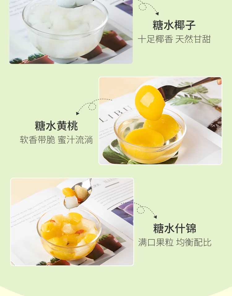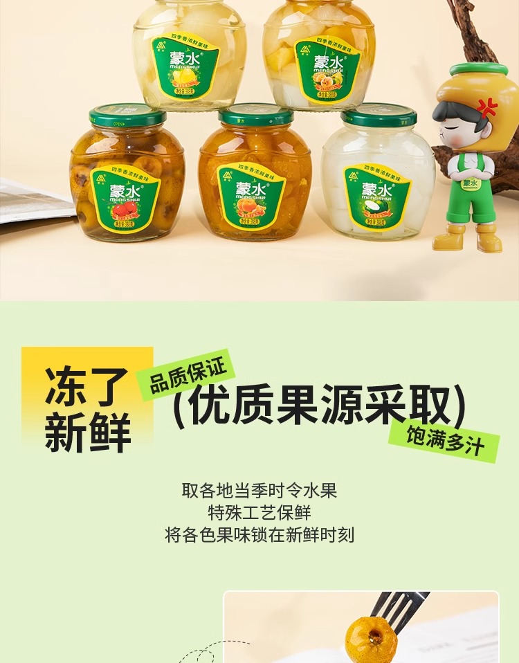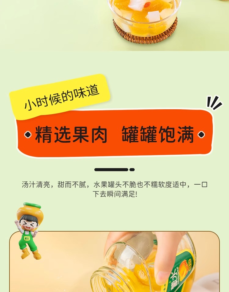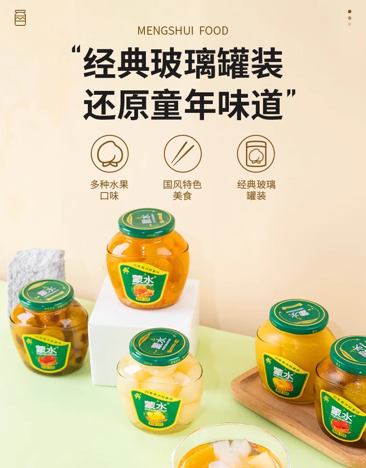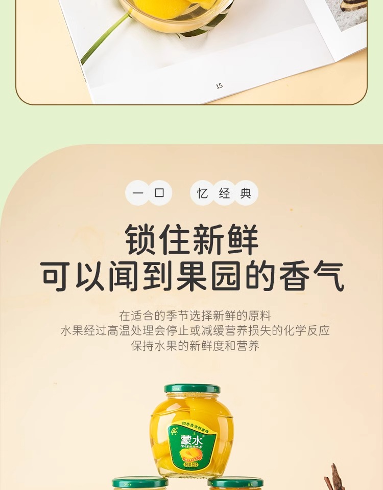【山东沂蒙 蒙水水果罐头】口感出色:果肉肉质细腻、肥厚饱满,入口无渣,口感清脆,汁多味甜,汤汁清澈透亮,入口酸甜,滑嫩爽口,果香浓郁.