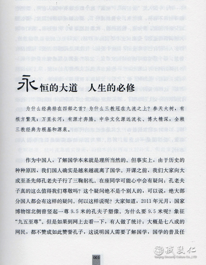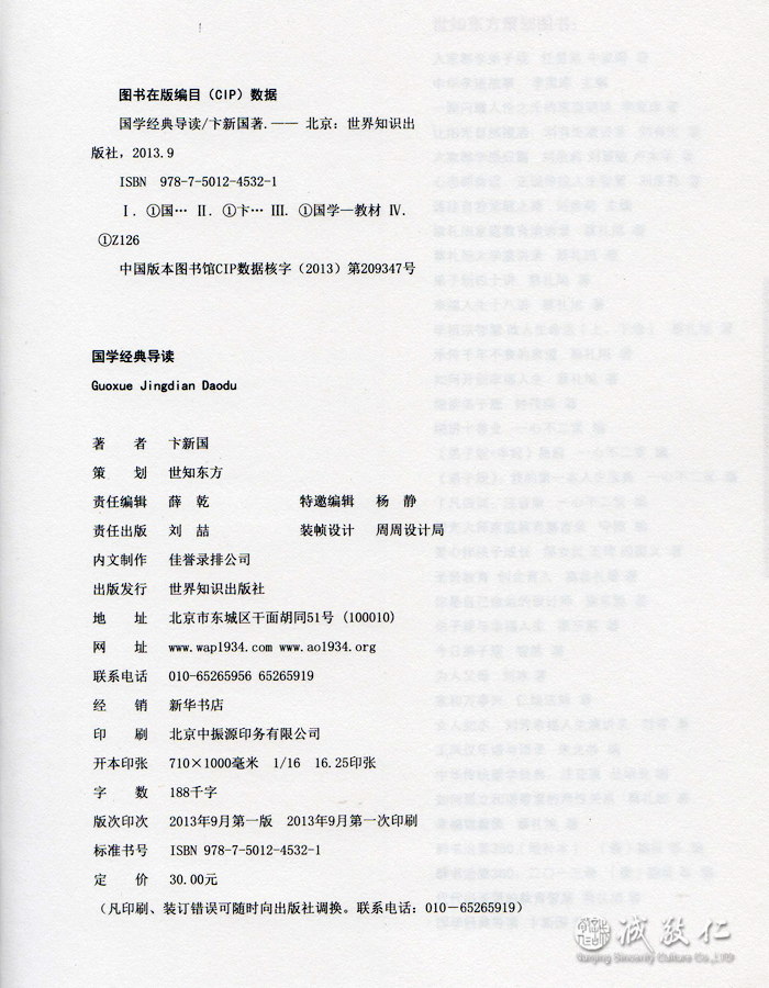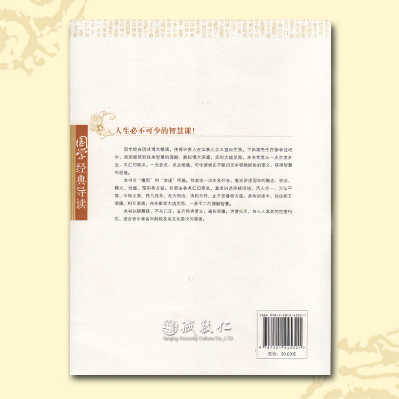 【基本信息】: 书 名:国学经典导读 作 者:卞新国 版 次:1 装 帧:平装 开 本:1/16 页 码:250页 字 数:188千字 正文语种:中文简体 出 版 社:世界知识出版社 出版日期:2013年9月 ISBN 号:9787501245321 定 价:30元 售 价:16.5元,为您节省13.5元! 【作者简介】: 卞新国,江苏镇江人,1959年出生,江苏大学文法学院副教授,镇江市第七届政协委员。镇江市宗教局、镇江市社科联等特聘讲师团专家。中国老子同道会江苏分会副会长、副理事长、专家委员会主任。 长期从事文学方面的教学和研究,酷爱国学。在江苏大学开设《中国文化概论》、《佛教文化概论》、《宗教文化概论》、《国学经典导读》和《周易解读》等课程,备受欢迎。 所创办江苏大学国学社于2011年受任为中国共青团江苏省委员会“江苏省高校国学论坛”轮值主席单位。 近年来,在全国各地就爱国主义、幸福人生、心性修养、领导艺术、经营管理、文学艺术、养生之道等主题宣讲国学数百场。 卞新国老师力主知行合一,立志将践行和弘传国学作为后半生的唯一使命。许多人经由他的一次次演讲,开阔了心胸、开启了智慧,成了国学事业的践履者,走上了自利利他的智慧人生道路。 【主编推荐】: 本书以经解经,不杂己见,直奔经典要义,通俗易懂,方便实用,与人人本具的性德相应,适合老中青各年龄段及各文化层次的读者。 经典选讲,融会贯通儒释道各家思想,在普及经典的同时,帮助大家重新拾起丢失已久的民族文化自信心。 【内容简介】: 人生必不可少的智慧课!备受欢迎的国学入门课! 中华传统文化教师职业技术资格认证通用教程! 人生最大的幸福莫过于开启智慧,人生最大的不幸莫过于没有智慧。本书帮你会通经典的教诲,找回迷失的智慧! 国学经典因其博大精深,使得许多人在仰慕之余又望而生畏。卞新国先生在修学过程中,深深感受到经典智慧的圆融:貌似博大深邃,实则大道至简。本书常常从一点生发开去,又汇归原点。一元多点,点点相通,可令读者在不断归元中领略经典的要义,获得智慧的启迪。 本书分“概览”和“会通”两编。前者由一点生发开去,重点讲述国学的概念、学法、精义、价值、落实等方面。后者由各点汇归原点,重点讲述宗经明道、天人合一、万法平等、中和之美、转凡成圣、无为而治、协和万邦、止于至善等方面。具体讲述中,往往相互涵摄、相互渗透,在在彰显大道至简、一多不二的圆融智慧。 【目录】: 开头的话/001 上篇——概览 永恒的大道 人生的必修/003 祖宗的遗产 无尽的受用/012 圣教不玄奥 路子很重要/019 大道有妙用 万变不离宗/028 国学千般好 不做总是空/043 一把金钥匙 得此慧门开/060 心怀敞亮了 哪能不愉悦/070 神医不用求 健康不用愁/082 真听老人言 事业准兴旺/099 人人学经典 国泰且民安/109 下篇——会通 宗经明道/128 天人合一/163 万法平等/171 中和之美/181 知命立命/190 谦恭自省/199 转凡成圣/204 无为而治/214 协和万邦/228 世界大同/231 止于至善/240 结 语/246 【精彩内容】: 为什么经典排在四部之首?为什么三教冠于九流之上?参天大树有根方繁茂;万里长河,有源才奔腾。中华文化源远流长、博大精深,全赖三教经典为根基和源泉。 作为中国人,了解国学本来就是理所当然的。但事实上,由于历史的种种原因,我们国人确实是越来越疏远了国学。开课之前,我们大家向大成至圣先师孔老夫子行了三鞠躬礼。在座同学可能心中会有疑问:孔老夫子真的值得我们尊敬吗?这个疑问绝不是个别人的,可以说,绝大部分国人都会有这样的疑问。何以这样说呢?大家知道,2011年元月,国家博物馆北侧曾竖起一尊9.5米的孔夫子塑像。为什么要9.5米呢?象征“九五至尊”。但是如果网上去看一下,有人做了统计:大概是七八成的网民,都不赞成如此赞誉孔子,这说明国人需要了解国学,国学的普及任重道远。中国人一般强调“爱国”,但要知道,中国人的爱国,跟别国不一样。中国人是“爱祖国”。 ...... |