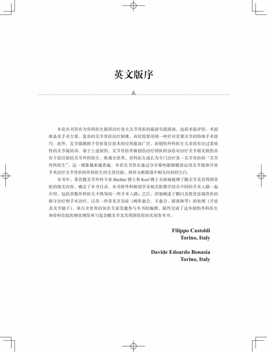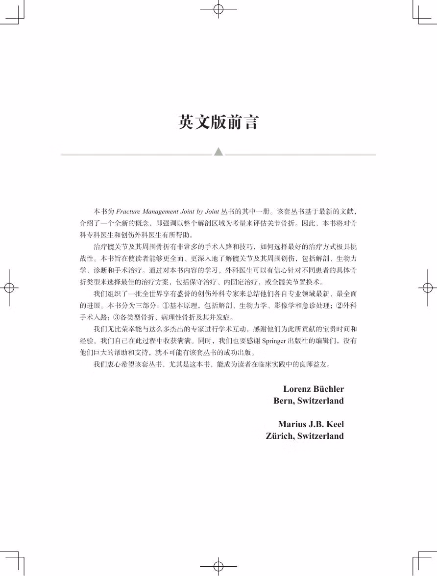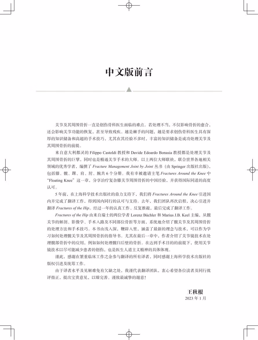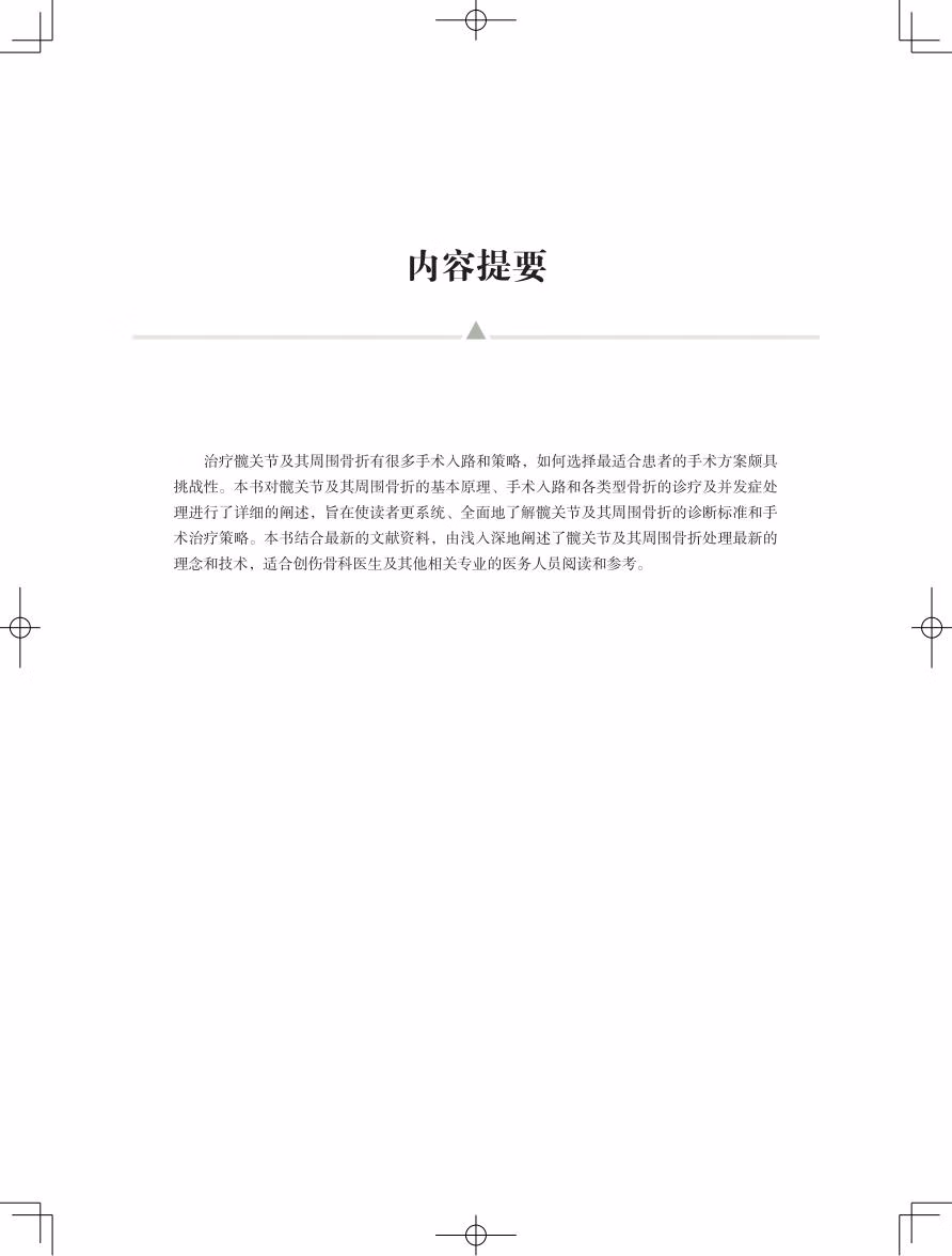 治疗髋关节及其周围骨折有非常多的手术入路和技巧,如何选择最好的治疗方式极具挑战性。本书旨在使读者能够更全面、更深入地了解髋关节及其周围创伤,包括解剖、生物力学、诊断和手术治疗。通过对本书内容的学习,外科医生可以有信心针对不同患者的具体骨折类型来选择最佳的治疗方案,包括保守治疗、内固定治疗,或全髋关节置换术。