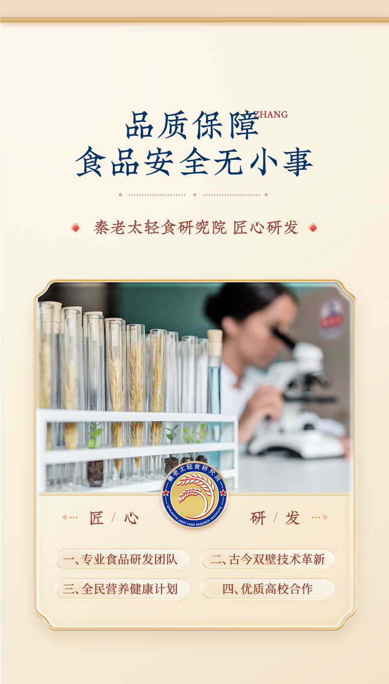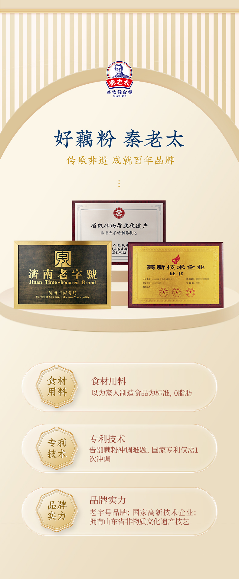 - 秦老太创始于1993年,专注谷物轻食餐。秦老太茶汤,2012年被正式授予非物质文化遗产。进入新时代,秦老太人怀揣匠心精神,以 “为家人制造食品”为理念,传承中华食养文化!