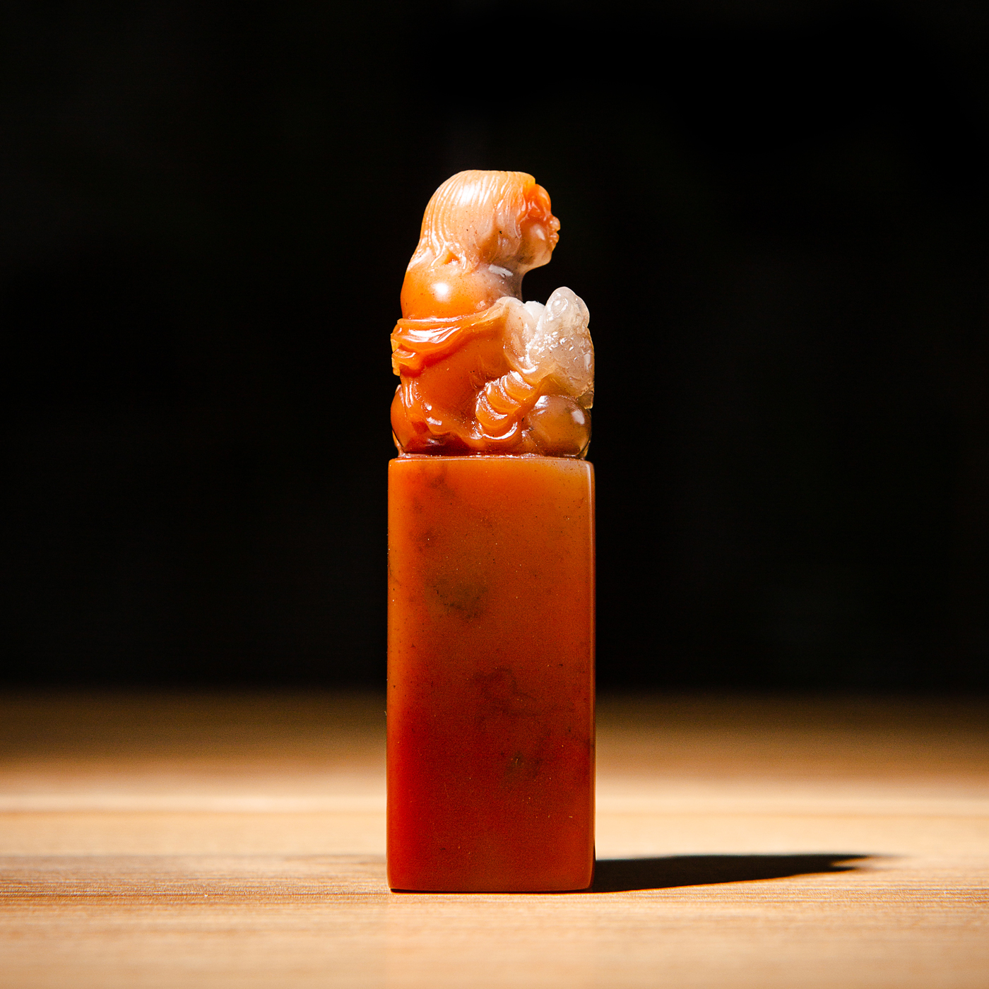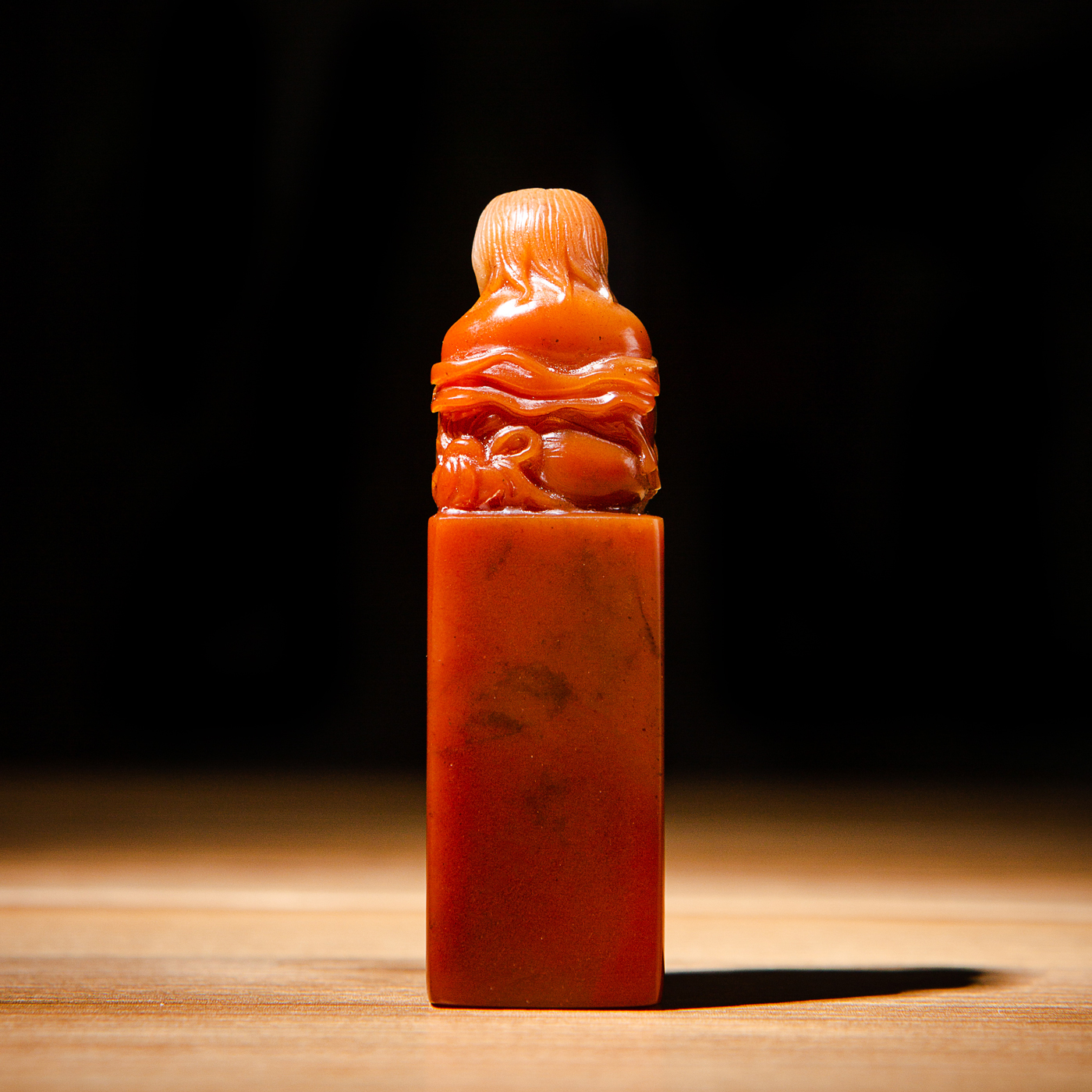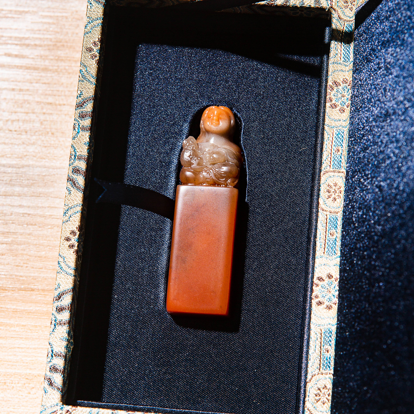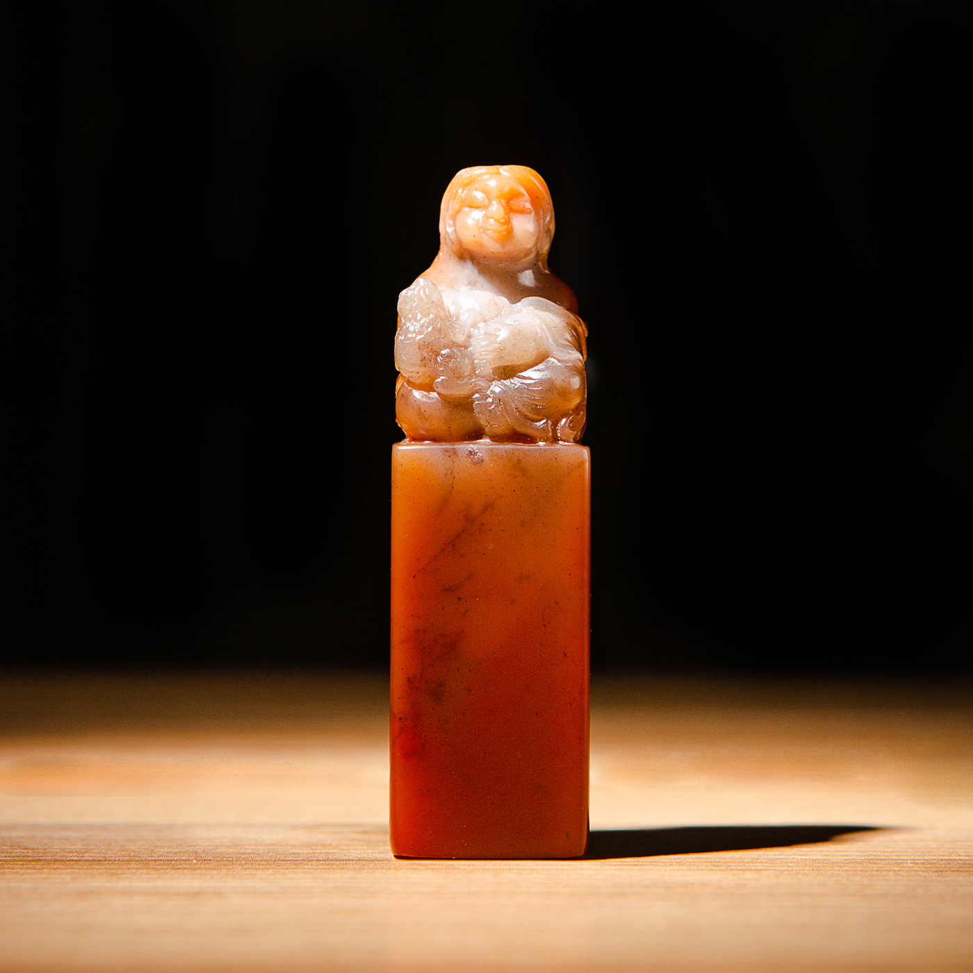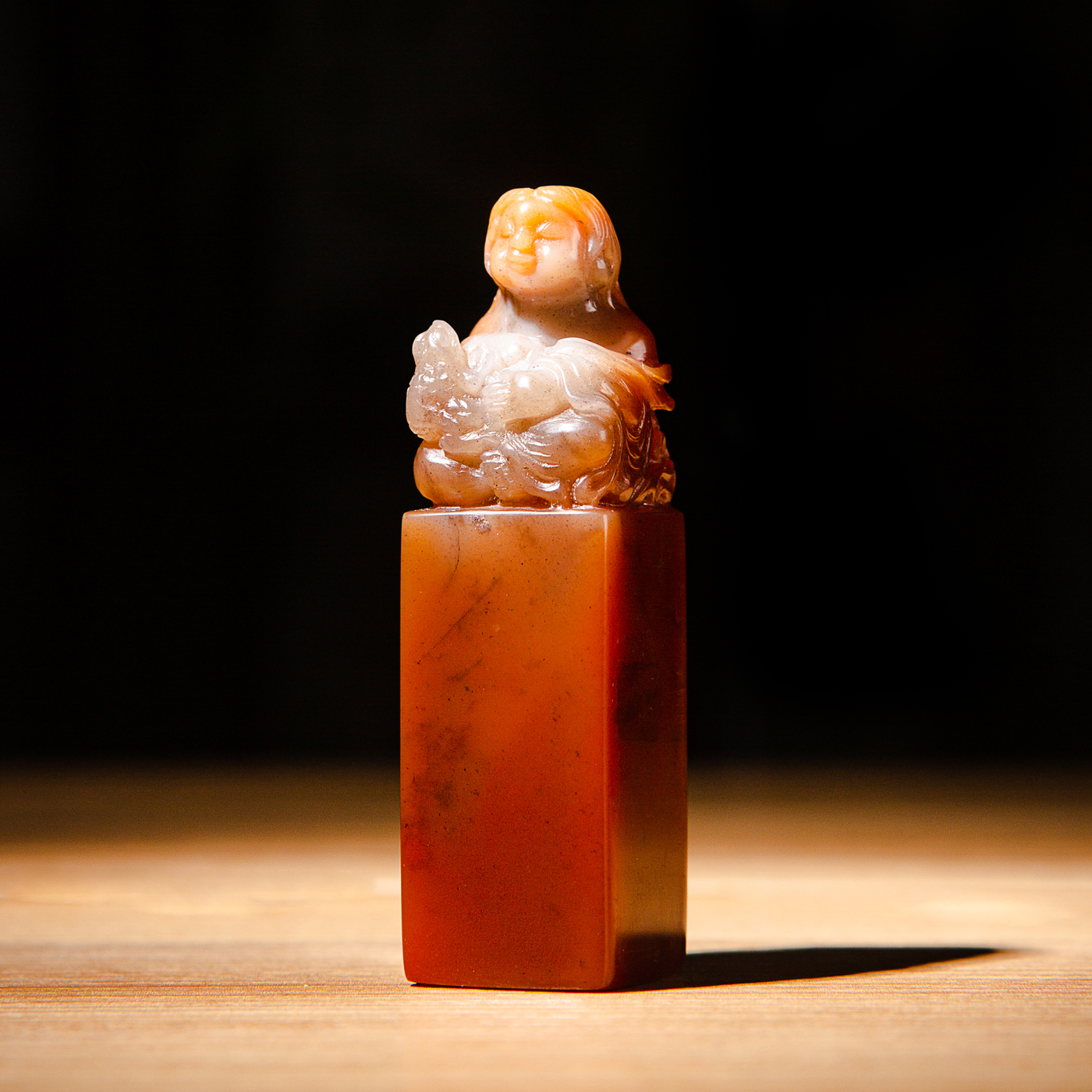 寿山石老料手雕“刘海戏金蟾”方章,选料为存放几十年之老料,料质极佳。其雕工精细,题材刻画生动,极具艺术效果和实用性。