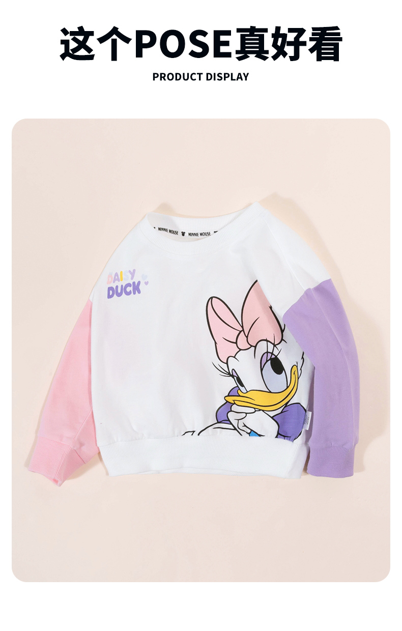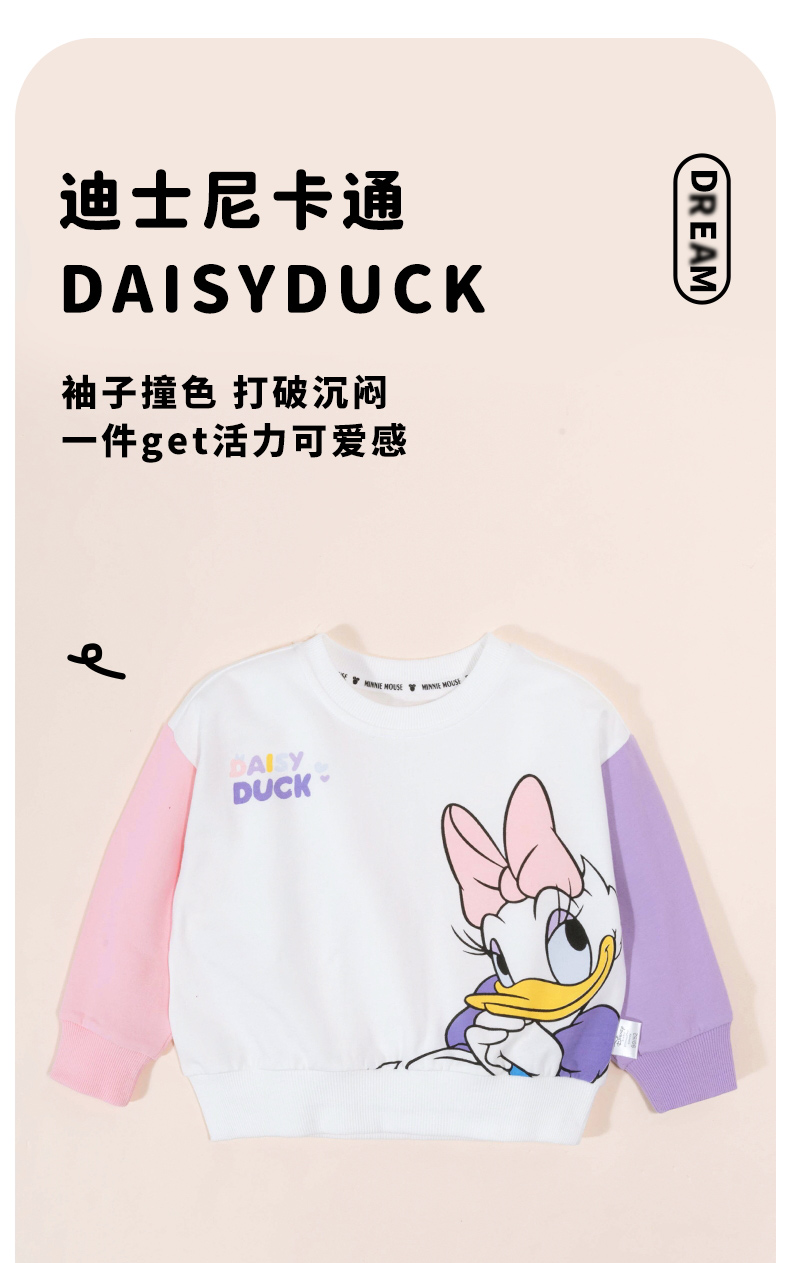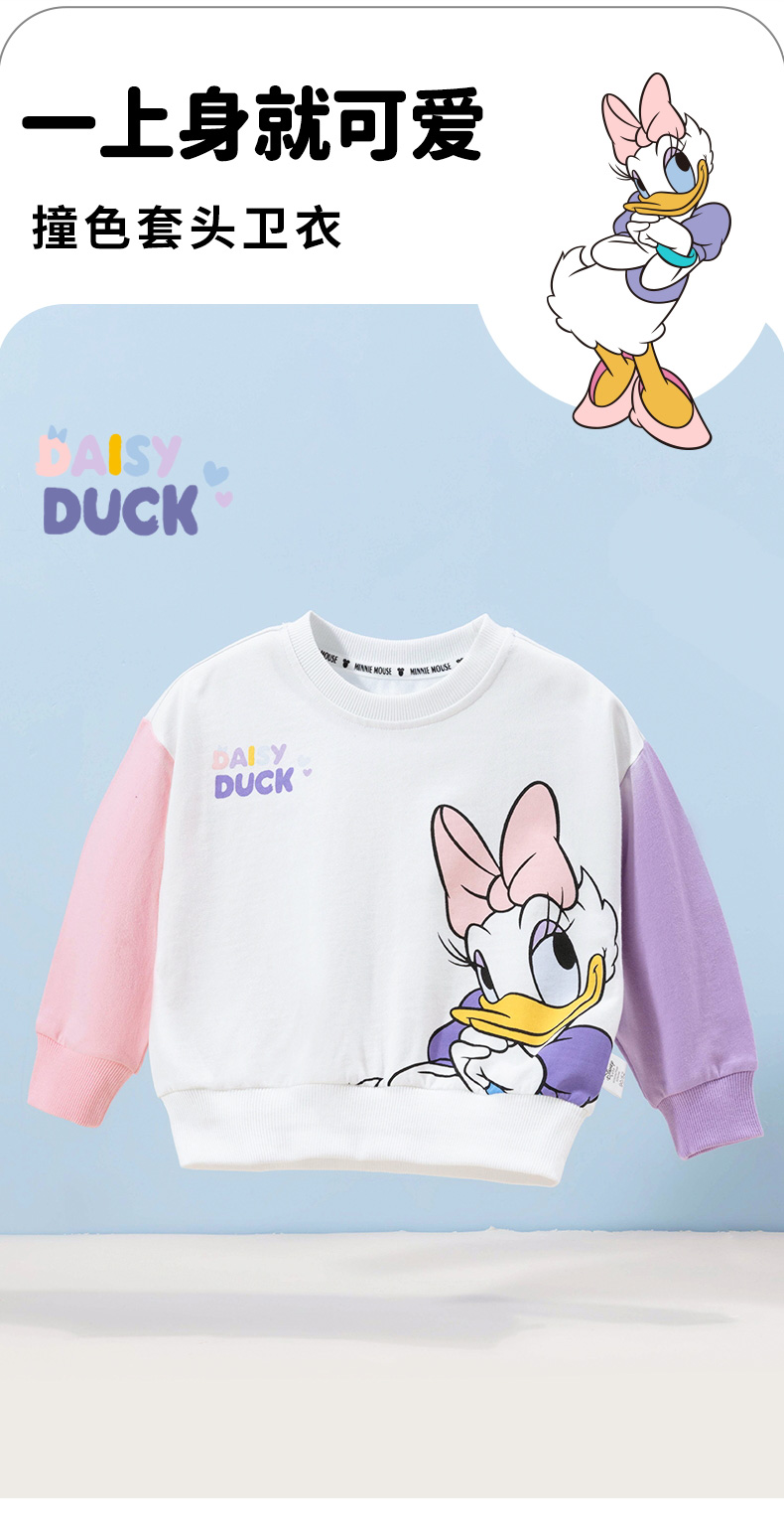 迪士尼女童卫衣春季2024儿童甜美黛西印花拼色袖上衣百搭纯棉套头衫ZD1DS004