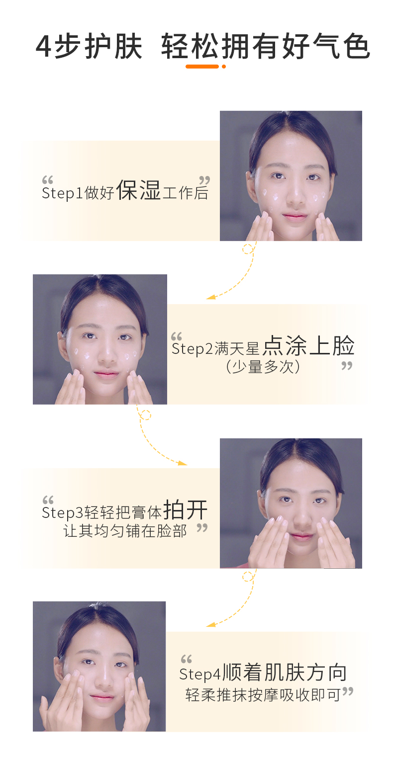 保湿步骤做好之后,将面霜密集均匀地点涂在面部各个位置,然后轻轻拍打涂抹铺开,少量多次。再顺着皮肤走向用手大面积涂抹至均匀。涂抹均匀后,肤色顿时白了两个度,颜色白得自然,而且透气舒适。