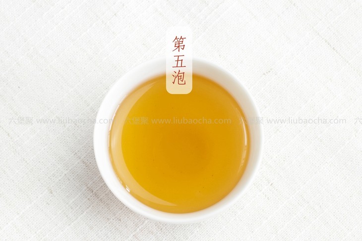 第五泡:汤色黄橙透亮,几泡下来变化不大,花蜜甜香、果香,茶汤入口甜顺,滋味醇和,甜度增加,通透;喝完有回甘,有茶气,喉部有丝丝清凉感,伴有原种老树茶韵,余韵悠长,身体舒服。