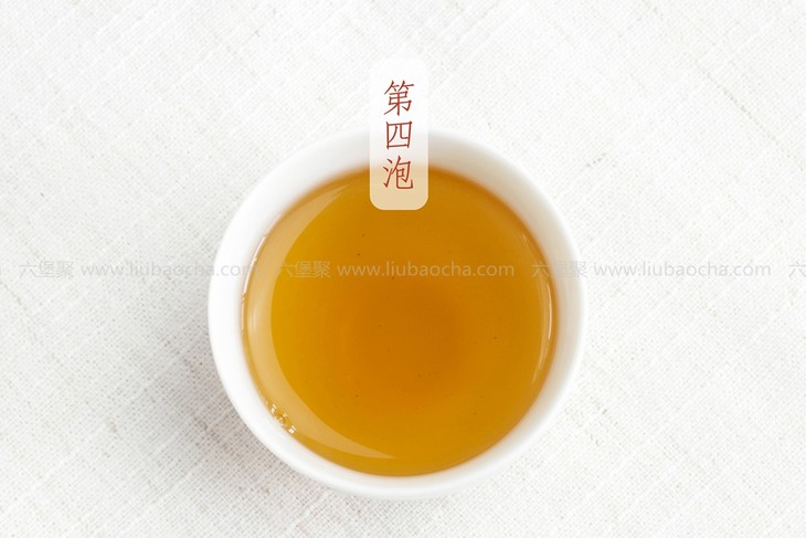 第四泡:汤色黄橙透亮,香溶于水,舒服的果香、蜜香,茶汤入口柔和、清甜,微涩,喝后甘润、有茶气,伴有原种六堡老树茶韵,体感舒适。