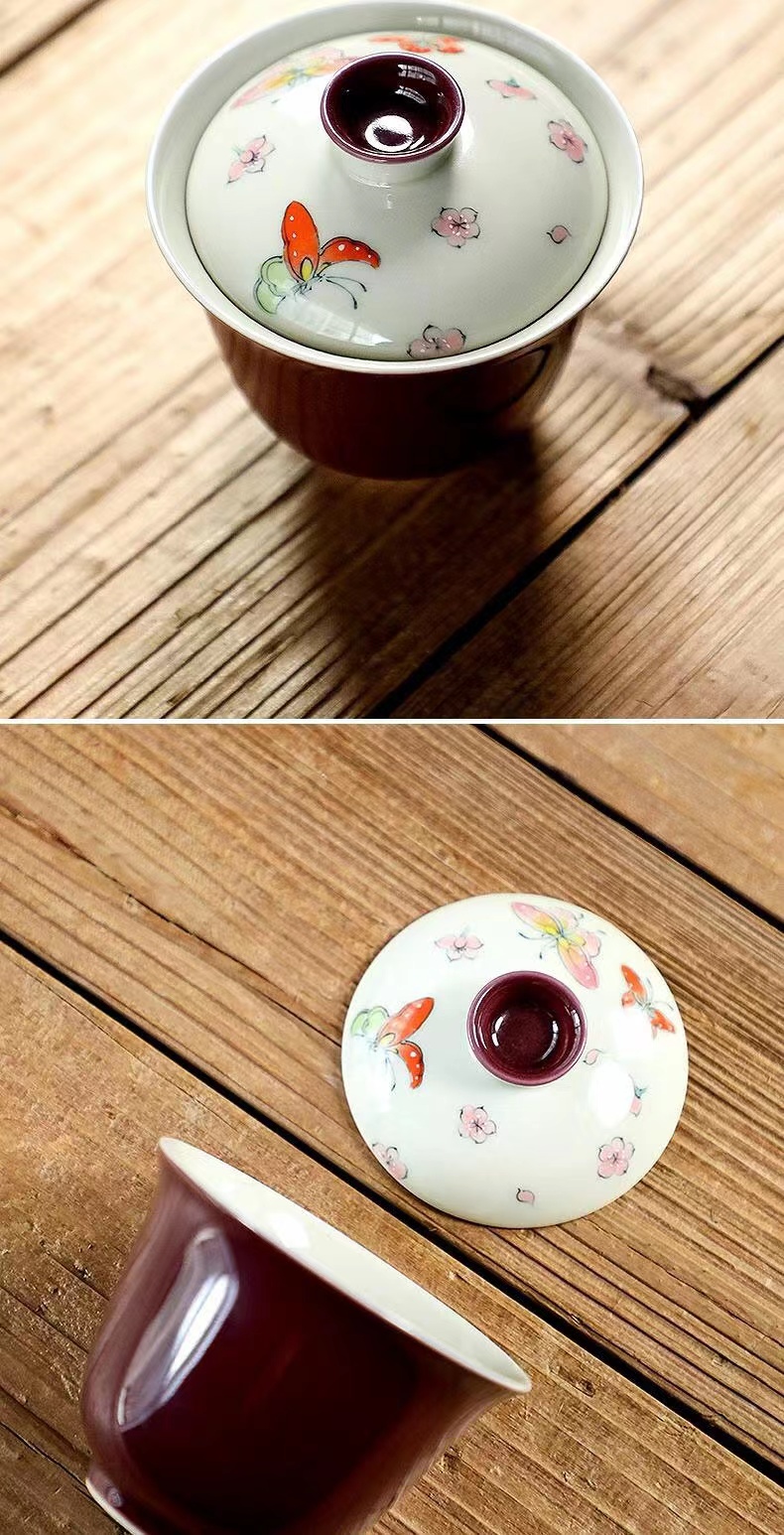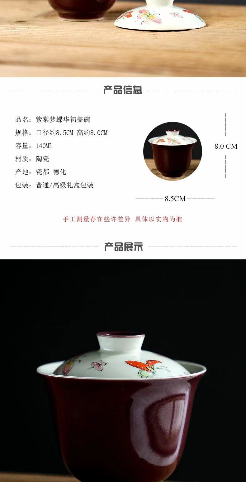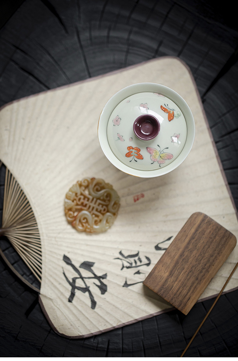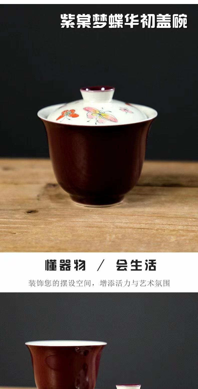 永利汇紫色手绘蝴蝶盖碗茶杯女士高颜值陶瓷泡茶碗女士茶具手工