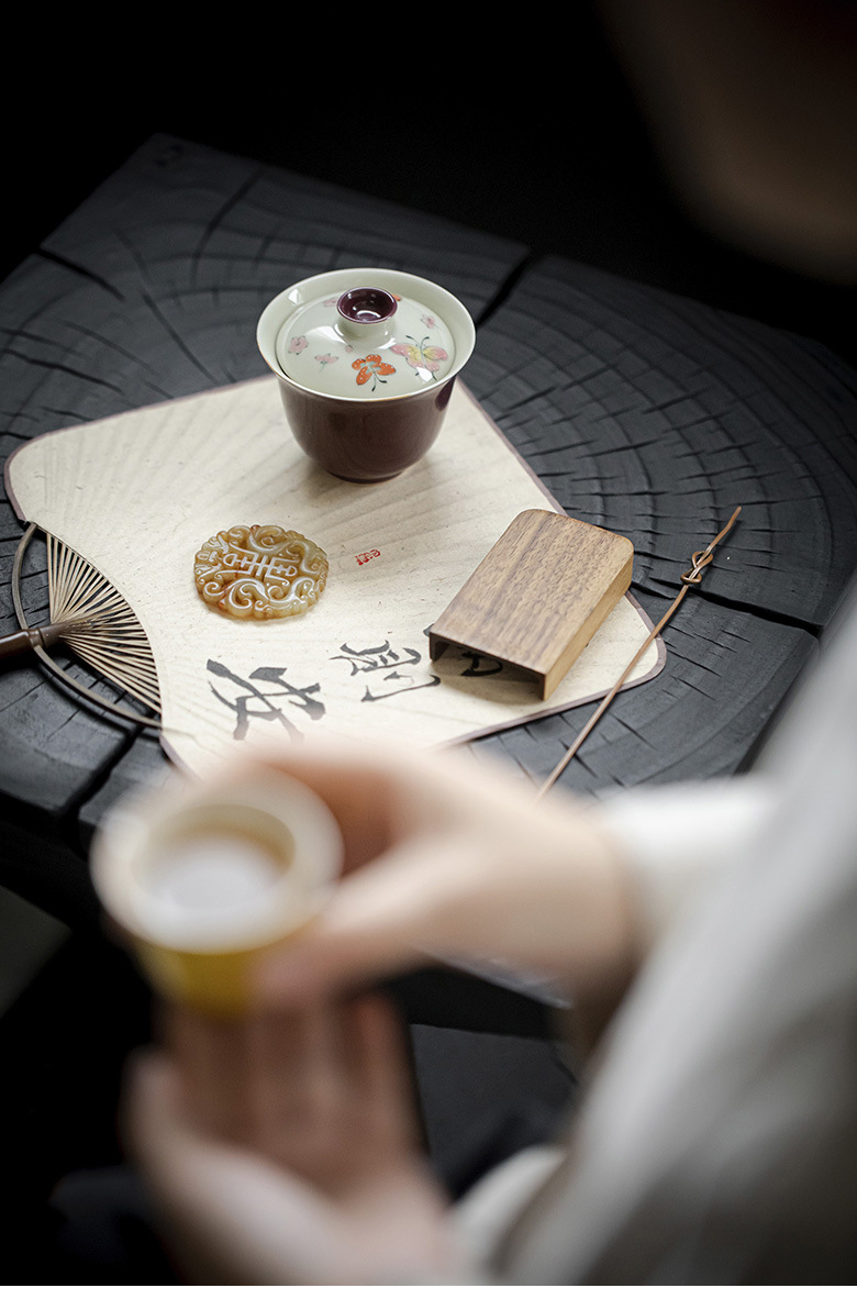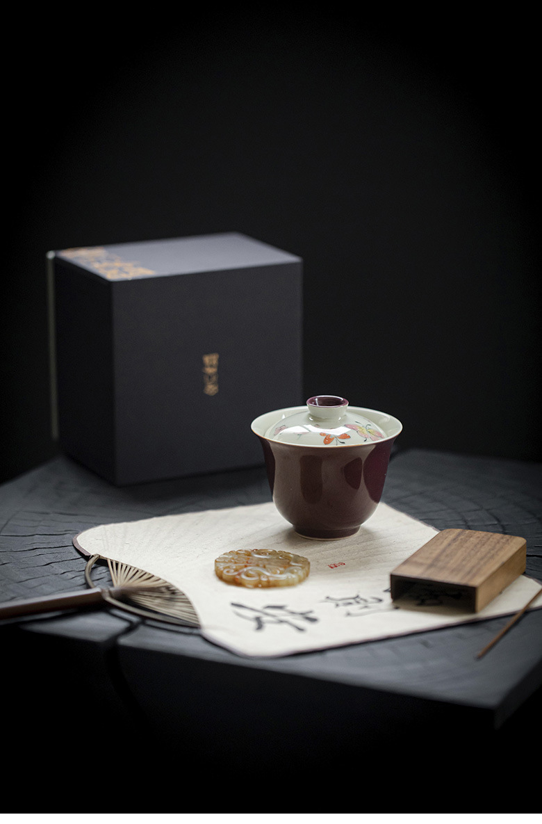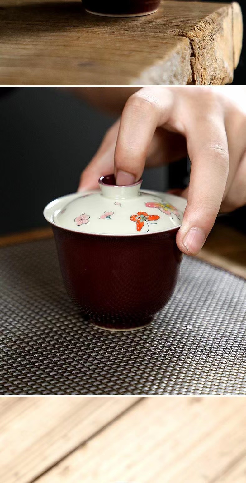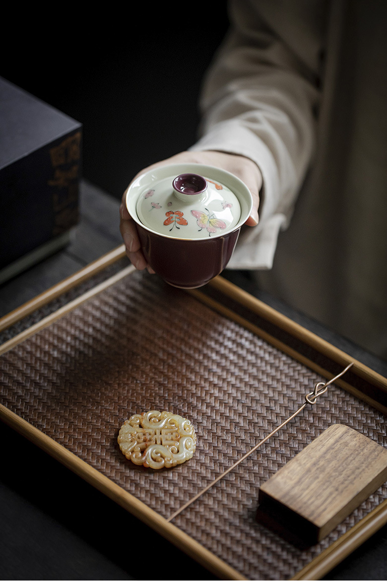 永利汇紫色手绘蝴蝶盖碗茶杯女士高颜值陶瓷泡茶碗女士茶具手工