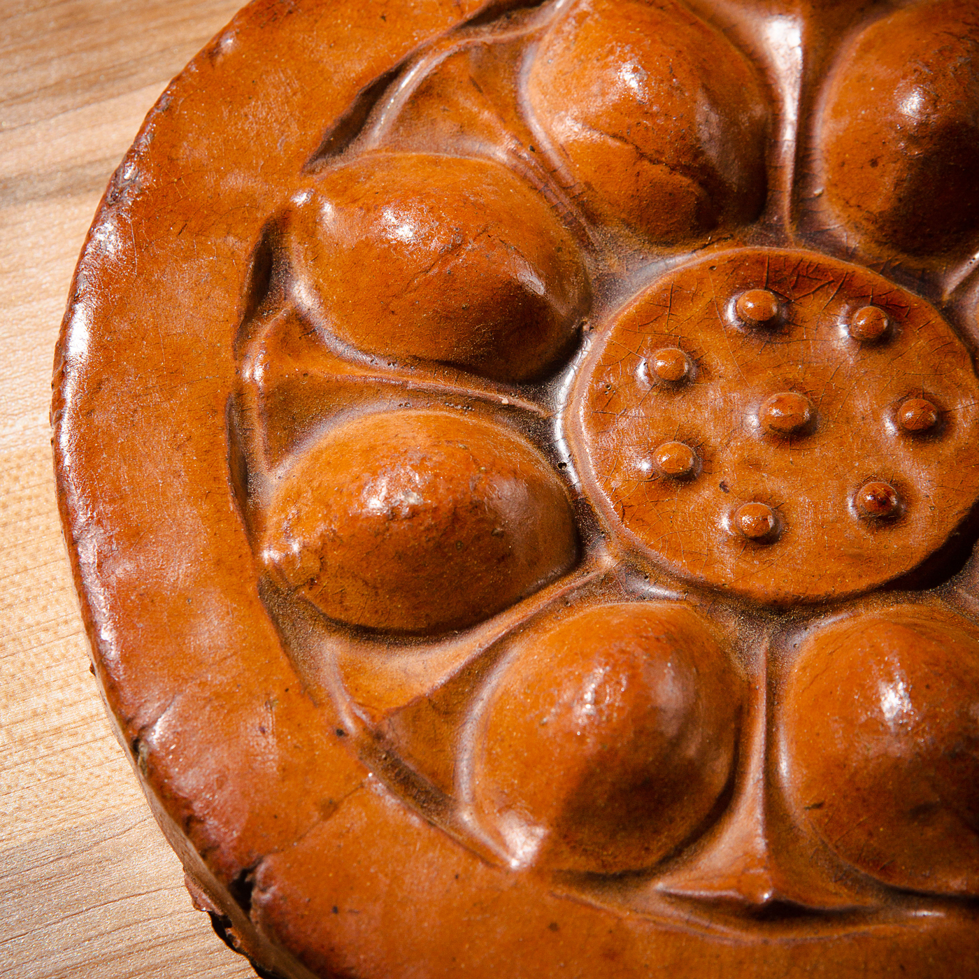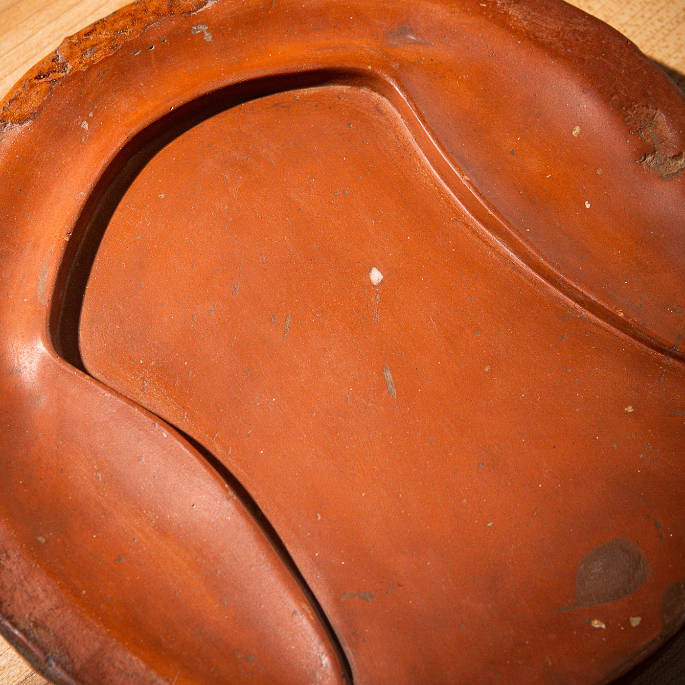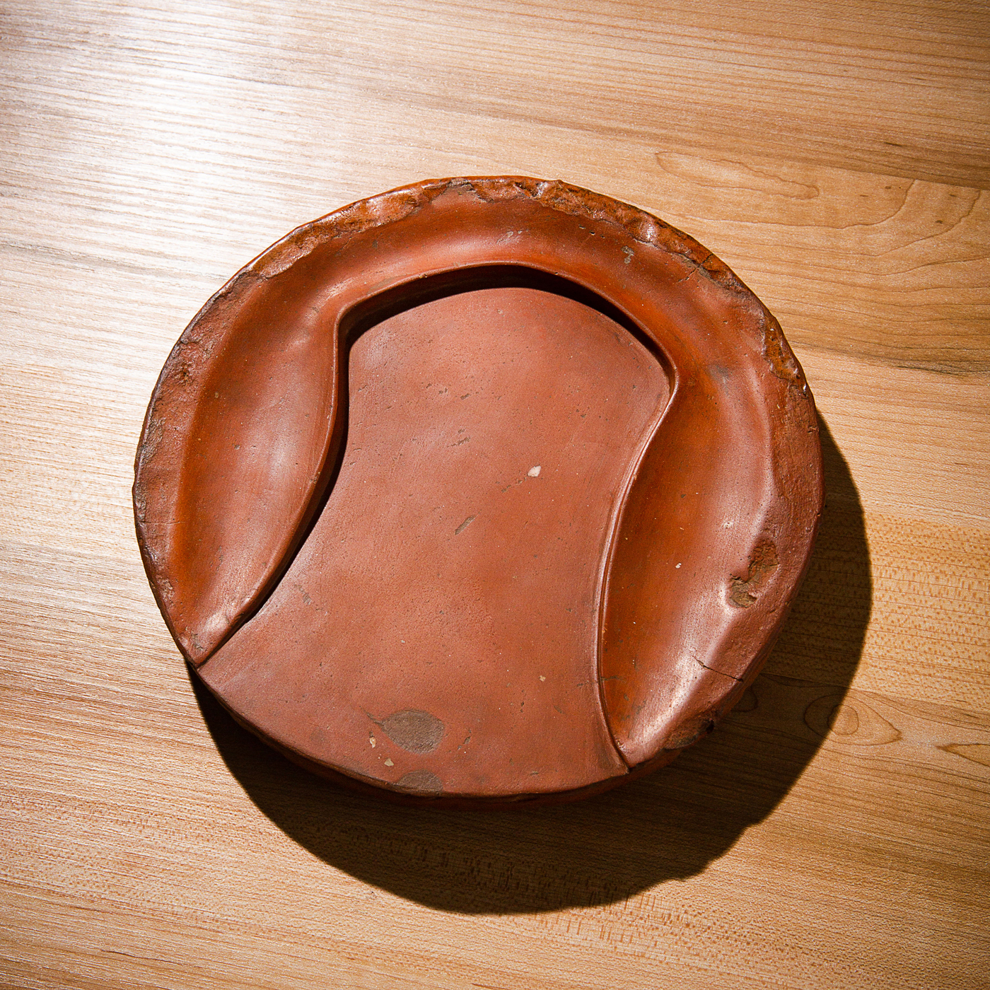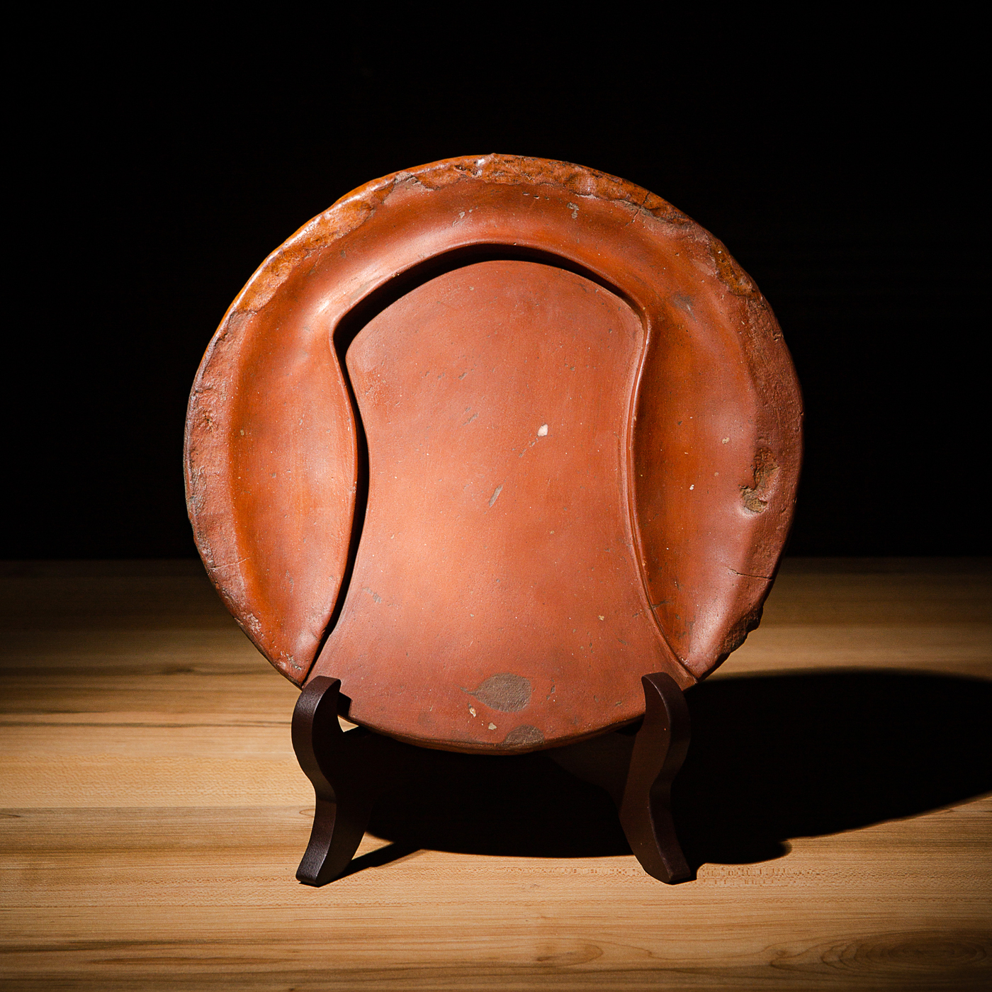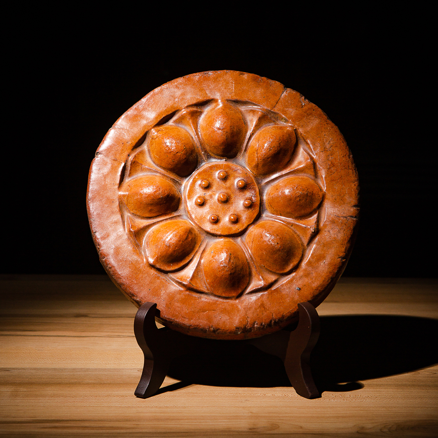 南北朝莲花瓦当制砚。此瓦当施釉,不同于常见之南北朝莲花瓦当,为稀有品种。其胎骨为红色,此色胎骨极为少见,颜色赏心悦目。瓦当之莲花图案精美绝伦,富有较强的立体感。瓦当之品相完整,十分难得。取此瓦当制砚,为稀有之珍品佳砚,不仅实用,且极具收藏价值。