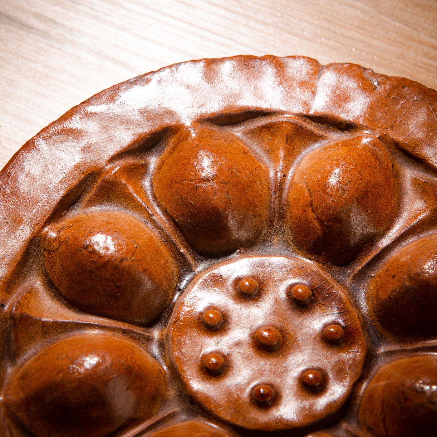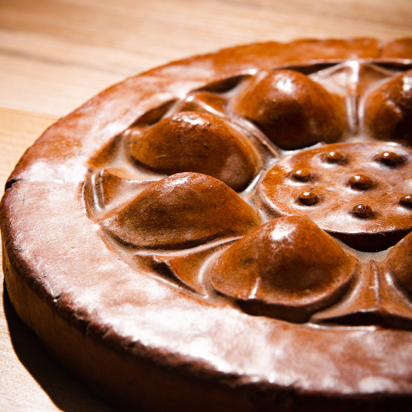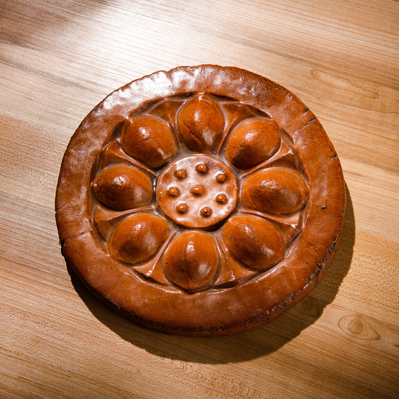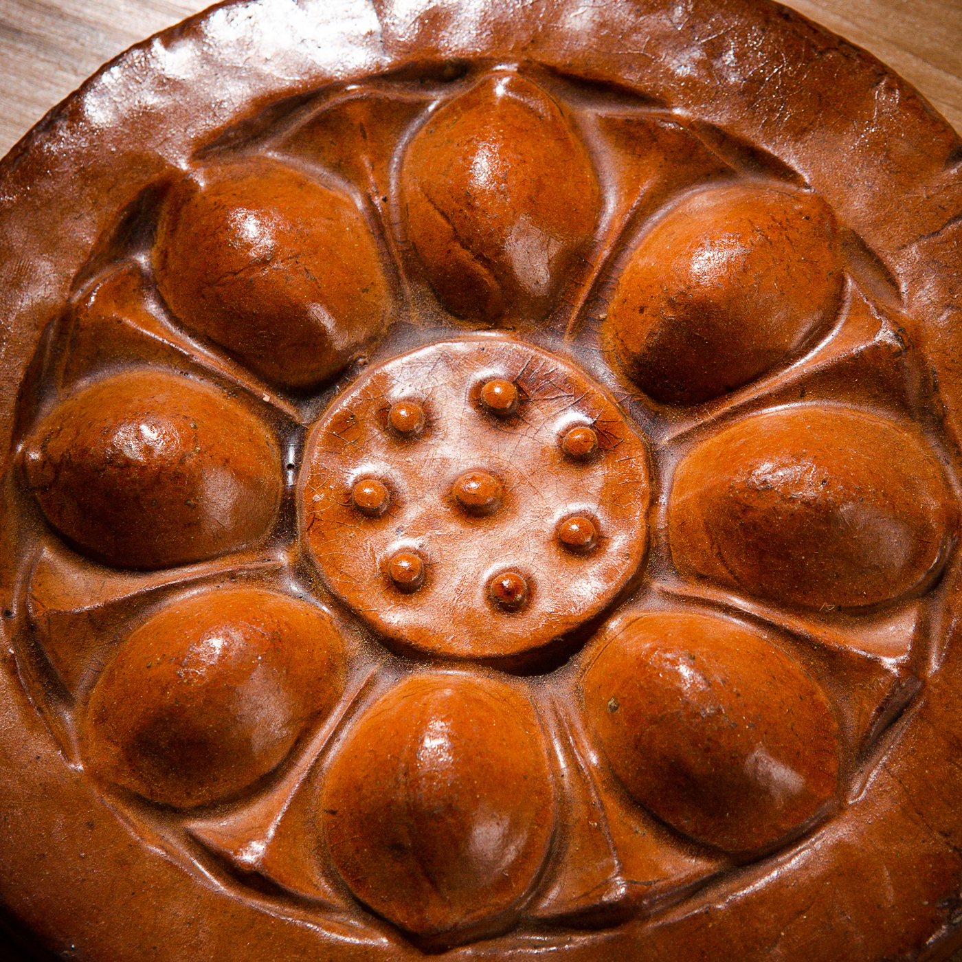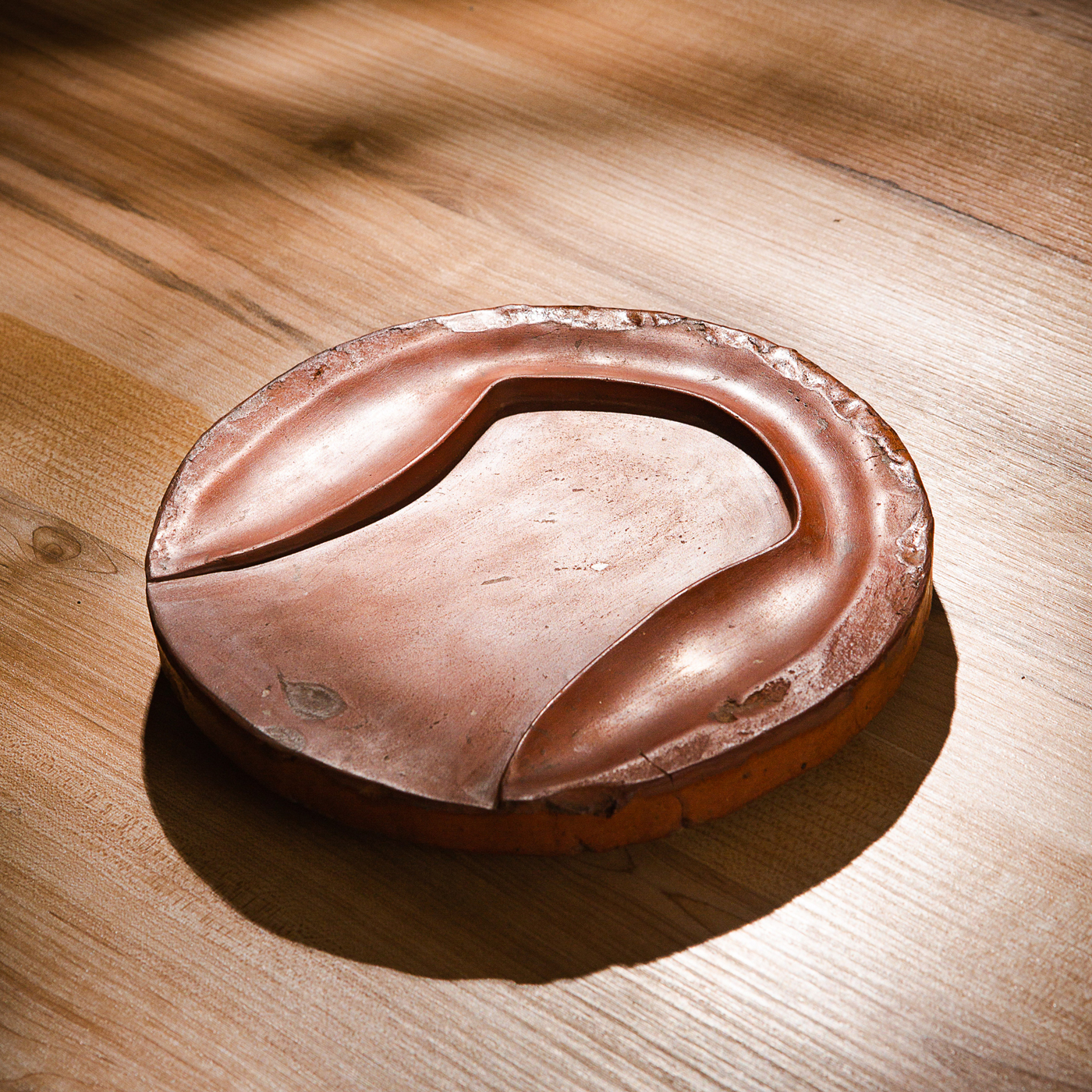南北朝莲花瓦当制砚。此瓦当施釉,不同于常见之南北朝莲花瓦当,为稀有品种。其胎骨为红色,此色胎骨极为少见,颜色赏心悦目。瓦当之莲花图案精美绝伦,富有较强的立体感。瓦当之品相完整,十分难得。取此瓦当制砚,为稀有之珍品佳砚,不仅实用,且极具收藏价值。