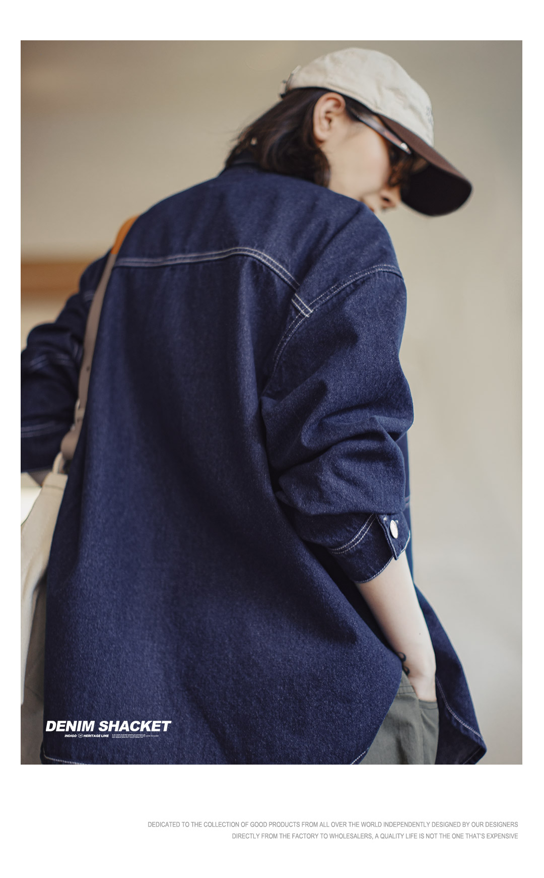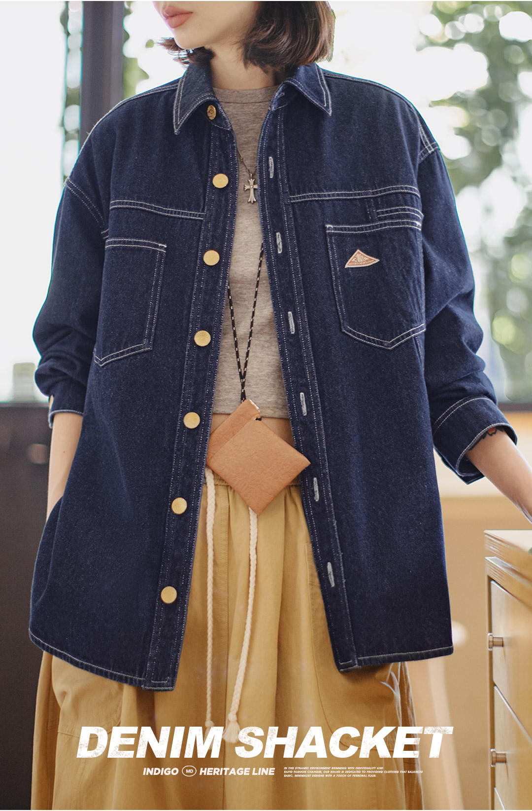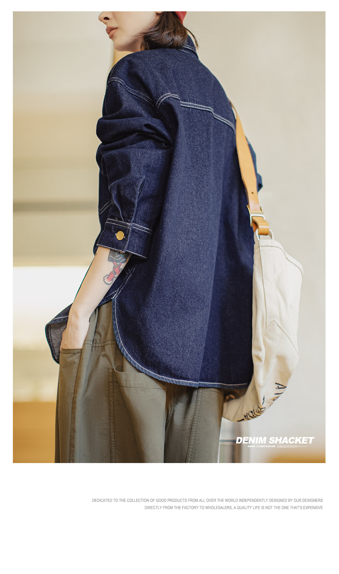 马登美式复古翻领丹宁牛仔衬衣夹克宽松长袖衬衫外套上衣女士秋季