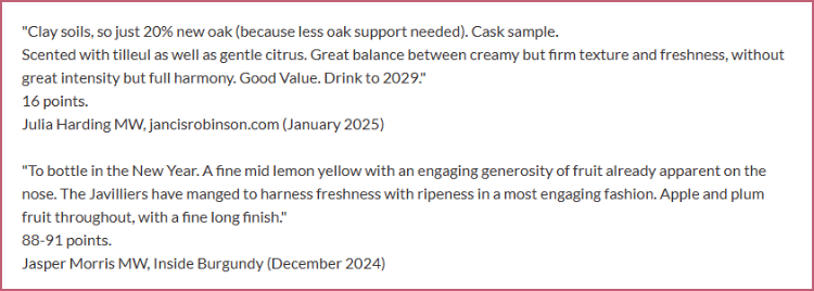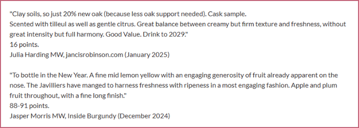 “漂亮的柠檬黄,令人愉悦的水果香气,以一种非常吸引人的方式将新鲜感和成熟度结合,苹果和李子,余味悠长。”