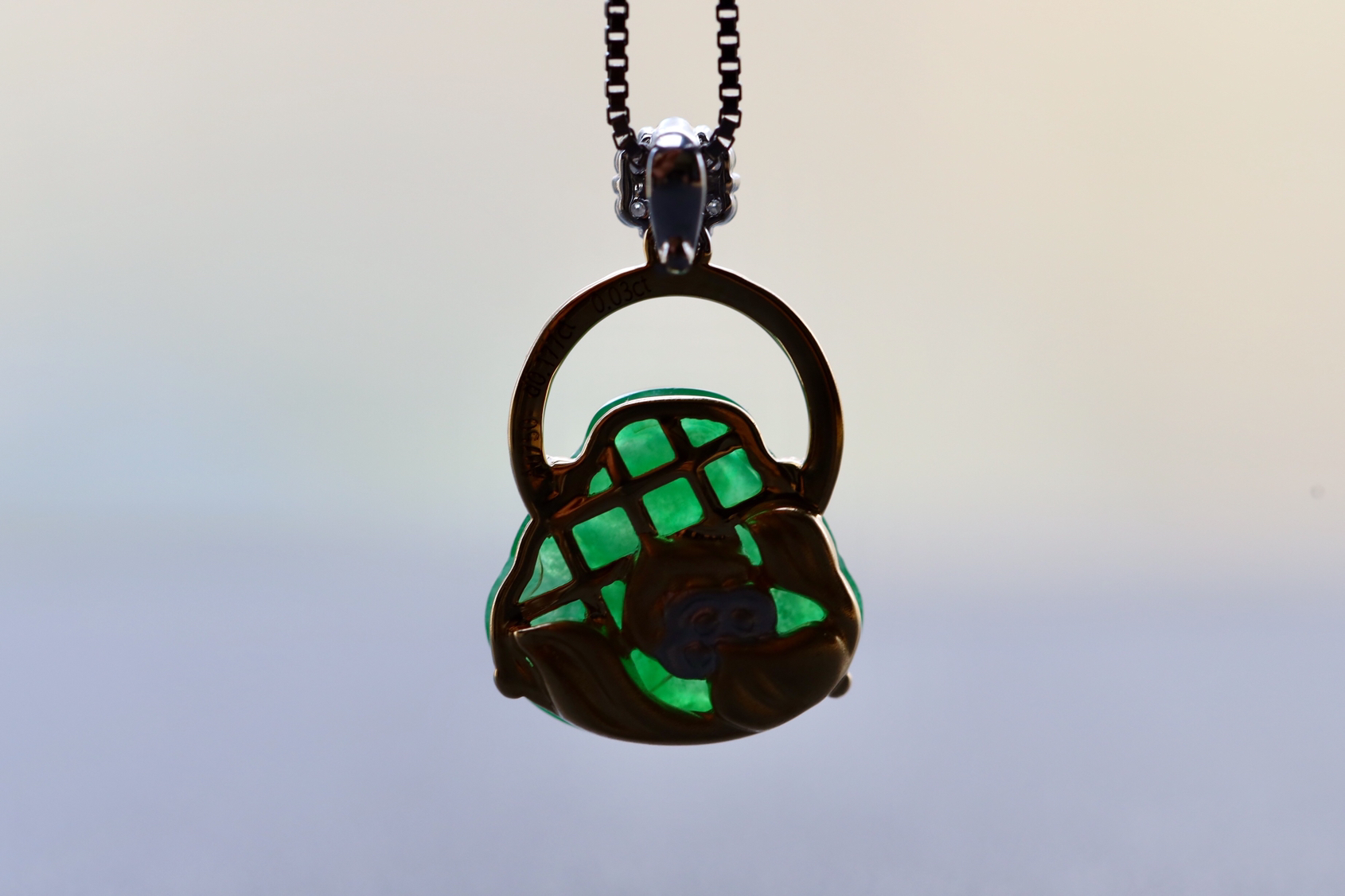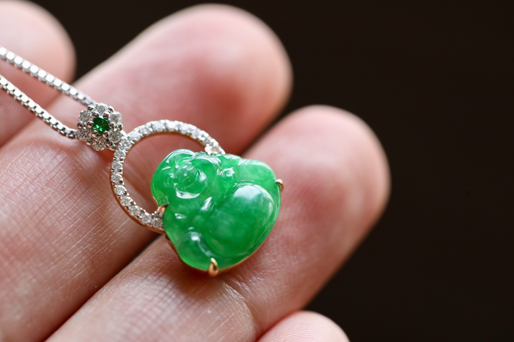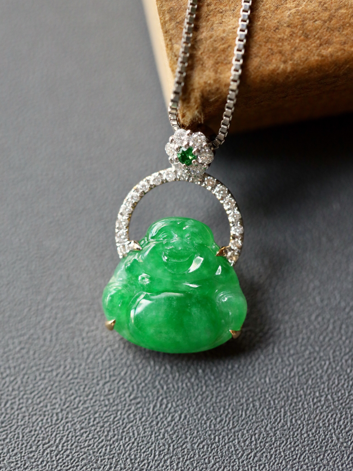 冰种阳绿满色翡翠弥勒佛18k白金钻石镶嵌,12.4×13.2×3.2mm,镶嵌后21.9×13.2×5.2mm,在寻精品小佛的,这个绝对不能错过了,冰种阳绿满色翡翠弥勒佛,18k白金钻石镶嵌,扣头点缀绿色沙弗莱石,小而强大的宝贝,阳绿色标的标本级,艳丽无比,背面的设计别有洞天,荷叶莲蓬,看看镶嵌细节有多美,正面弥勒佛保平安,背面寓意和和美美,如此精致的满绿弥勒佛,仅此一个,别无分店