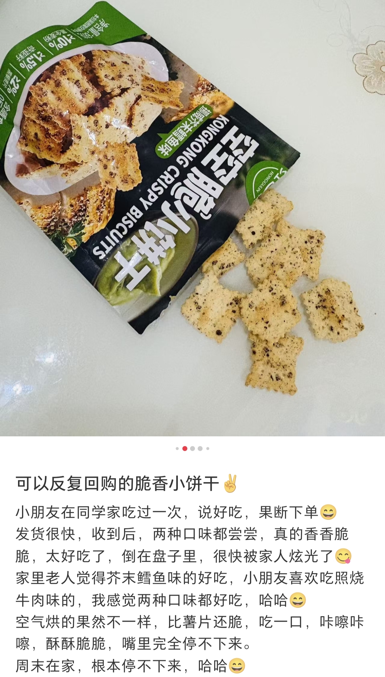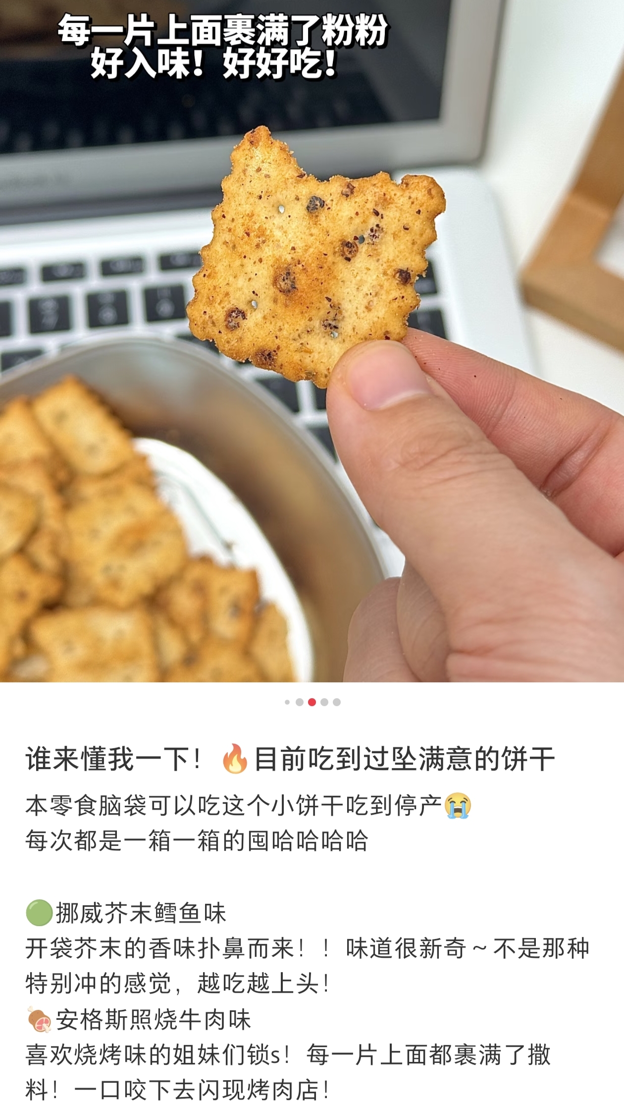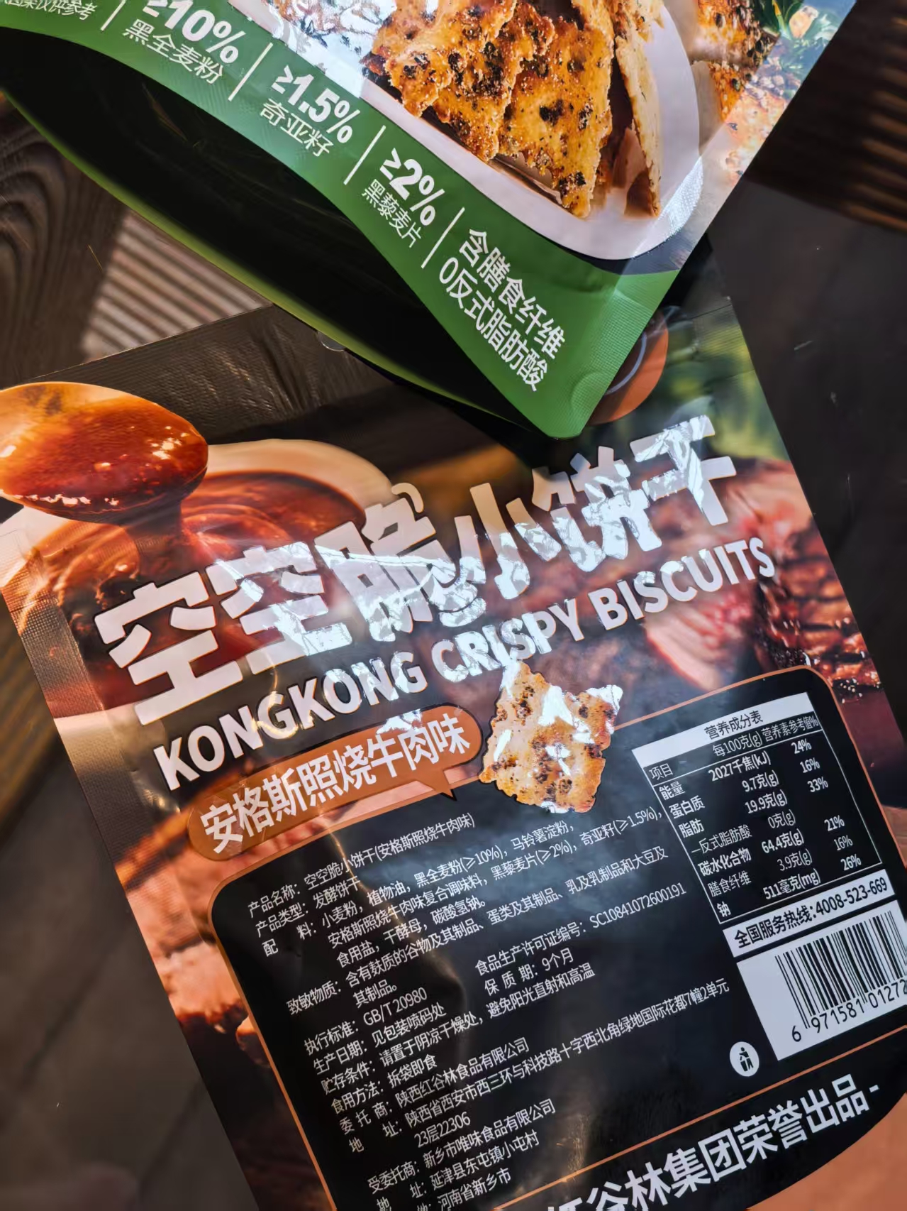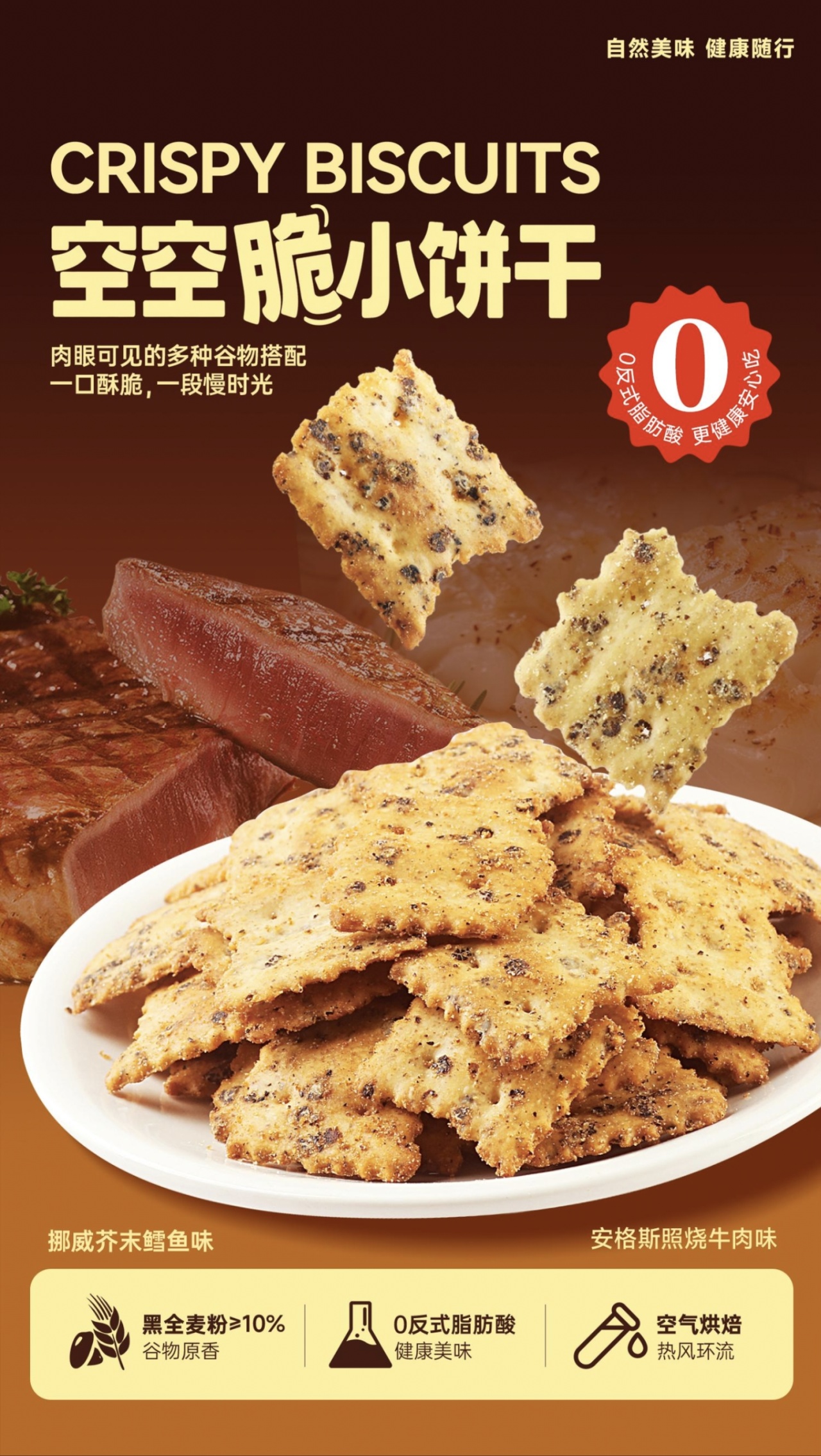 小饼干每袋68g,有两大经典口味:挪威芥末鳕鱼味,鲜辣交织着淡淡海鲜香,直冲天灵盖,很独特;安格斯照烧牛肉味,更是咸香浓郁,带着照烧的温润甜香,层层风味超有料。虽然是罪恶小零嘴,但0反式脂肪酸,整体吃起来都没什么油腻感,而且粉料非常美味,吃完一包,都忍不住舔手指!