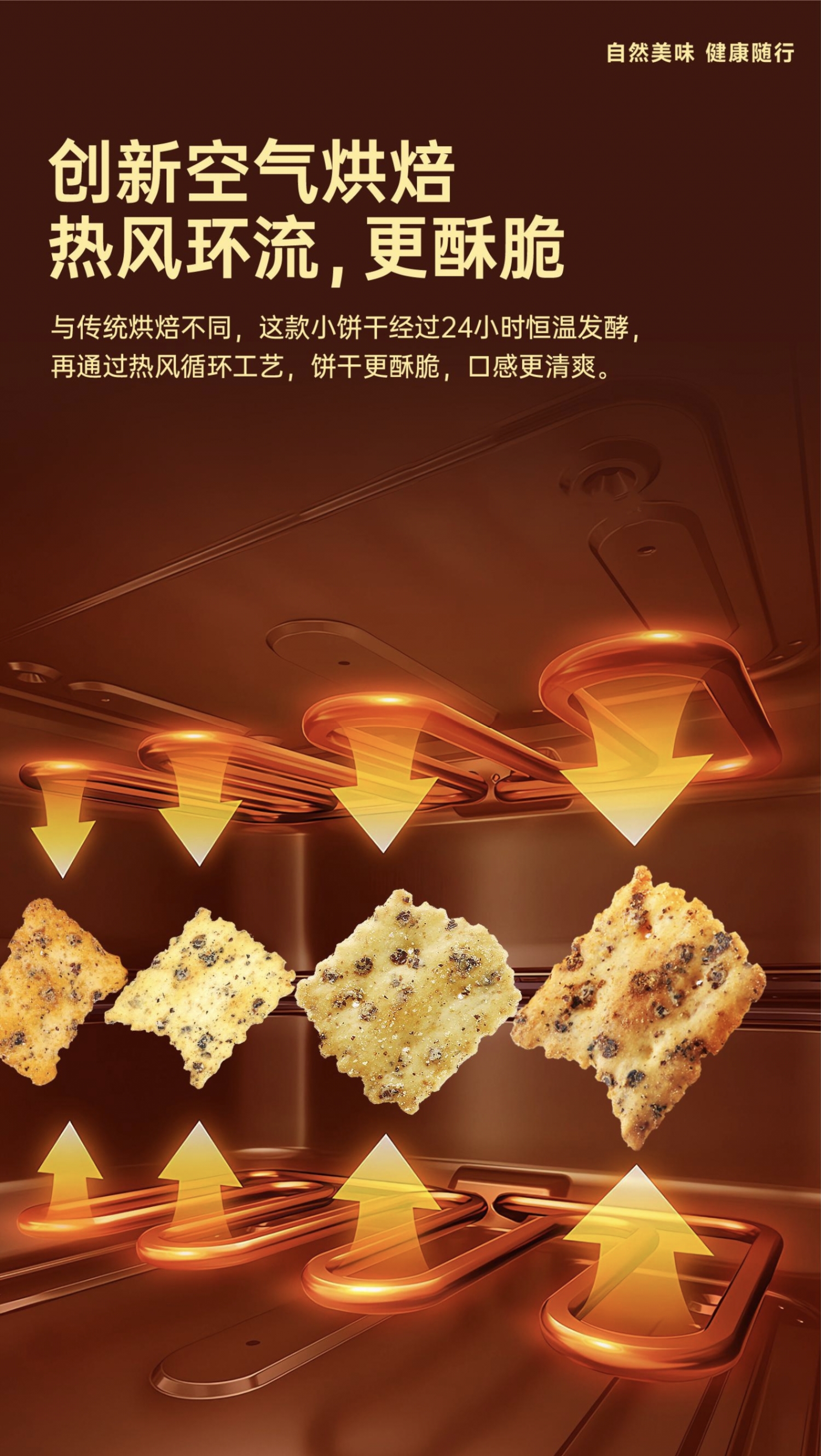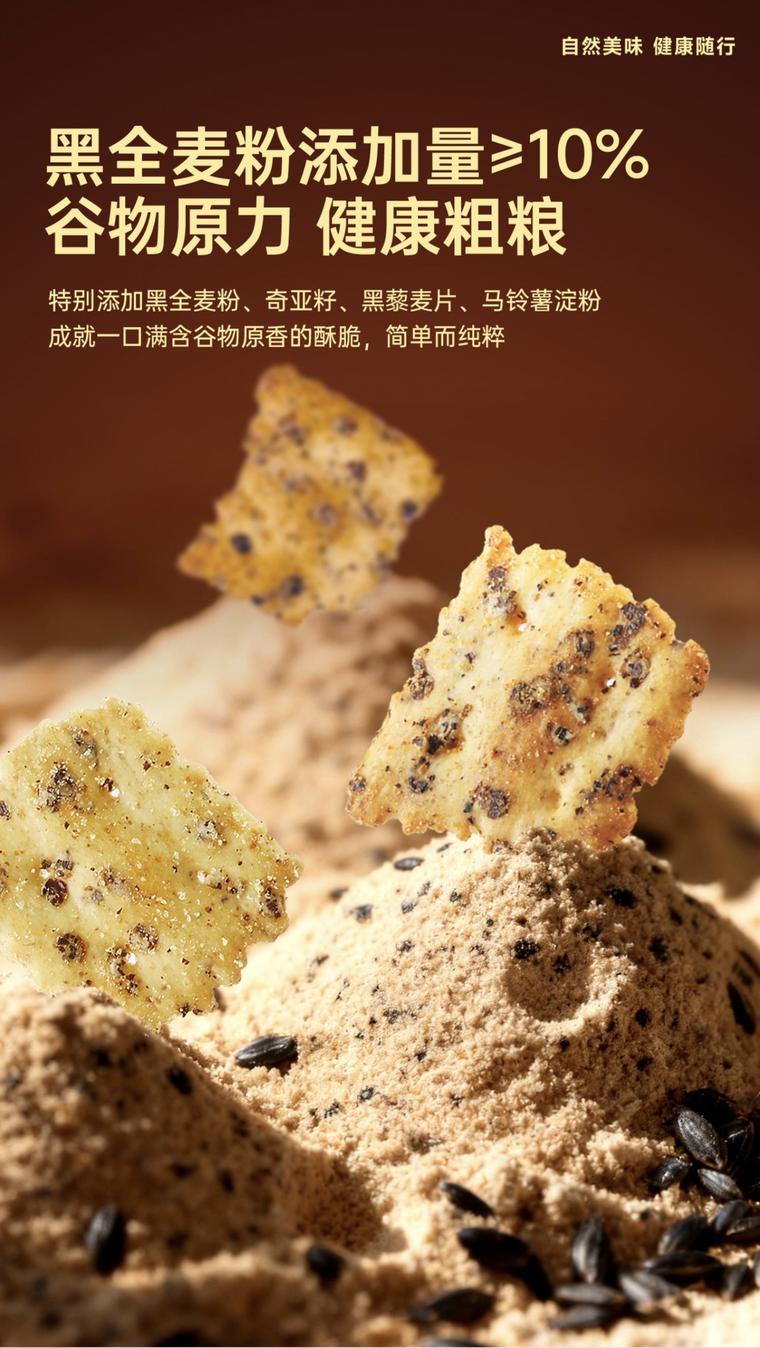 空空脆小饼干,采用24H恒温慢发酵工艺,牢牢锁住小麦的浓郁麦香,口感酥脆不生硬,咔嚓一口超解压;原料上不添加蔗糖,配料表干净清爽,黑全麦粉添加量≥10%,还搭配≥2%的黑藜麦片与≥1.5%的奇亚籽,富含膳食纤维,吃着饱腹感十足,解馋的同时还能补充谷物营养哦!