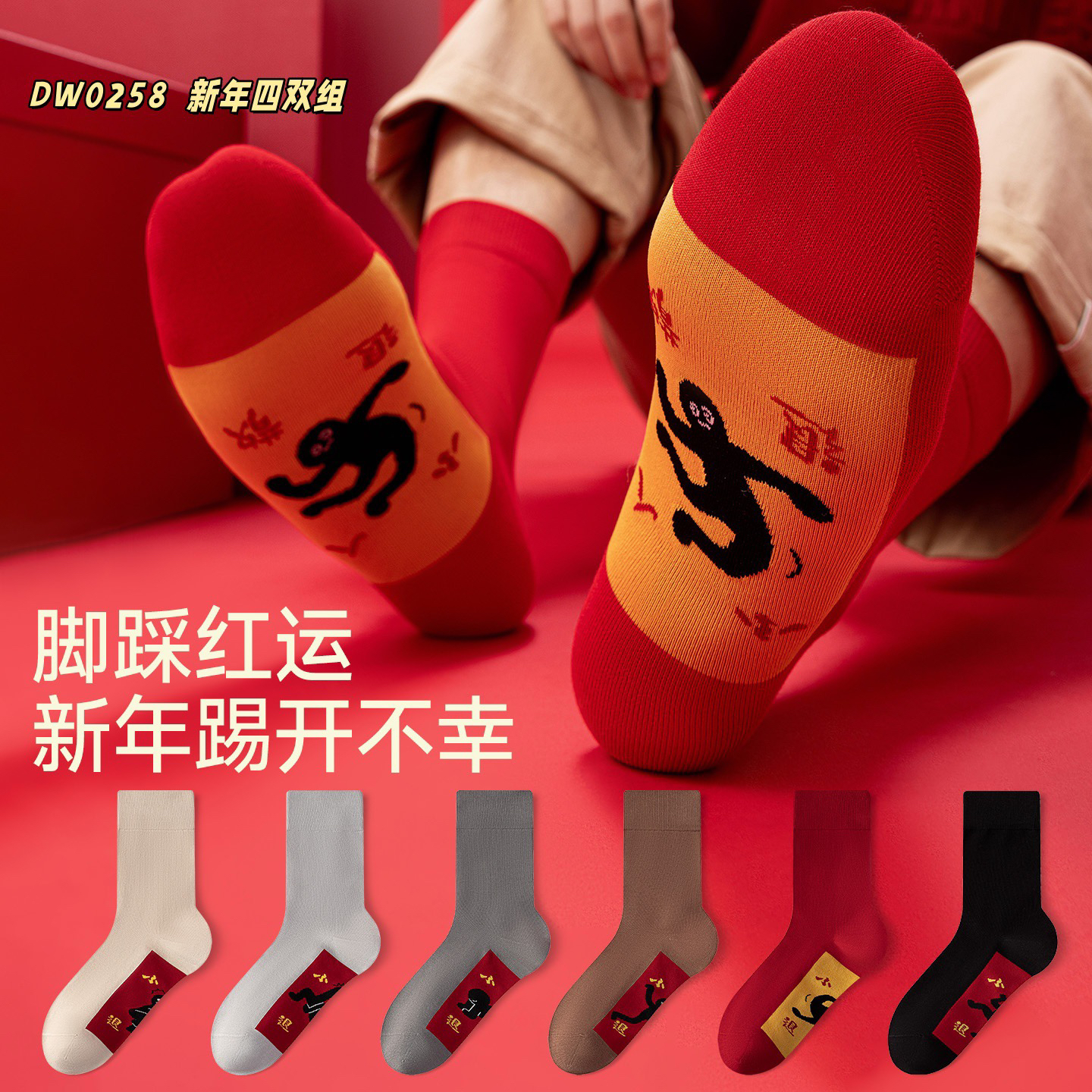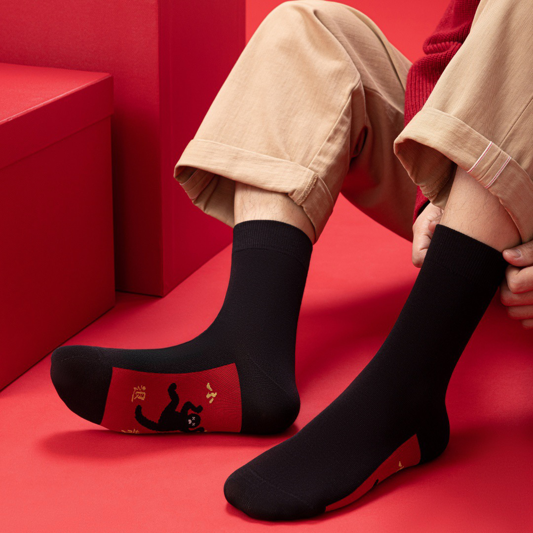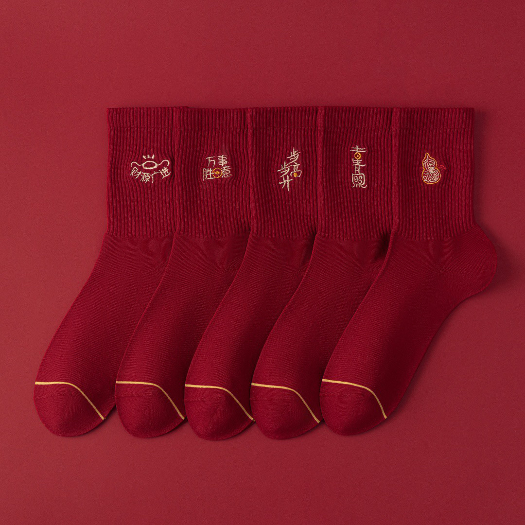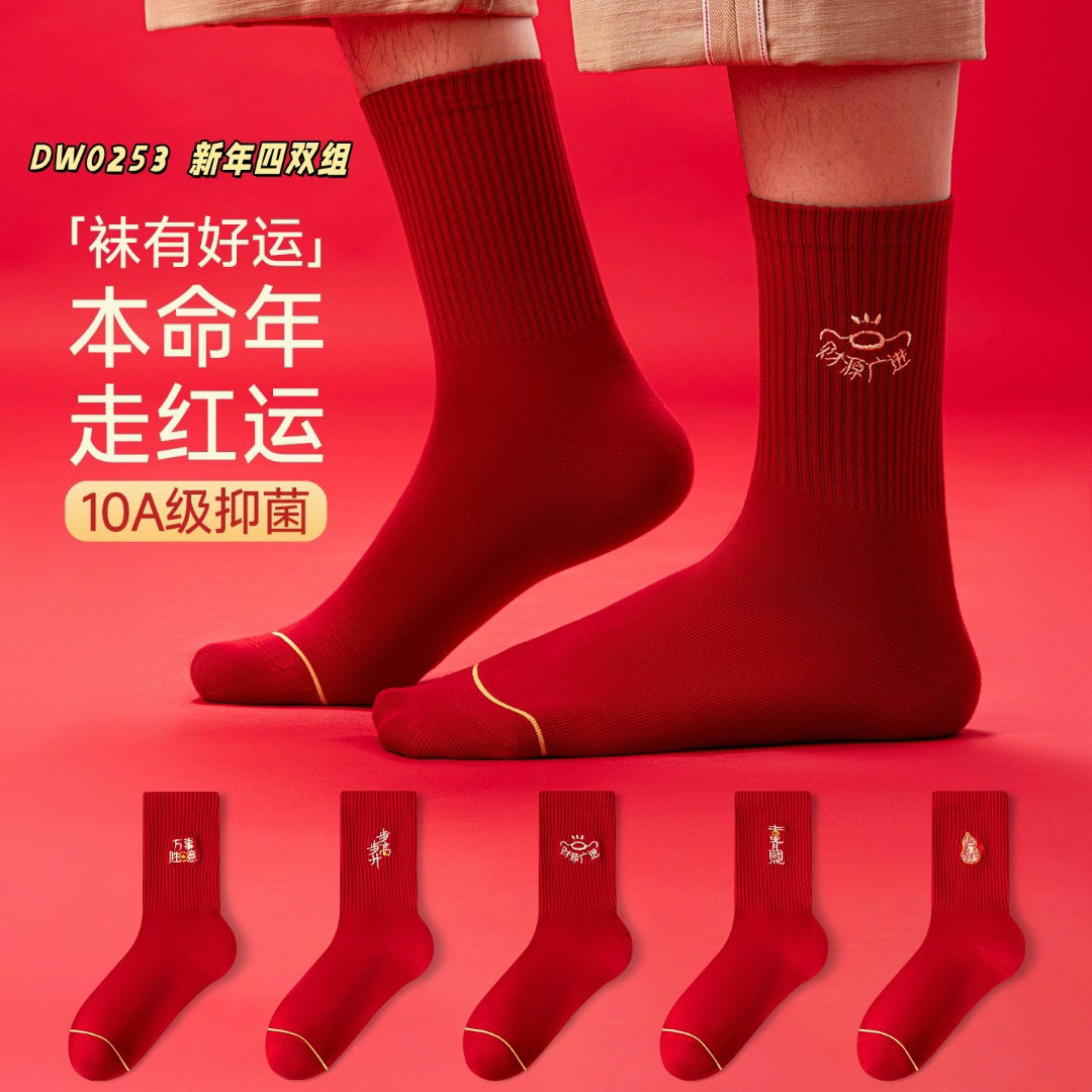4双一组!新年本命年男袜中筒袜 护你步步顺意 财源广进 步步高升精致刺绣 10A抗菌防臭 无骨一体舒适不硌脚