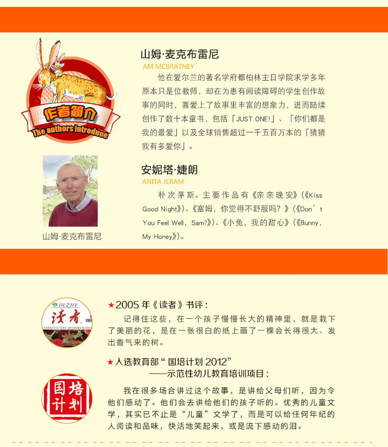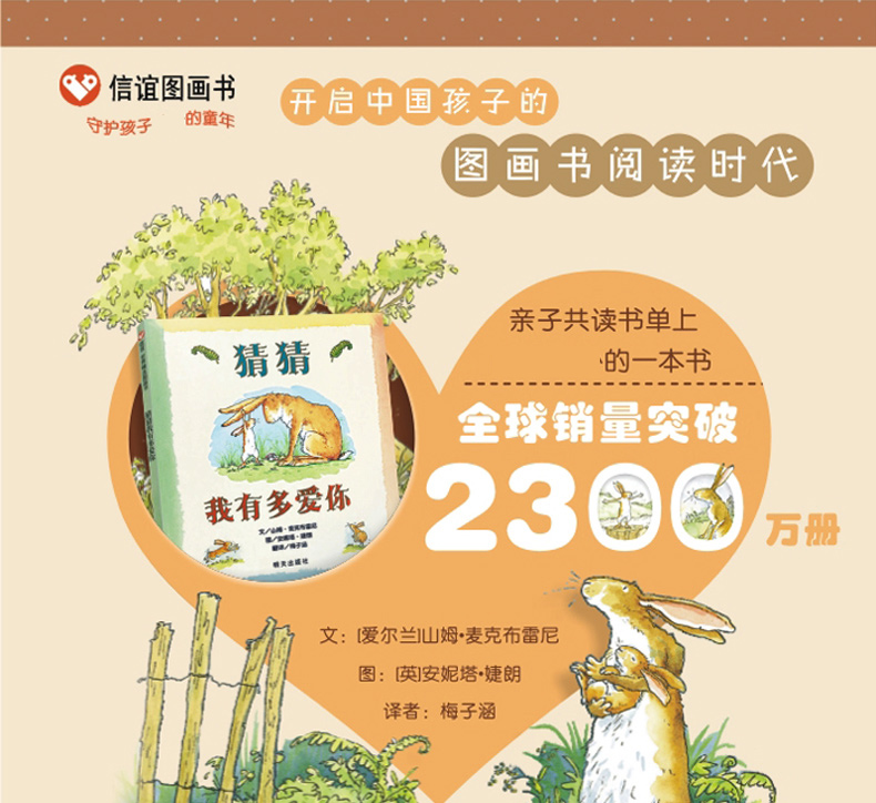 一大一小两只兔子短短的对话,浓缩生命中*复杂、也是*伟大的情感。小兔子认真地向大兔子表达“我爱你”,并用各种身体动作和看得见的静物表达自己对大兔子的爱。但不管怎么比,永远也比不过大兔子来得多、来得高、来得远。*后,小兔子终于在一片酽酽爱意的包裹下睡去了。