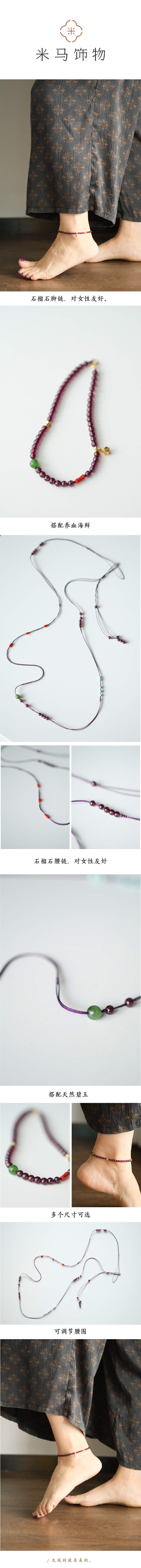 米马饰品 石榴石珊瑚碧玉脚链 银镀金簸箕纳福链 气血润行 好运随身
