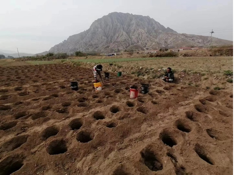 这是利峰发明的打洞施肥法,用打洞机打好直径30厘米深40厘米的洞,挑羊粪倒进去,一桶粪倒3个坑,1000个坑,需要挑300桶,150担。每个洞还要施一瓢麻饼肥。
