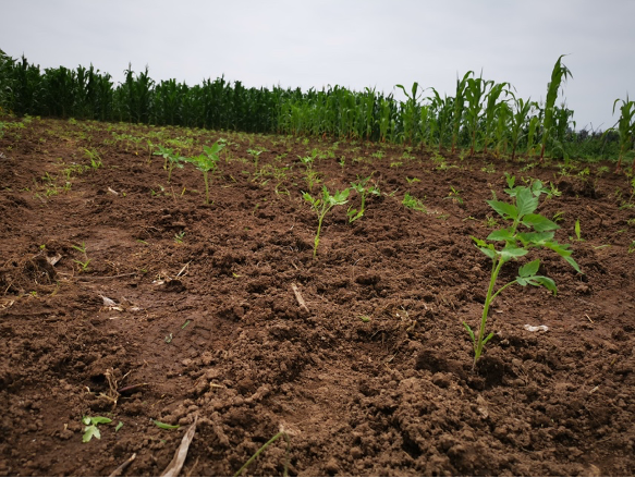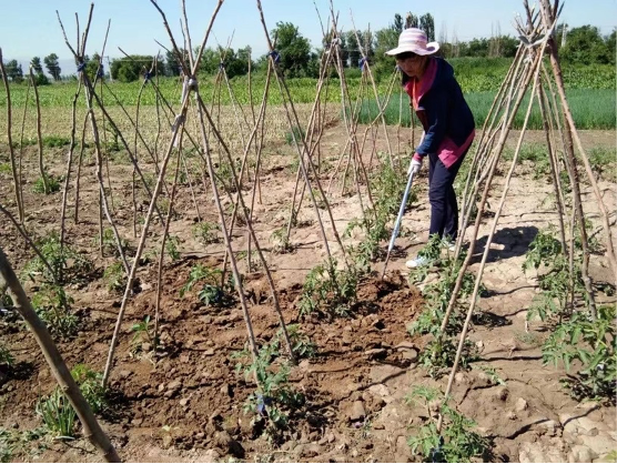 小苗长高后插杆、绑枝、打岔,杂草很多,需要锄好几遍,这是一项和杂草赛跑的游戏!