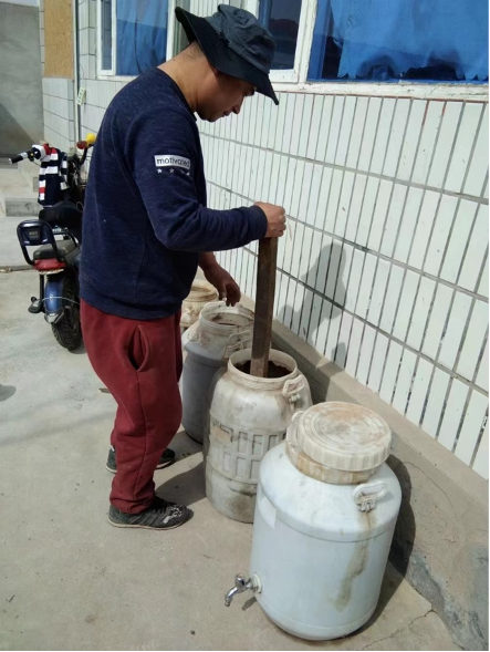 我们用的自家羊粪,经过发酵才施用,麻饼泡水发酵,两种肥一起上,一勺麻饼肥,一锹羊粪,给西红柿足够的营养。