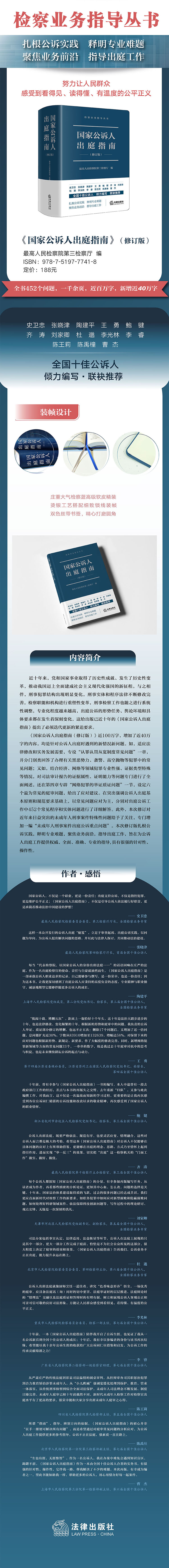 每当“代表检察院,以国家公诉人的身份出席法庭……”的话语回响在庄严的法庭,作为一名出庭检察官的使命、责任与自豪就油然而生。《国家公诉人出庭指南》是一部承载公诉人职业追求的记录,自己能够参与撰写,是一份荣幸,也是一份责任;因为这本书,让我更深切感到了出庭公诉人应秉持的高度负责的态度、专业精神与职业操守,诚恳地期望它能够伴随更多公诉人的成长。