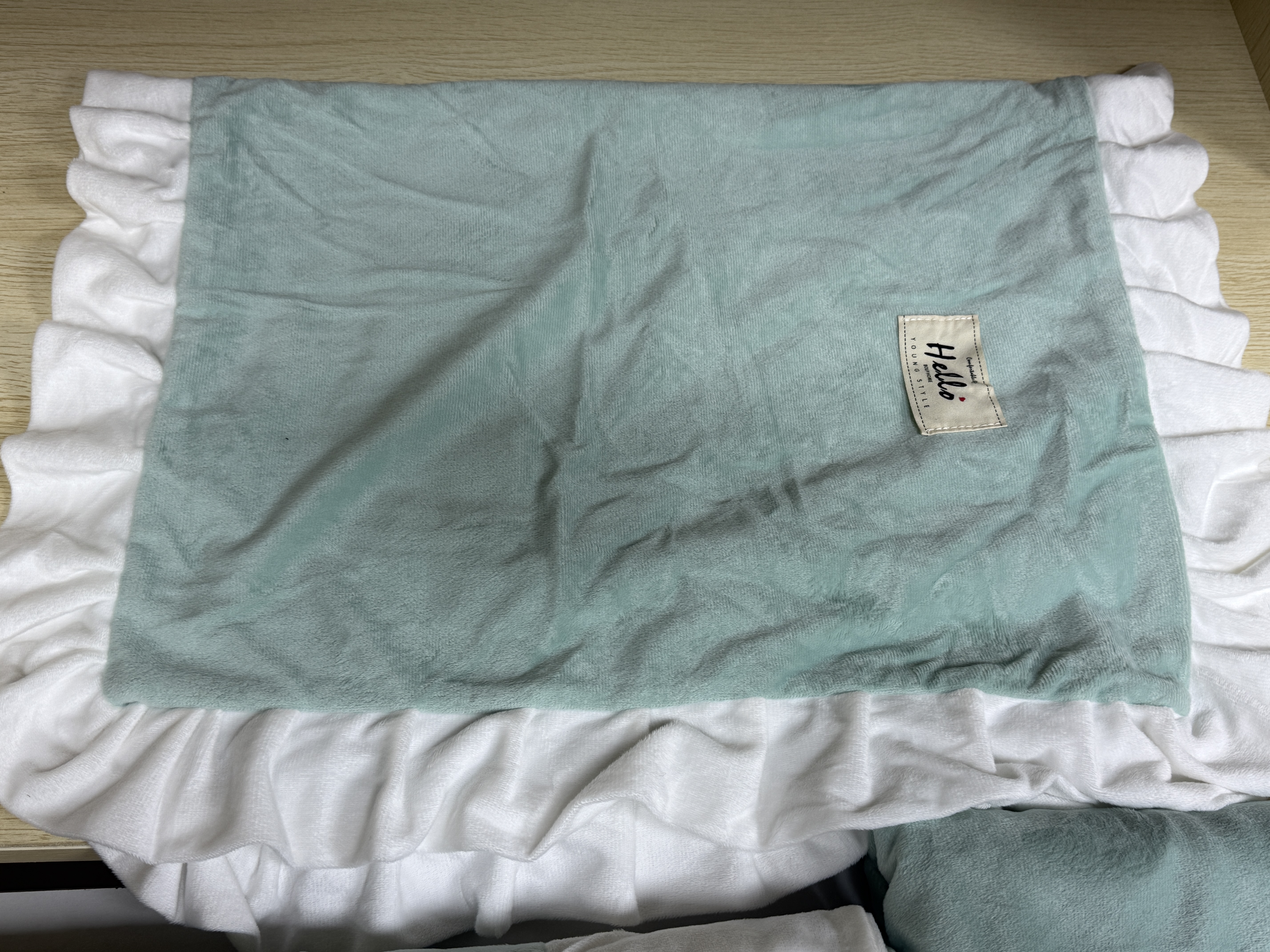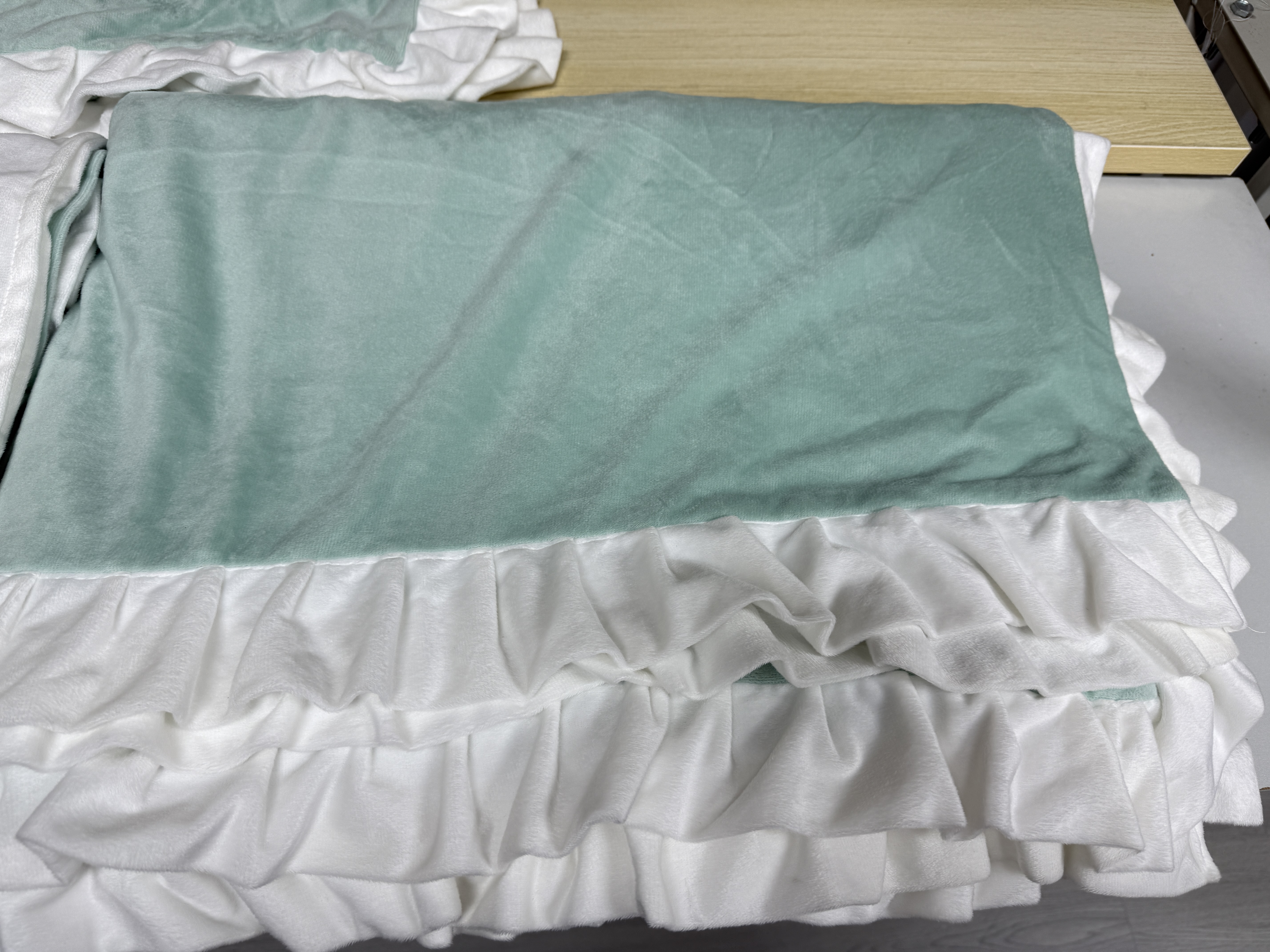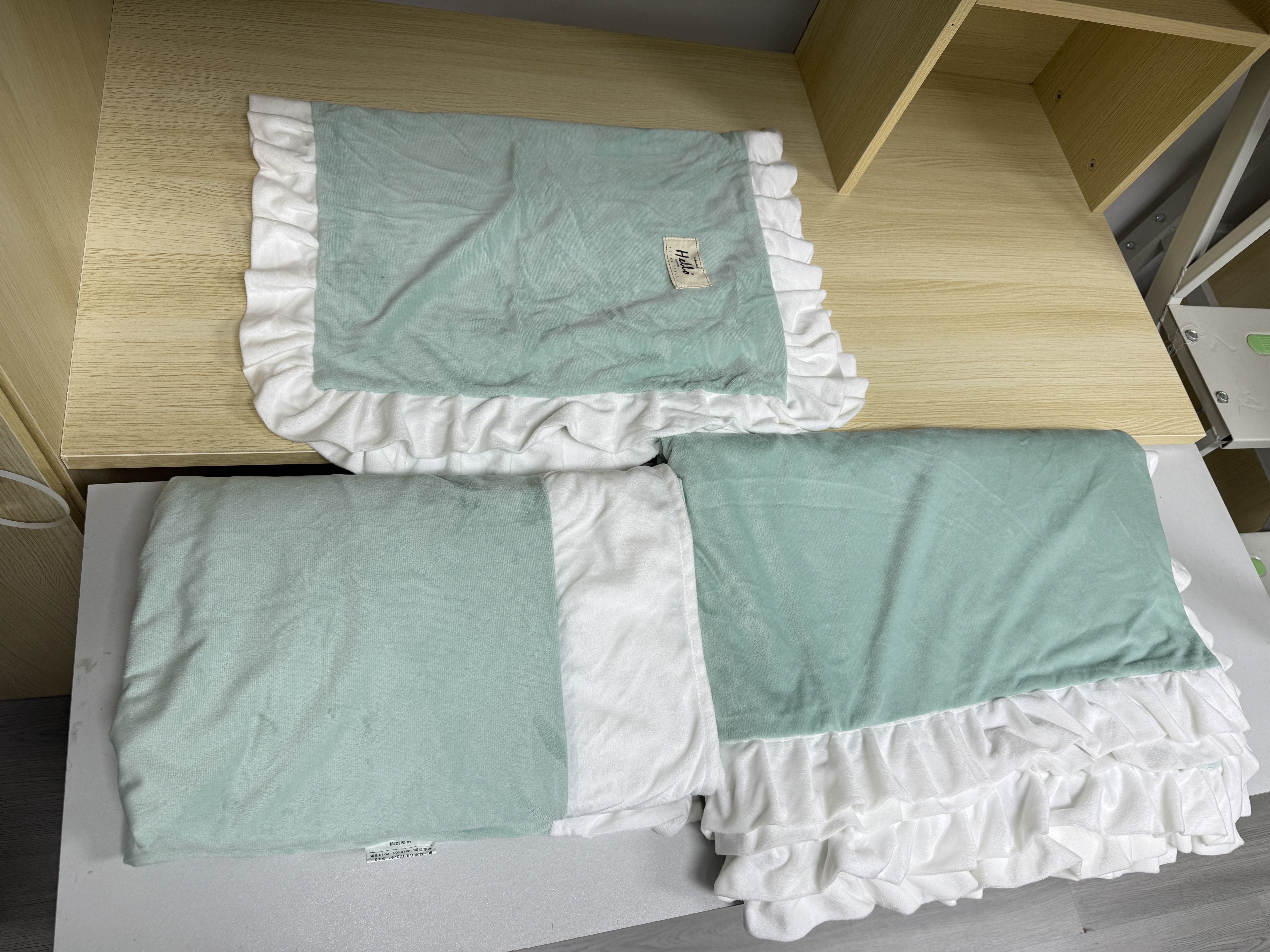 浅蓝绒面三件套:床单*1、被套*1、枕套*1,带白色荷叶边