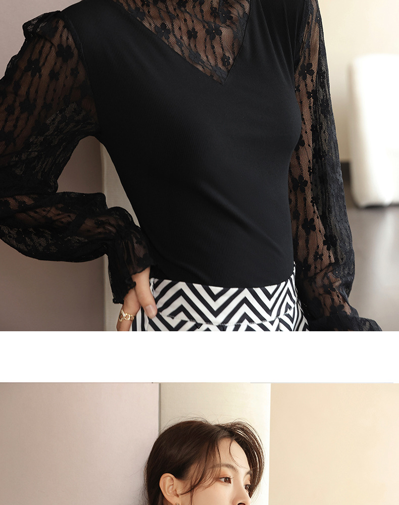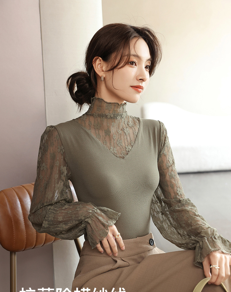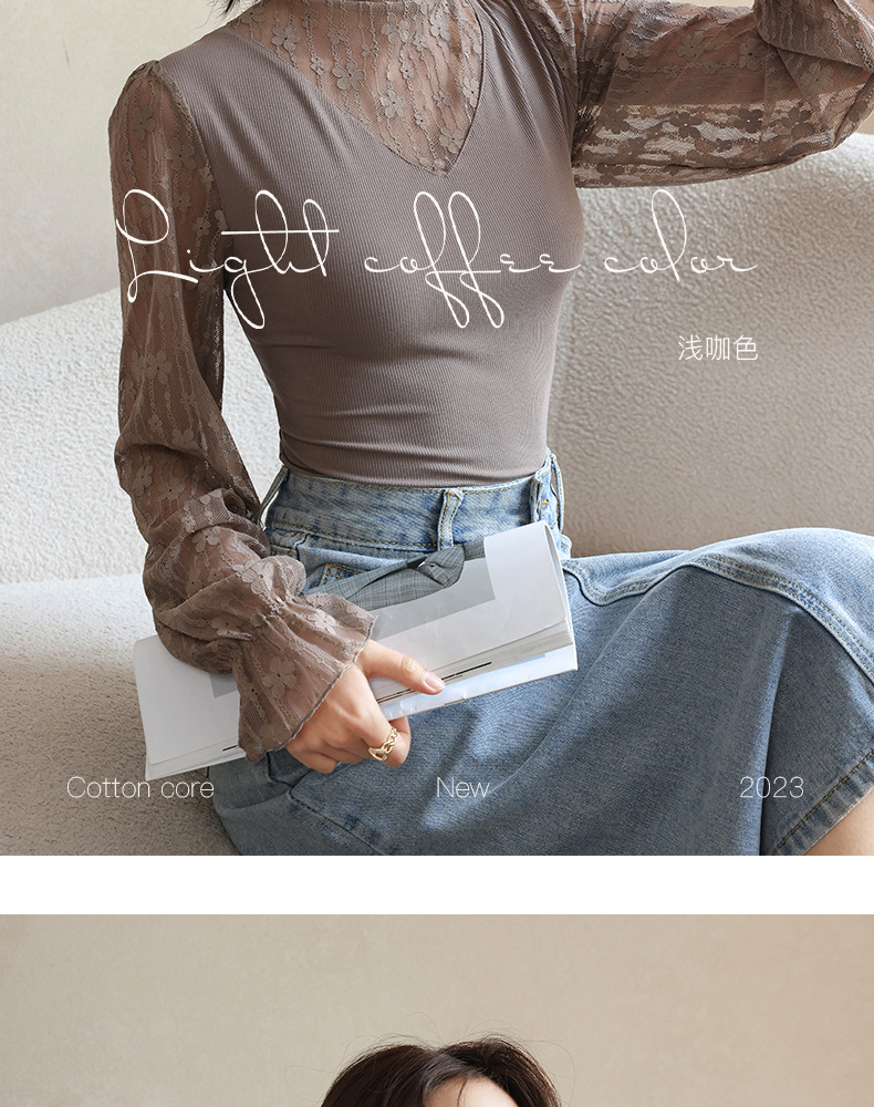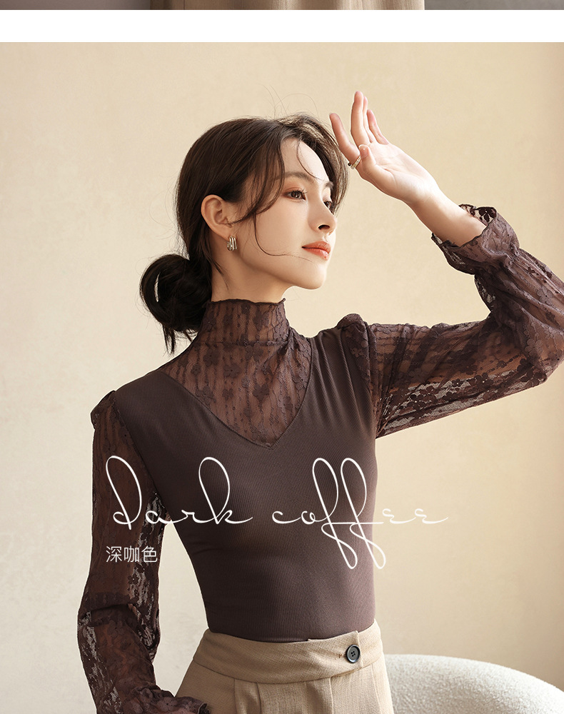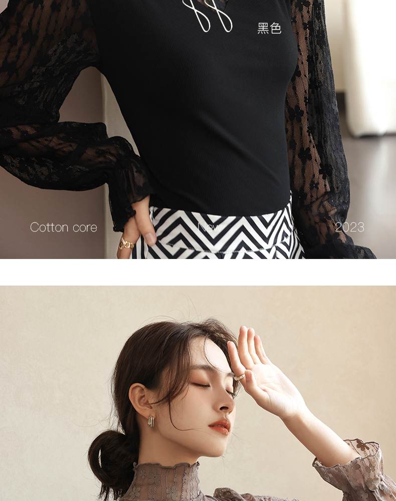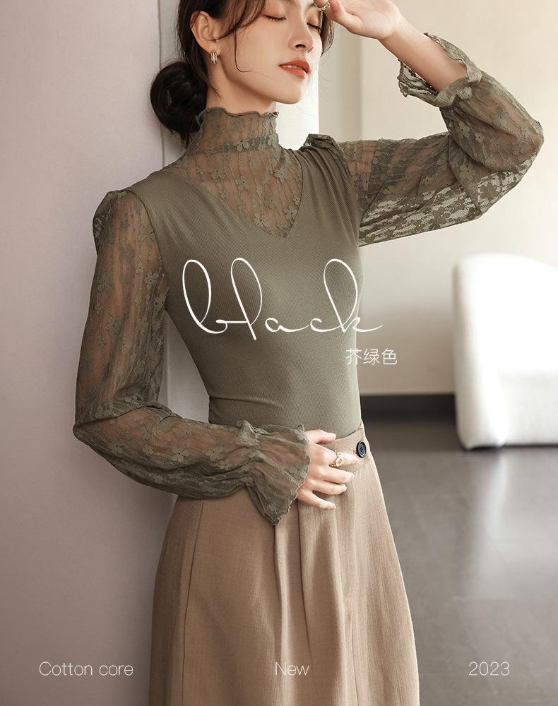 网纱蕾丝打底衫女2024新款春秋款内搭修身洋气长袖上衣简约洋气气质百搭体恤衫