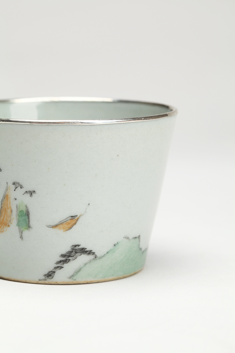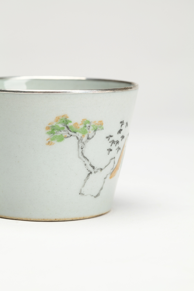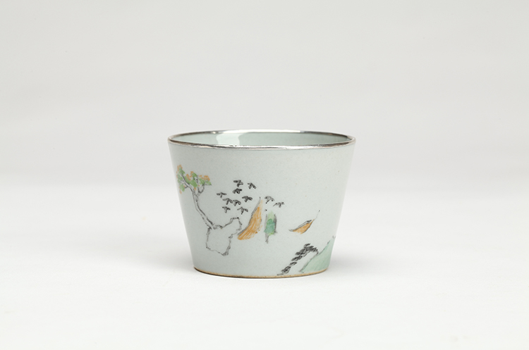 《尘外》仿古灰釉彩绘主人杯,作品儒雅文气,树木、赏石,陈如冬的作品总是有一种魔力,让人不自觉的身临其境,心静下来,漫步其中。画面寥寥数笔,江南文人气息沉浸其中。
