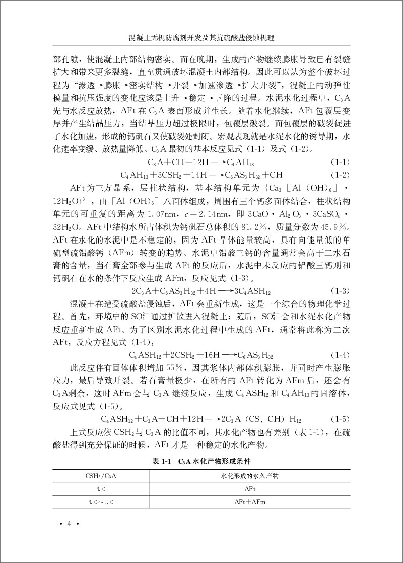 第6章量化了掺有复合防腐剂的水泥基材料受SO2-4侵蚀后的界面变化,阐述了复合体系对混凝土界面区的改善作用,揭示了水泥浆与骨料界面是混凝土硫酸盐侵蚀的主要侵入通道,论证了复合粉体的加入有助于降低界面结晶取向性,削弱界面效应,增加混凝土密实度。