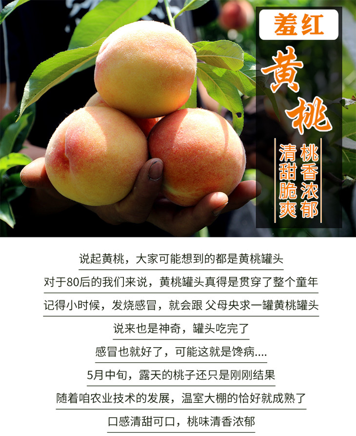 五月大棚里的黄桃抢先上市,口感清甜爽口,多汁味美,桃味浓郁香气十足;可以脆着吃 也可以放软了吃,还可以DIY做美味的黄桃罐头哦~