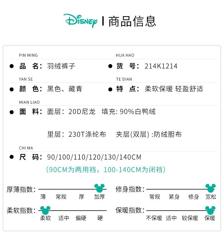 迪士尼男童羽绒裤宝宝冬装新款儿童白鸭绒长裤保暖加厚潮214K1214
