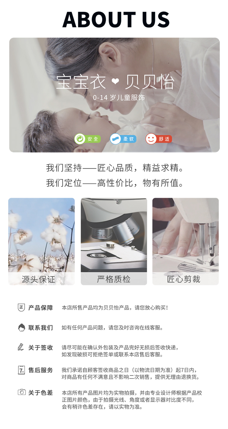贝贝怡专注0-6岁婴幼儿服饰,坚持安全、柔软、舒适的产品理念,为千万中国家庭提供超高品质、安全可靠的婴幼儿服饰产品,妈妈放心,宝宝开心!