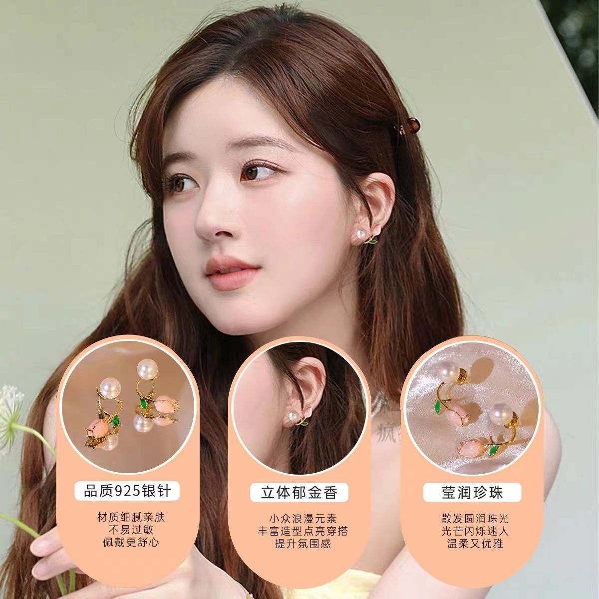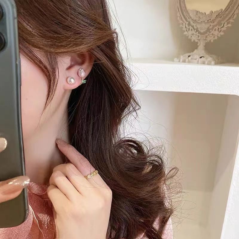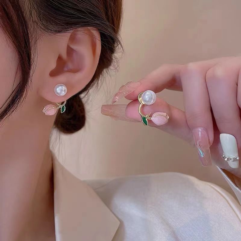 郁金香耳钉两戴后挂式粉色花朵耳环夏天小清新s925银针珍珠耳饰女