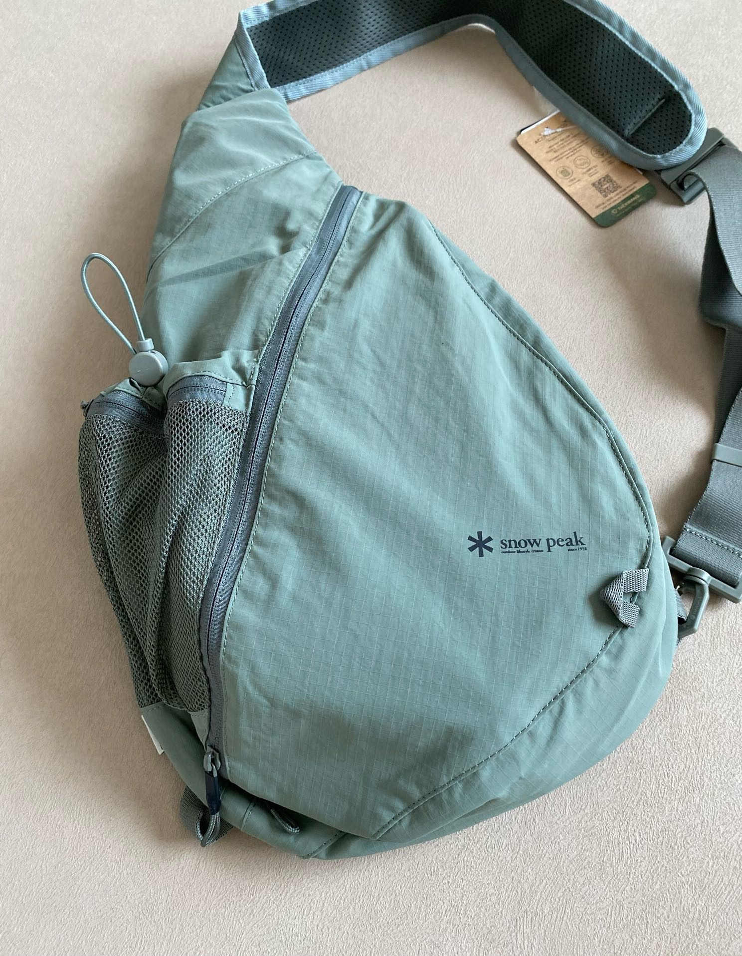 环保材质的尼龙面料制作,耐用性好,生活防水的斜挎包。休闲的设计,以网状口袋设计为亮点,在日常生活和轻度户外活动时,便于存放随身物品!