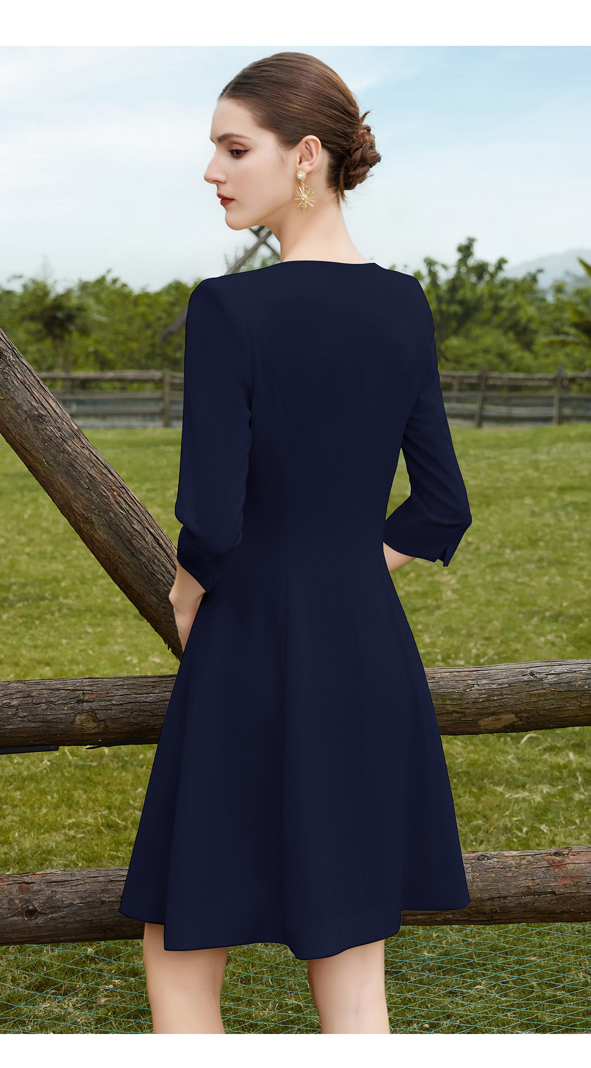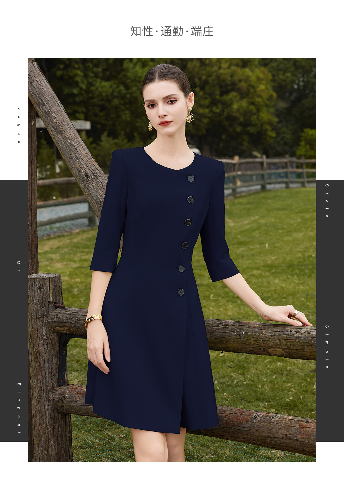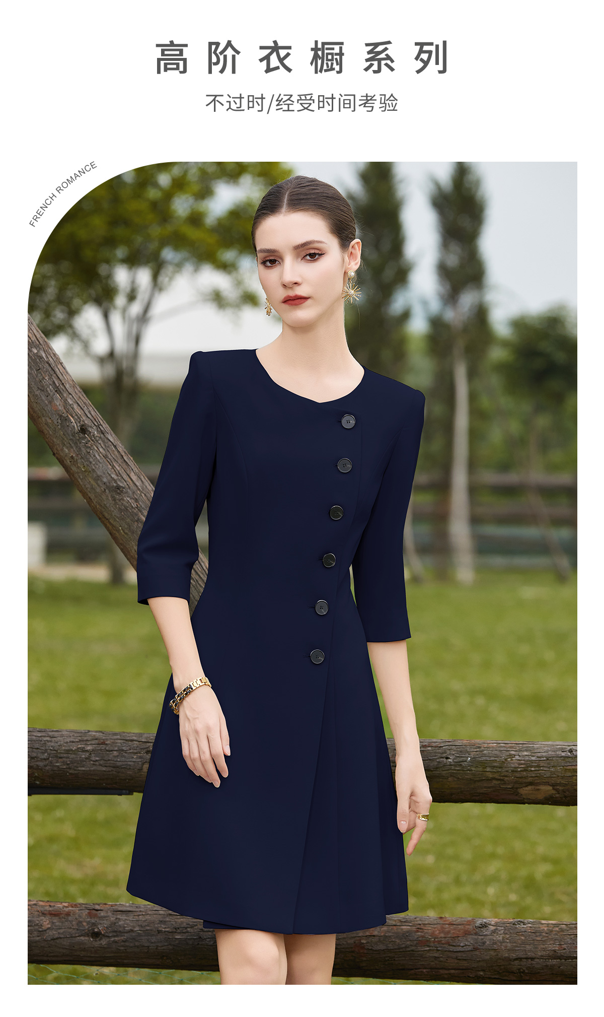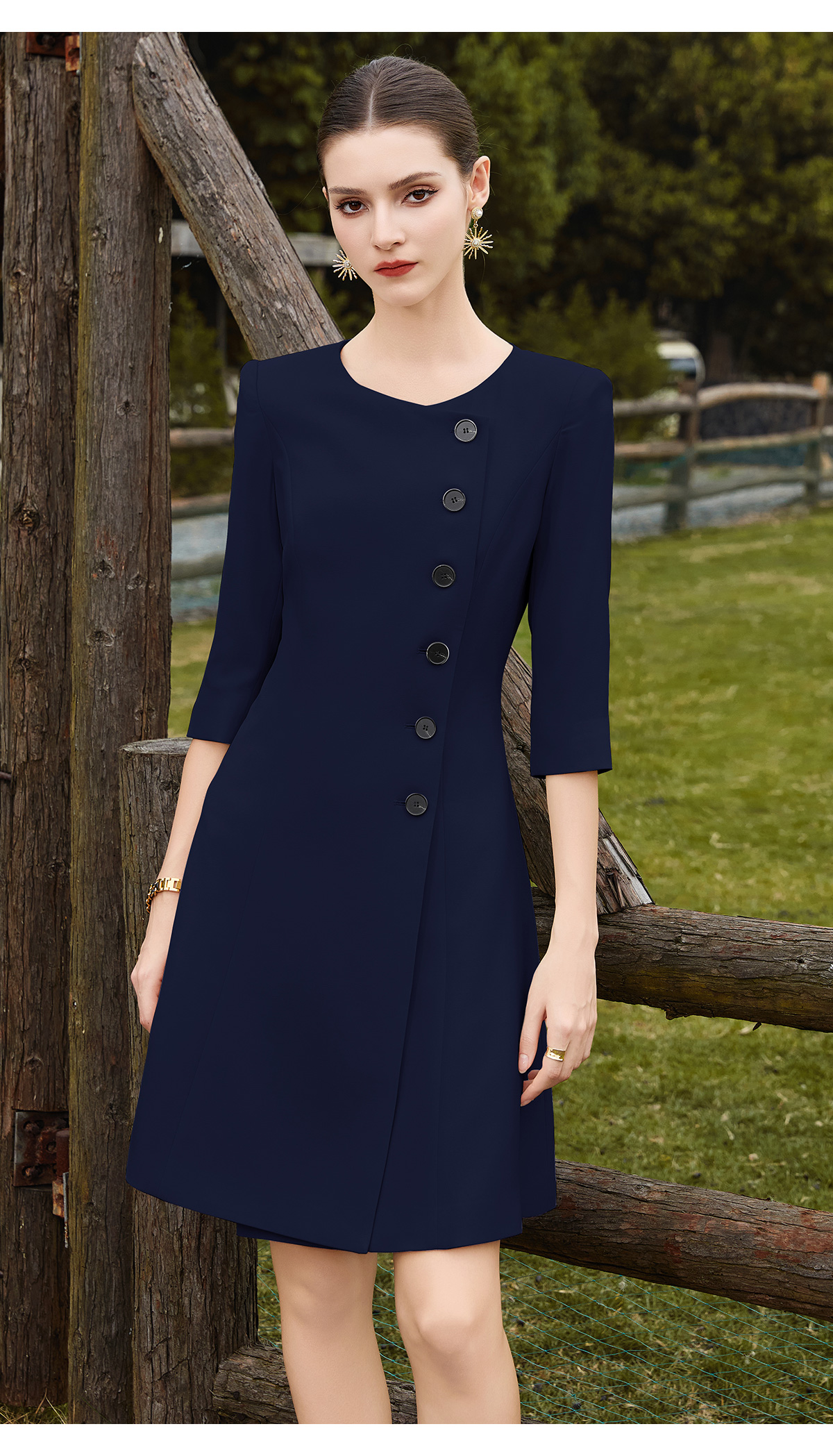 AD职场通勤米色圆领连衣裙女气质中长款大摆a字裙单排纽扣西装裙