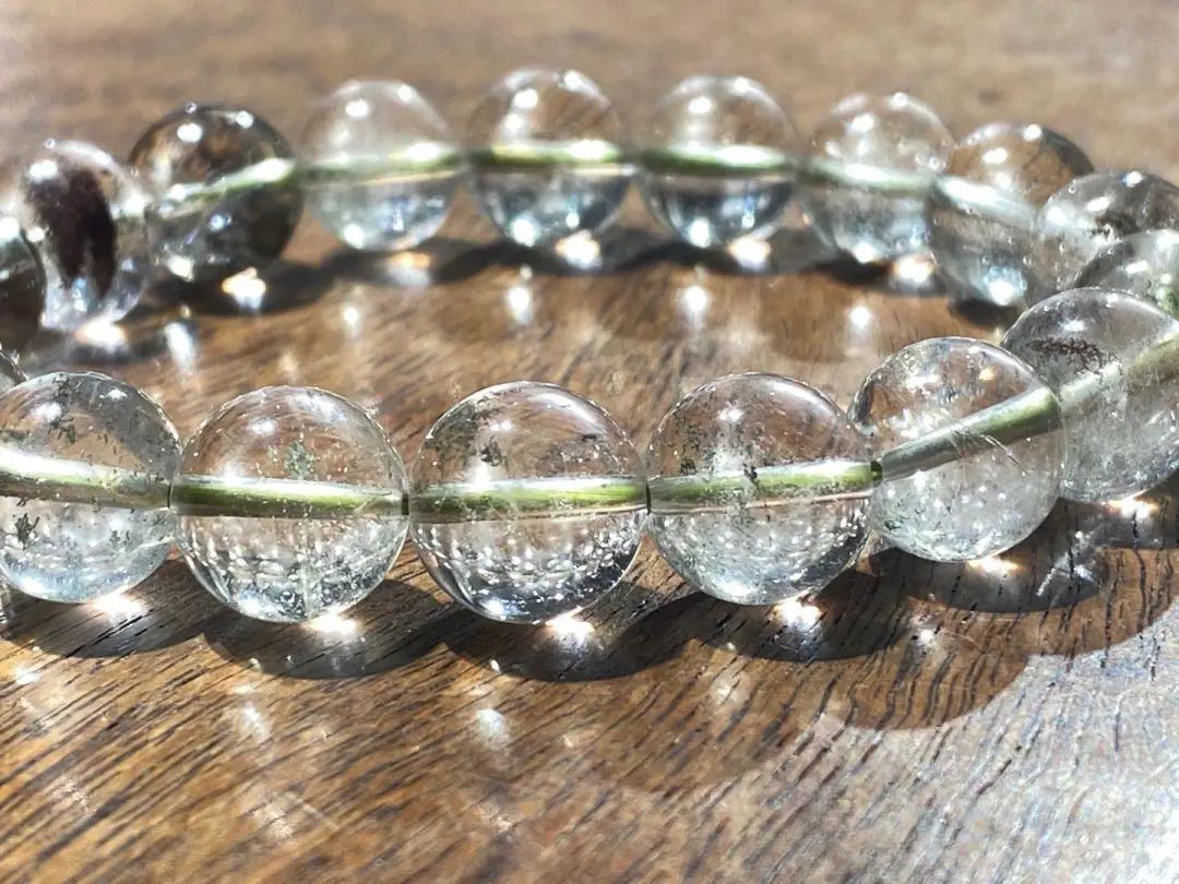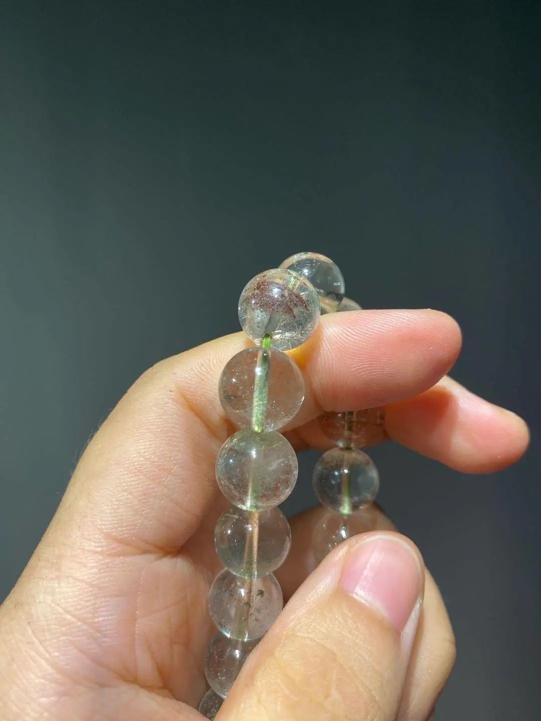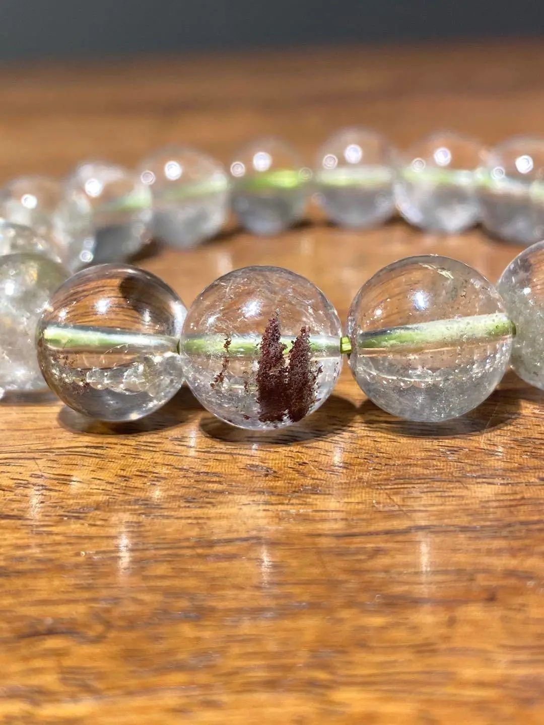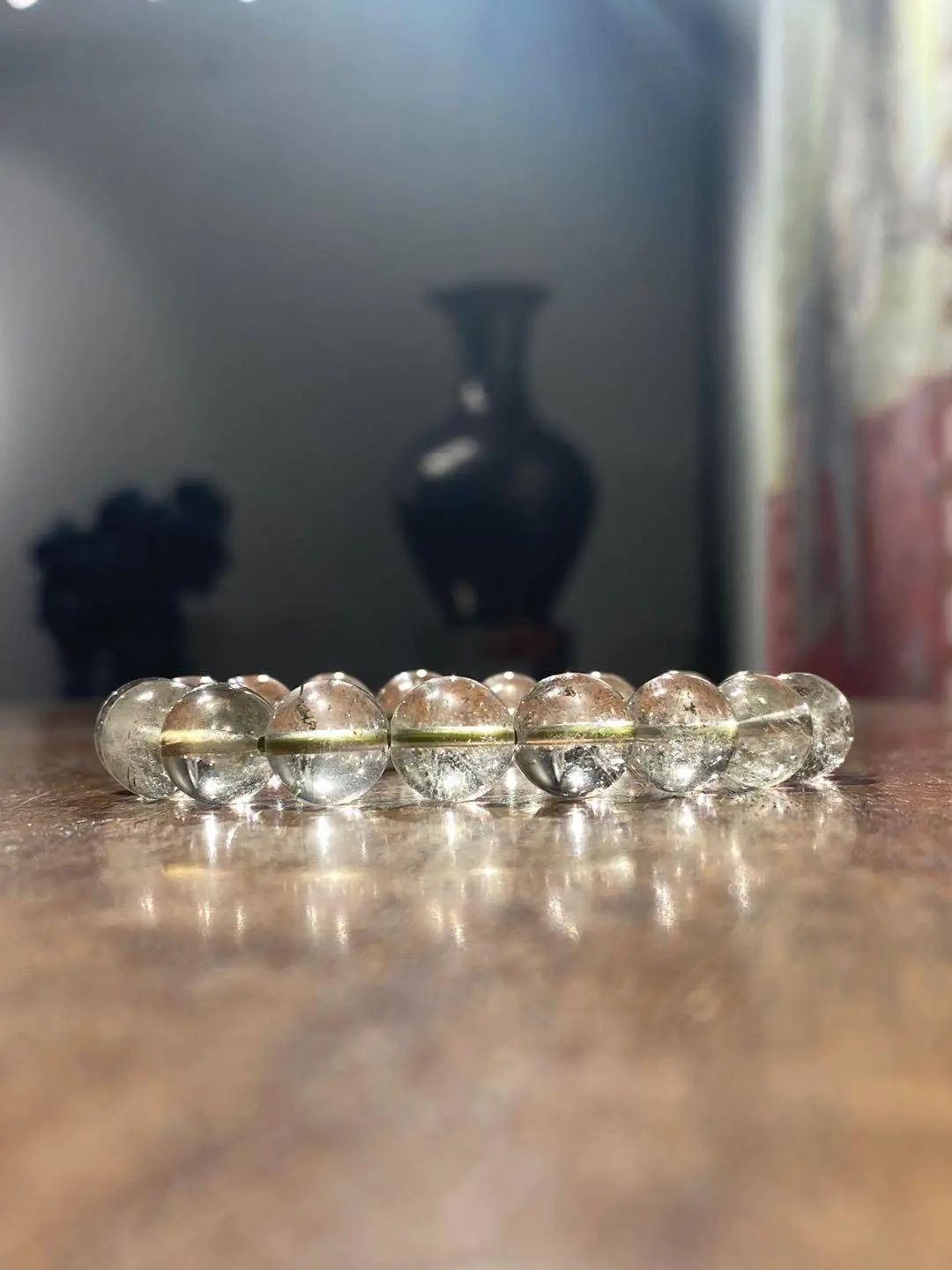 这是一串以天然透明白晶圆珠串成的手链,18粒晶莹通透的天然白水晶圆珠,正圆造型细腻、老砣具钻孔痕迹明显,表面雾光,质地通透有天然絮状与细微棕色瑕玼,包浆皮壳温润细腻。