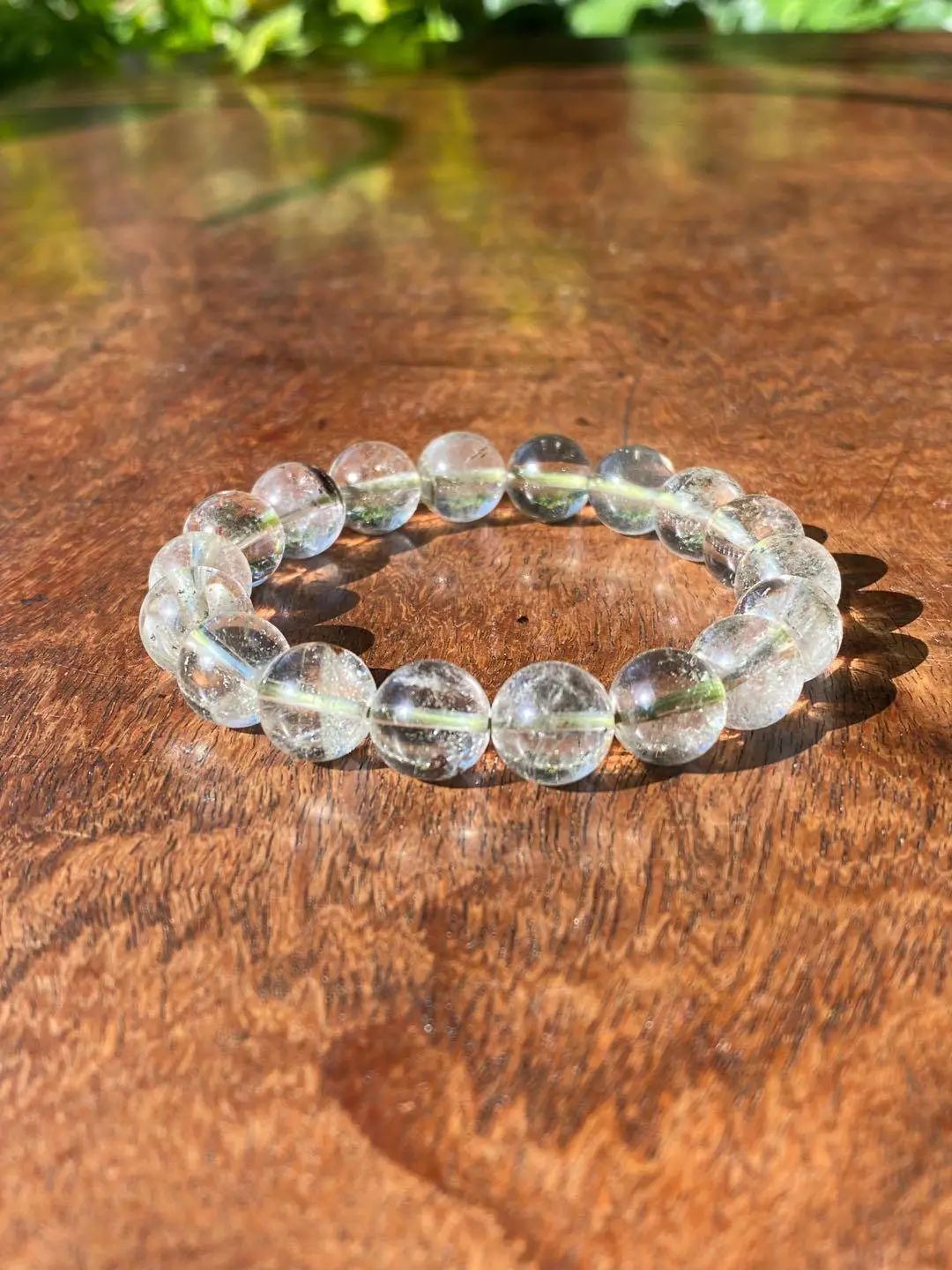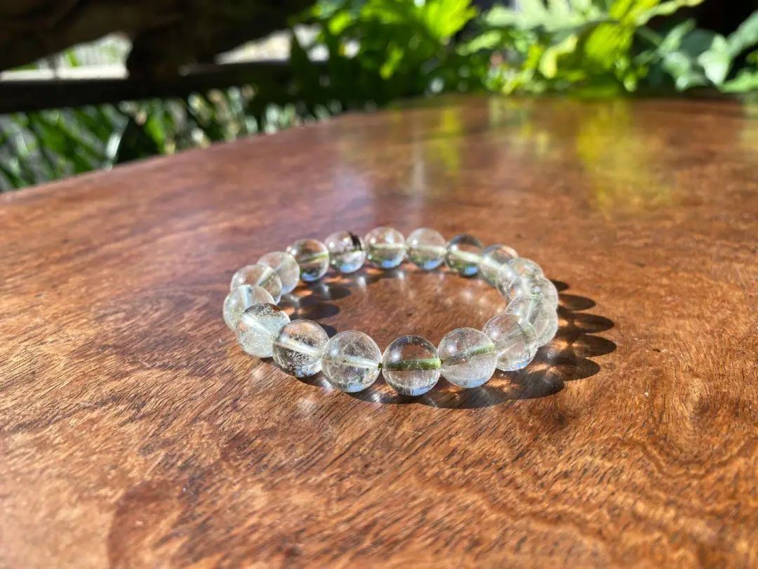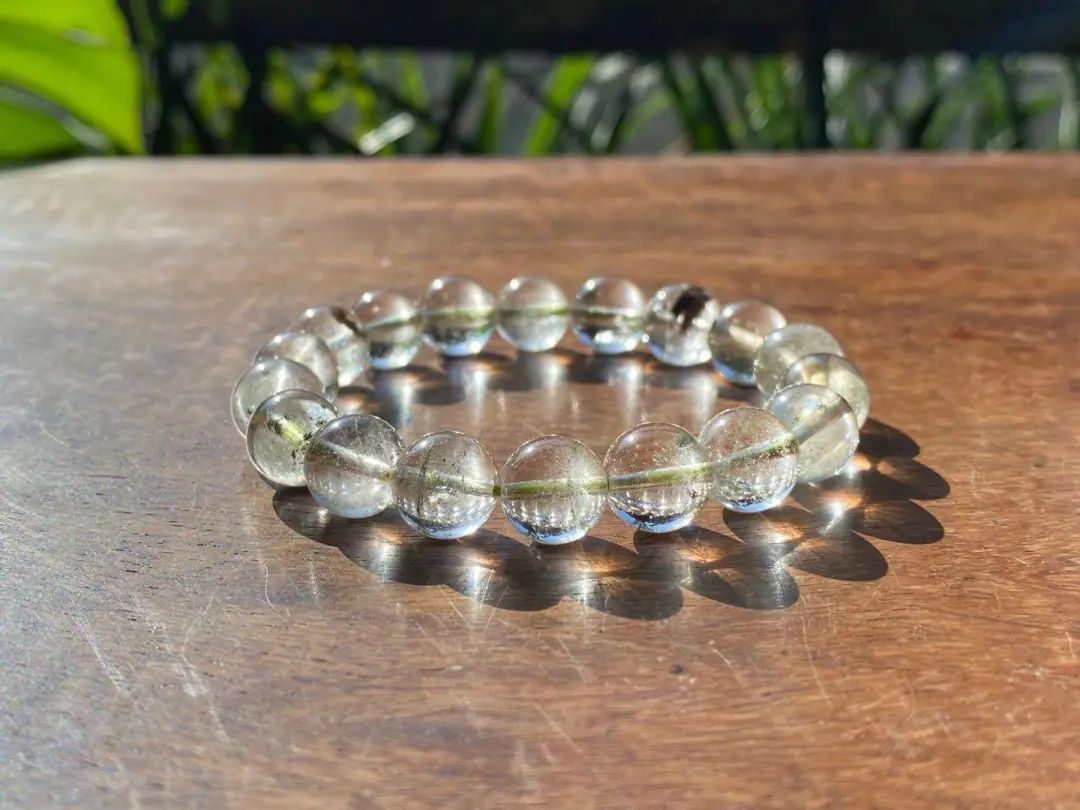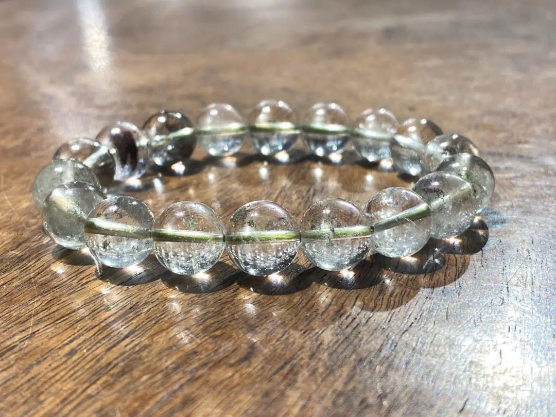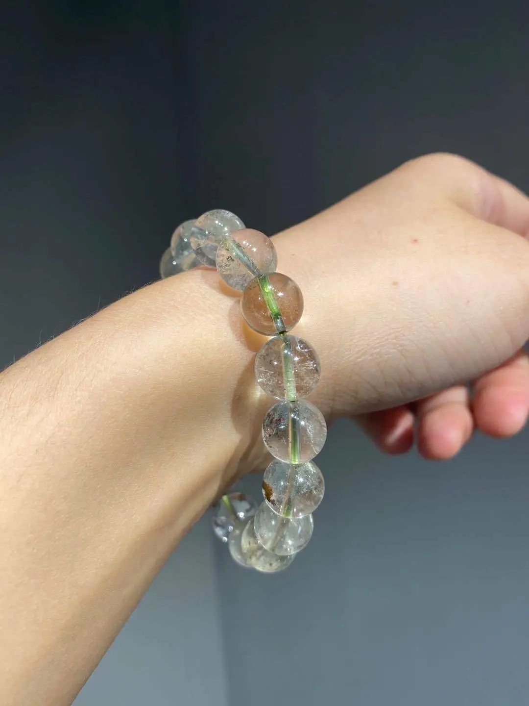 这是一串以天然透明白晶圆珠串成的手链,18粒晶莹通透的天然白水晶圆珠,正圆造型细腻、老砣具钻孔痕迹明显,表面雾光,质地通透有天然絮状与细微棕色瑕玼,包浆皮壳温润细腻。