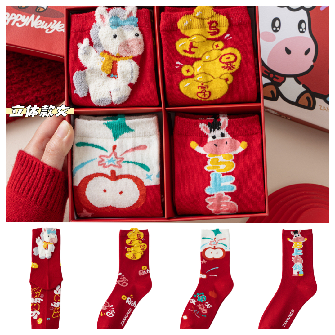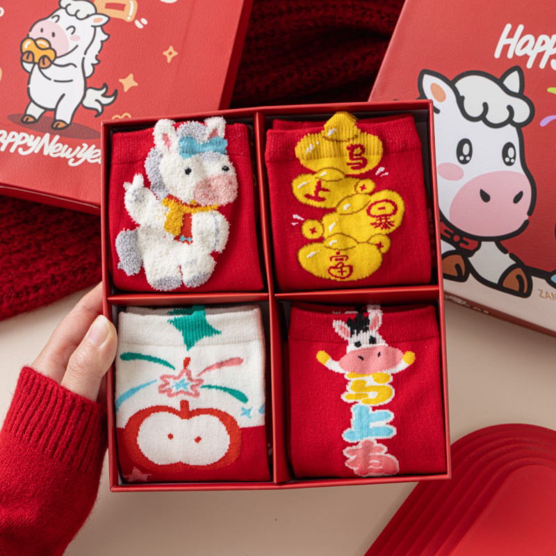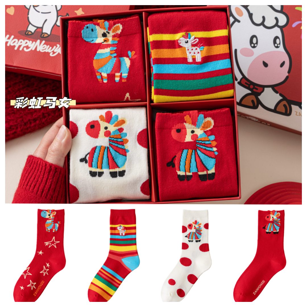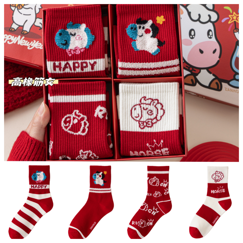 4双装礼盒礼袋!新年本命年马年大红袜子 优质棉袜 超可爱小马图案 新年送人必备单品