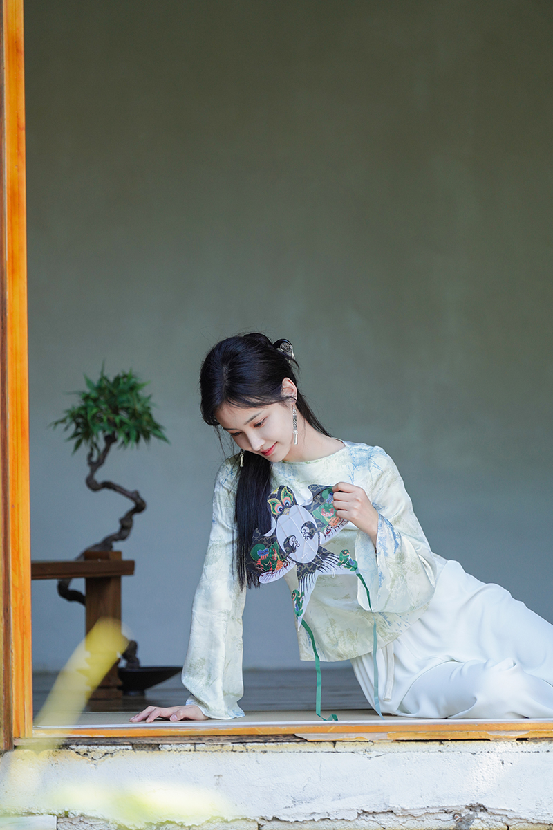 喇叭袖口兜住四时风露,春可藏桃瓣,秋能纳桂香,抬手时似白鹤晾翅,垂腕处若兰草低垂。