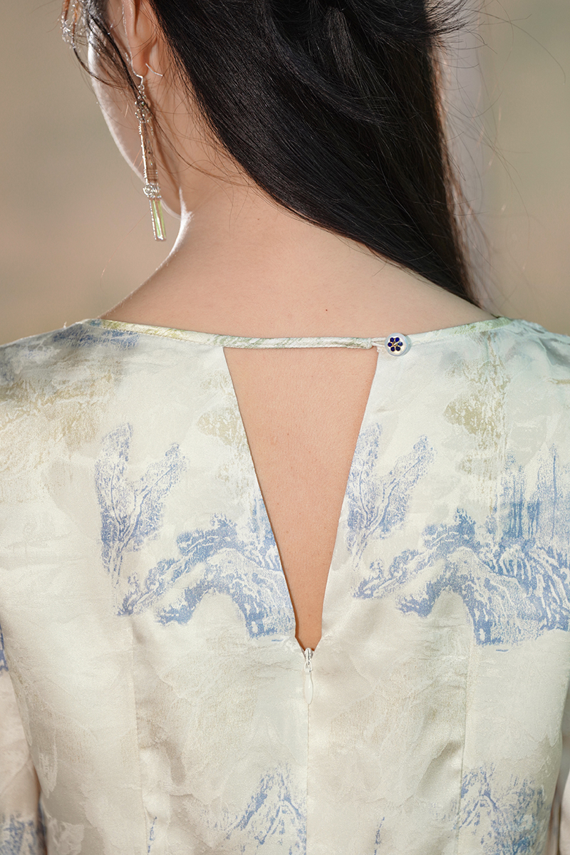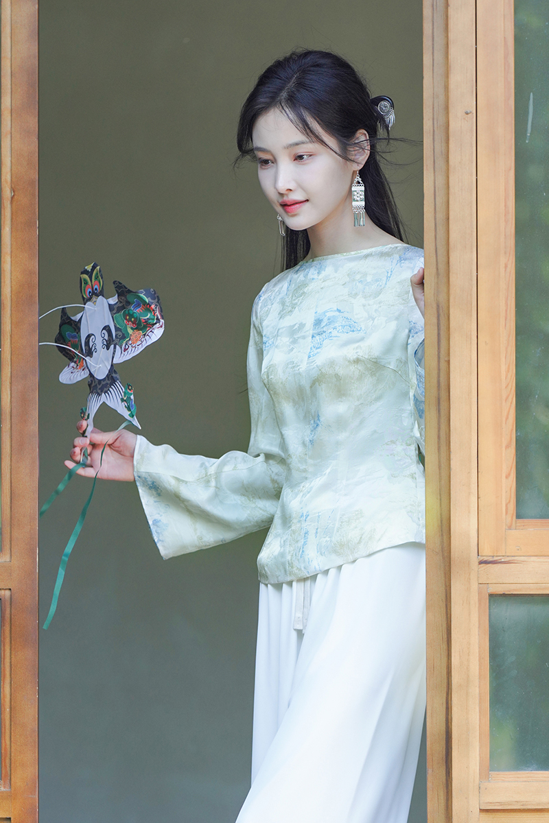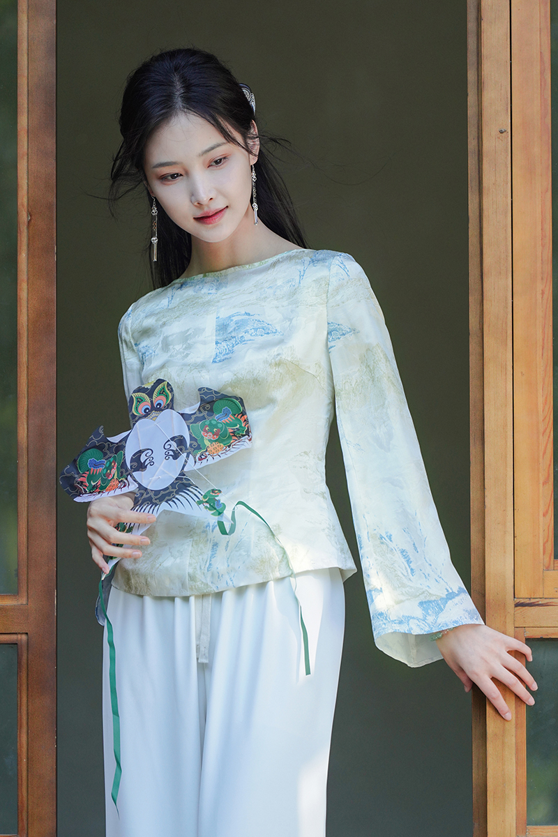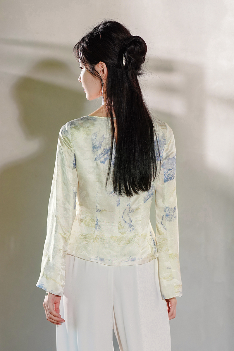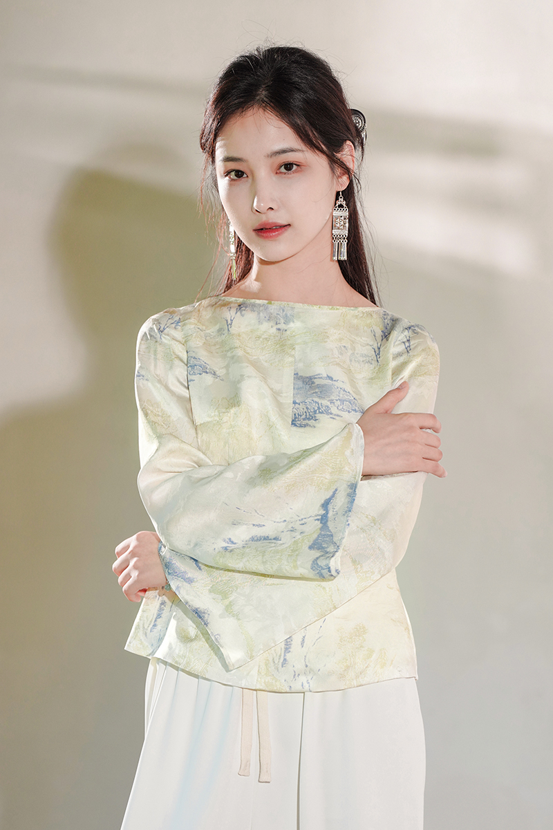 这件上衣将《千里江山图》的山水元素融入设计中,呈现出一种静谧而深远的自然美,富有文化内涵。
