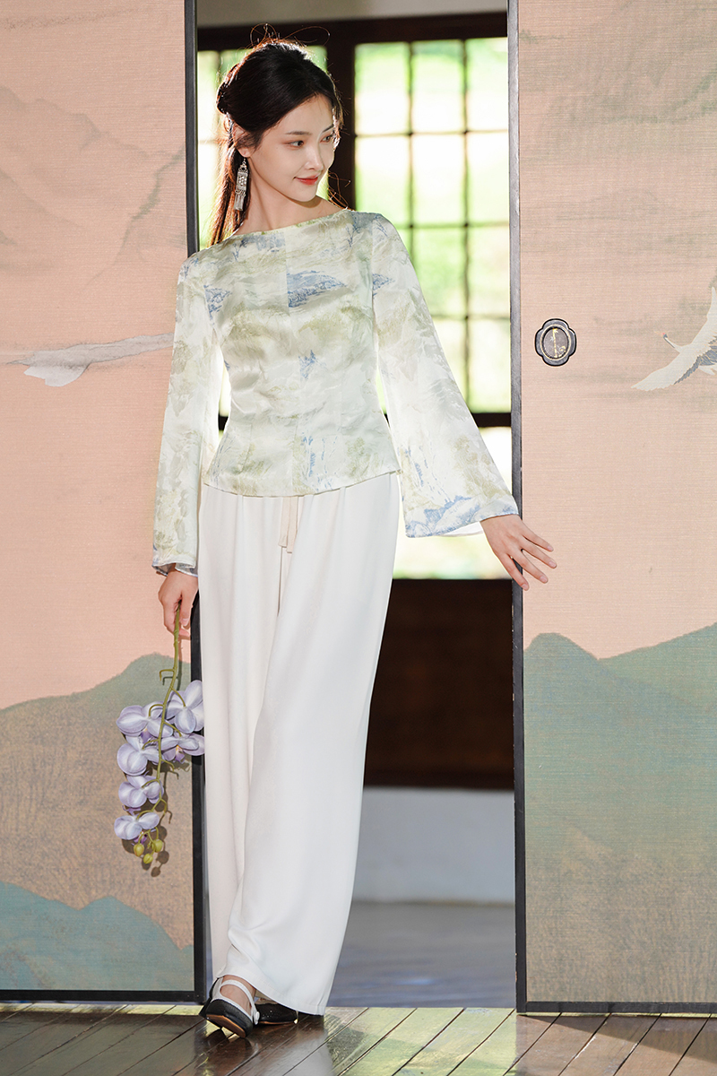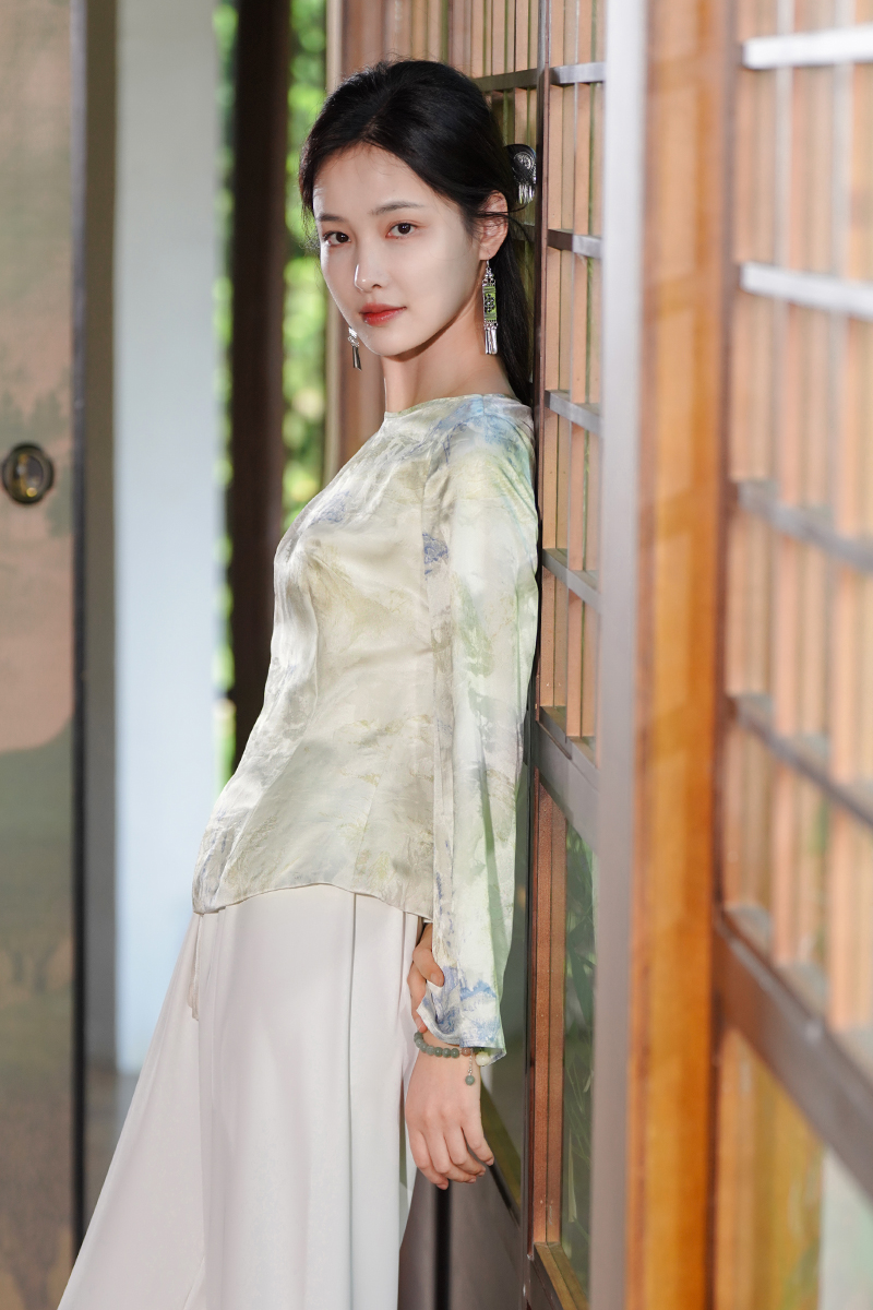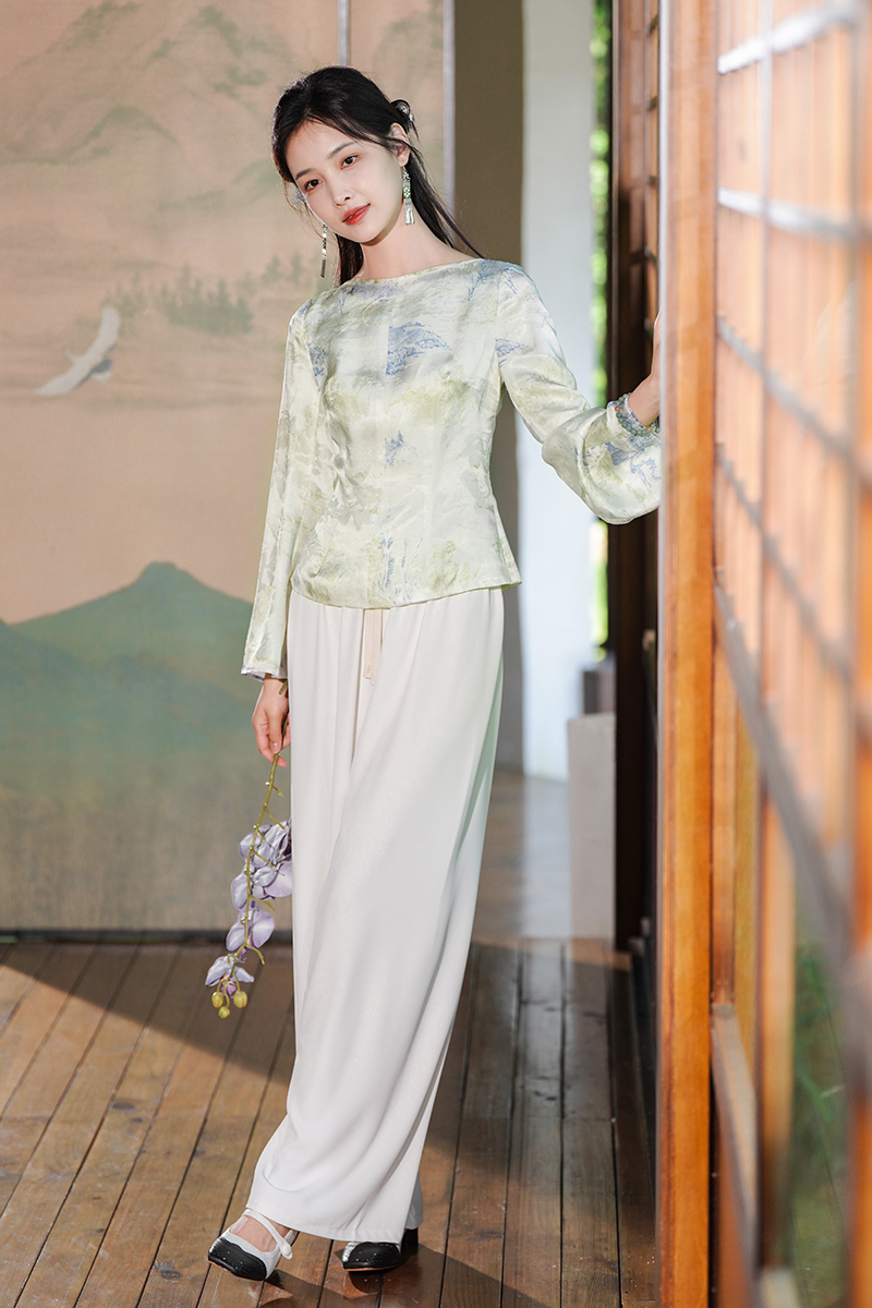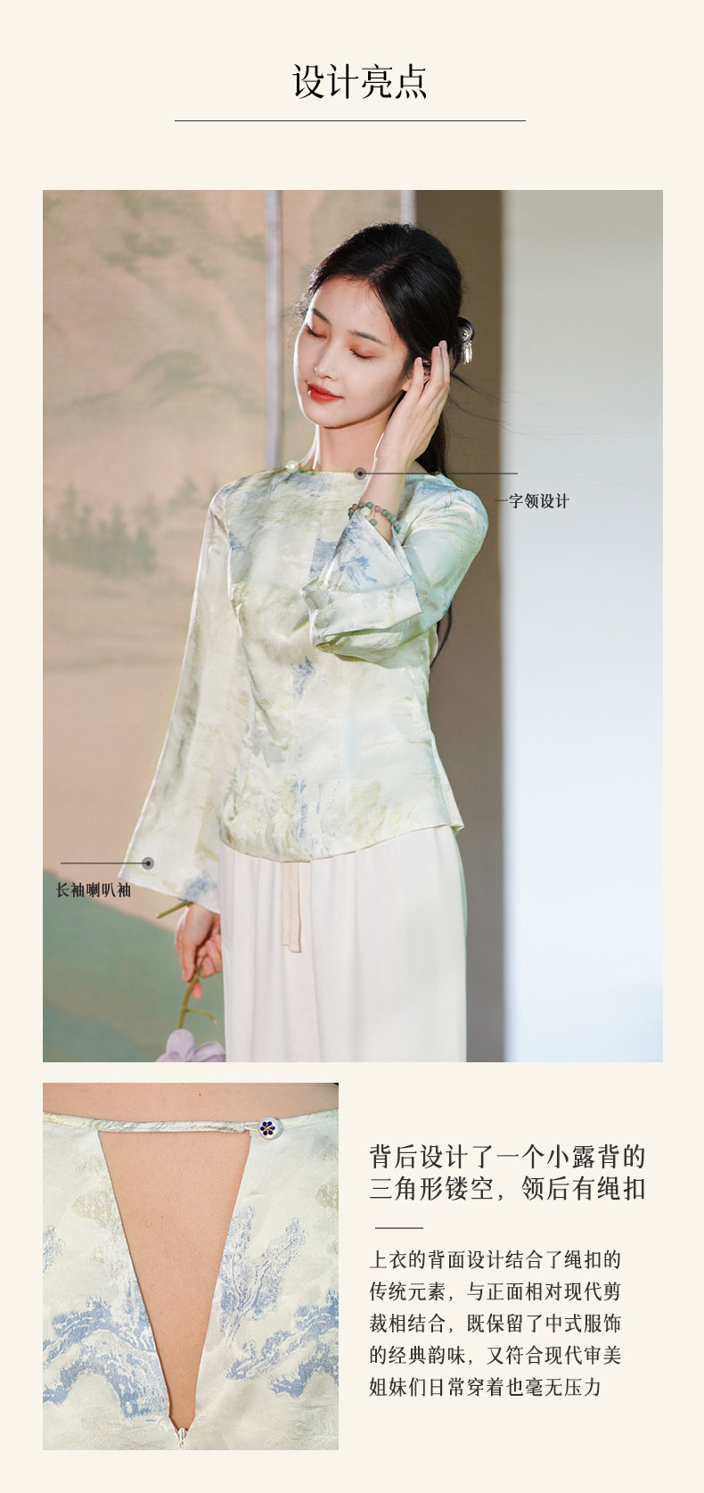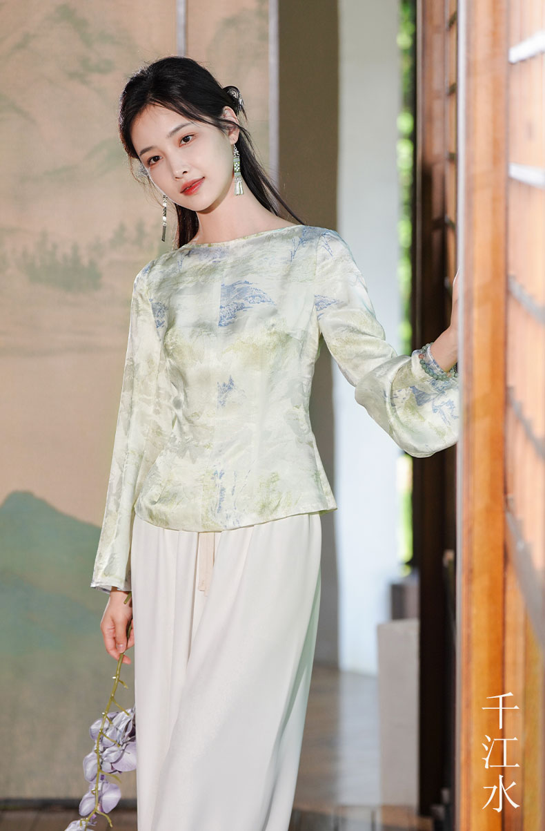 这件上衣将《千里江山图》的山水元素融入设计中,呈现出一种静谧而深远的自然美,富有文化内涵。