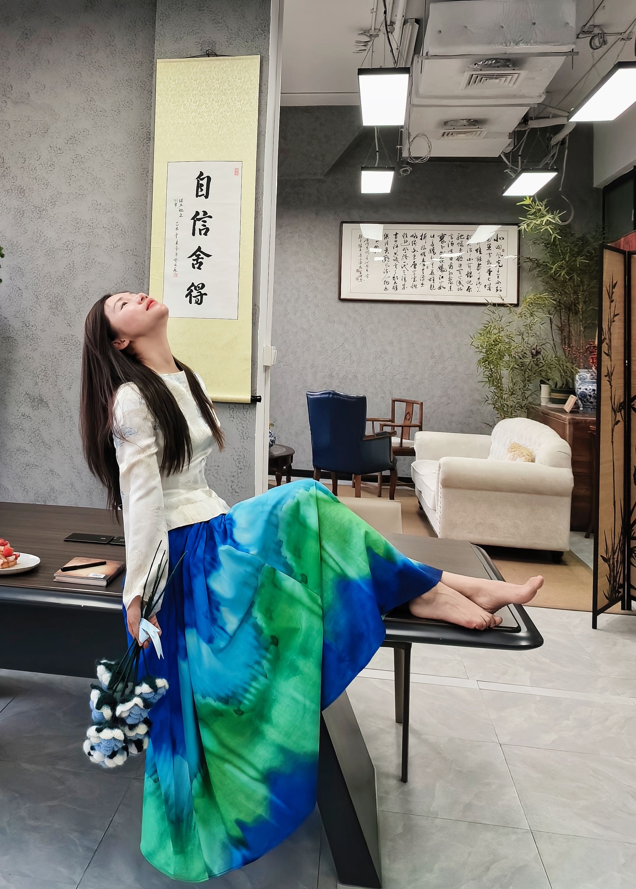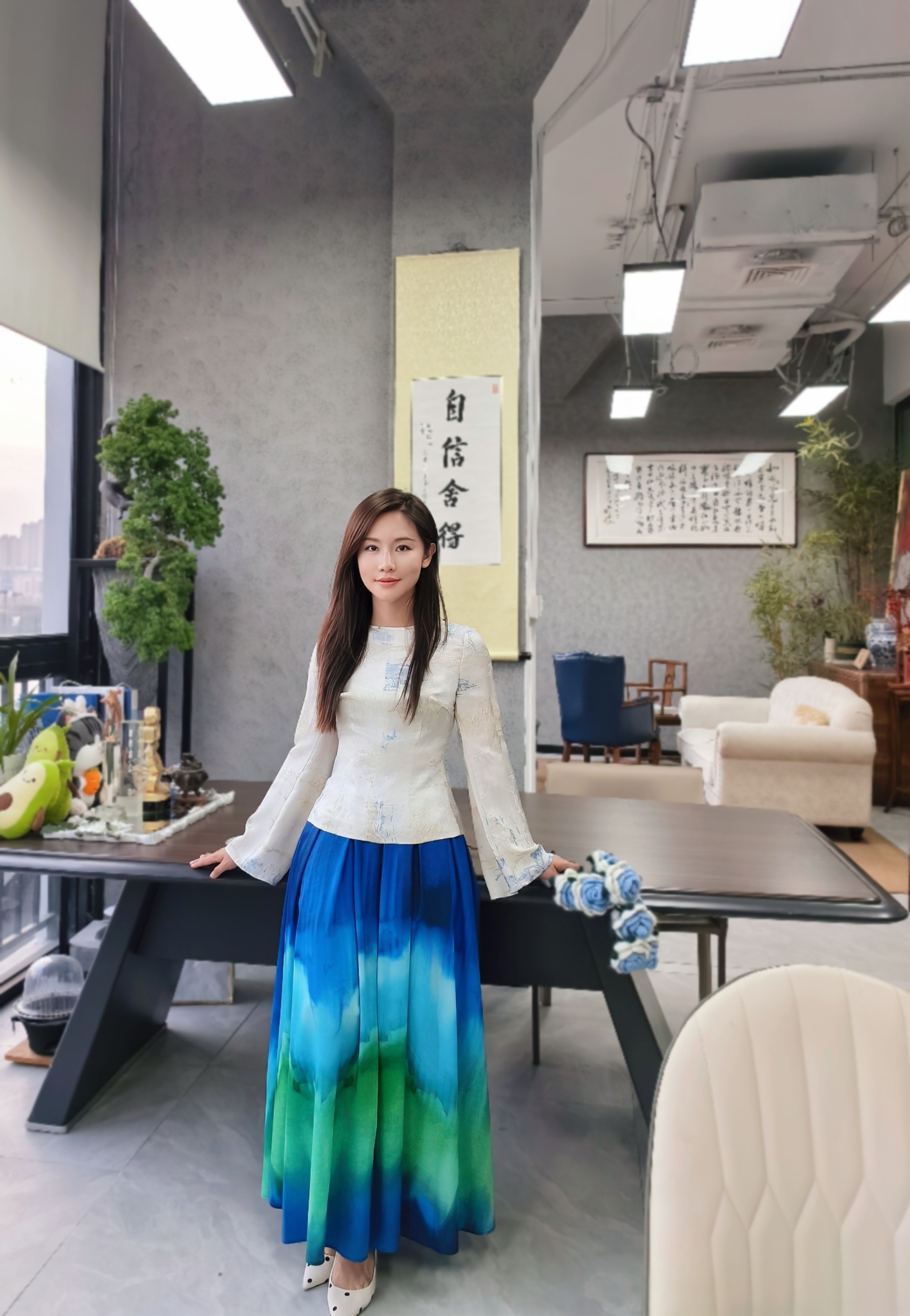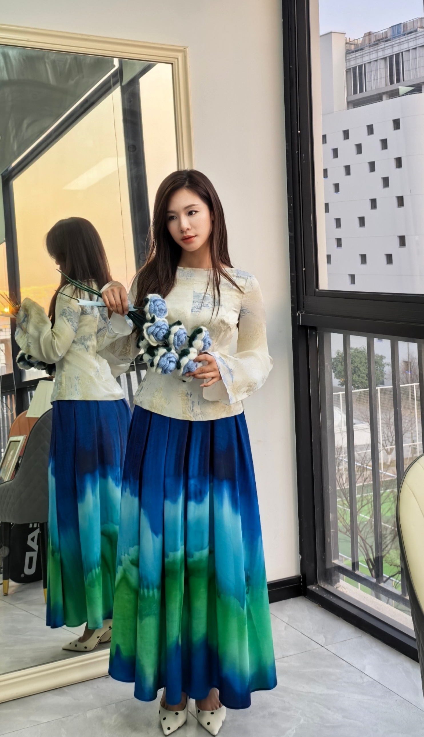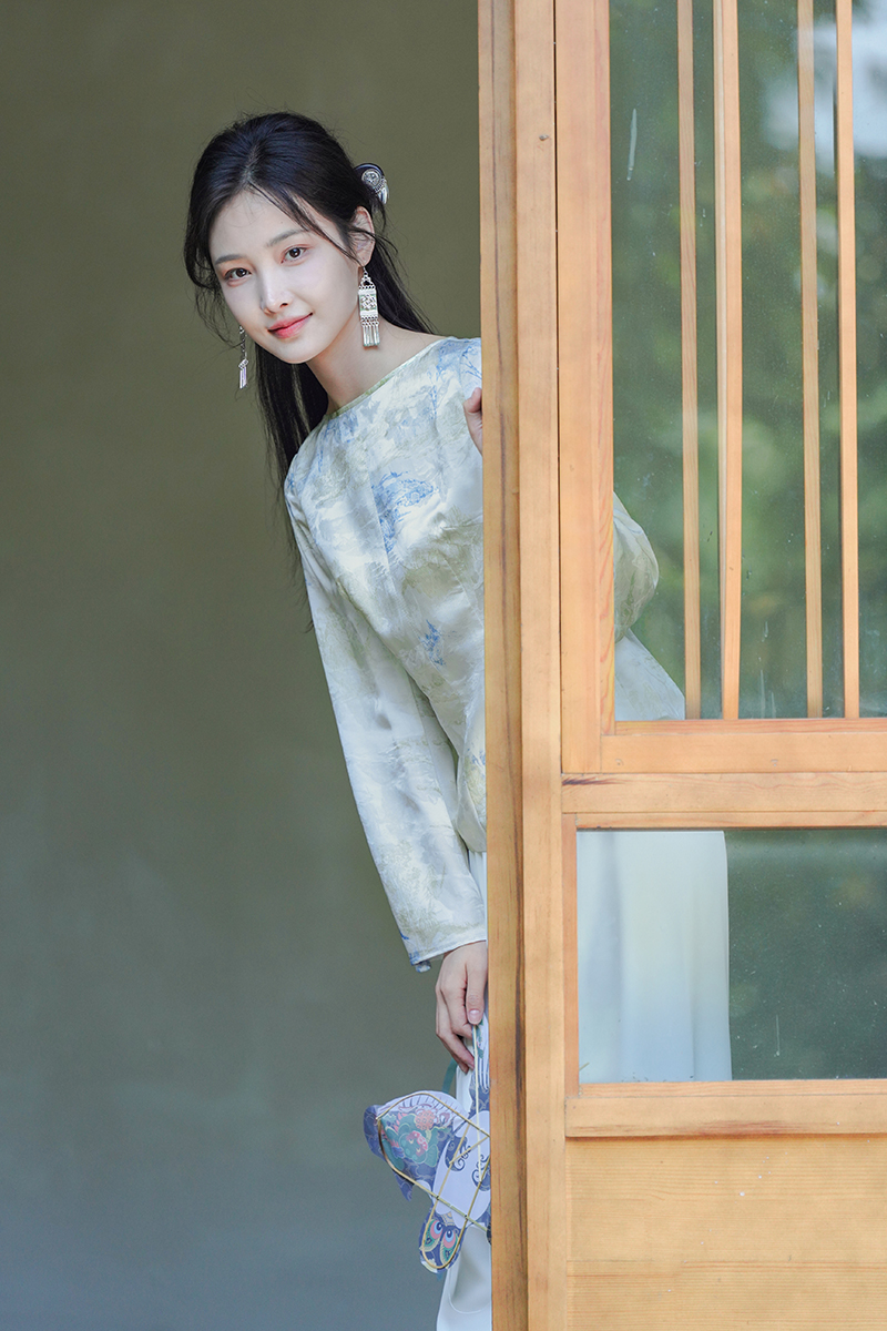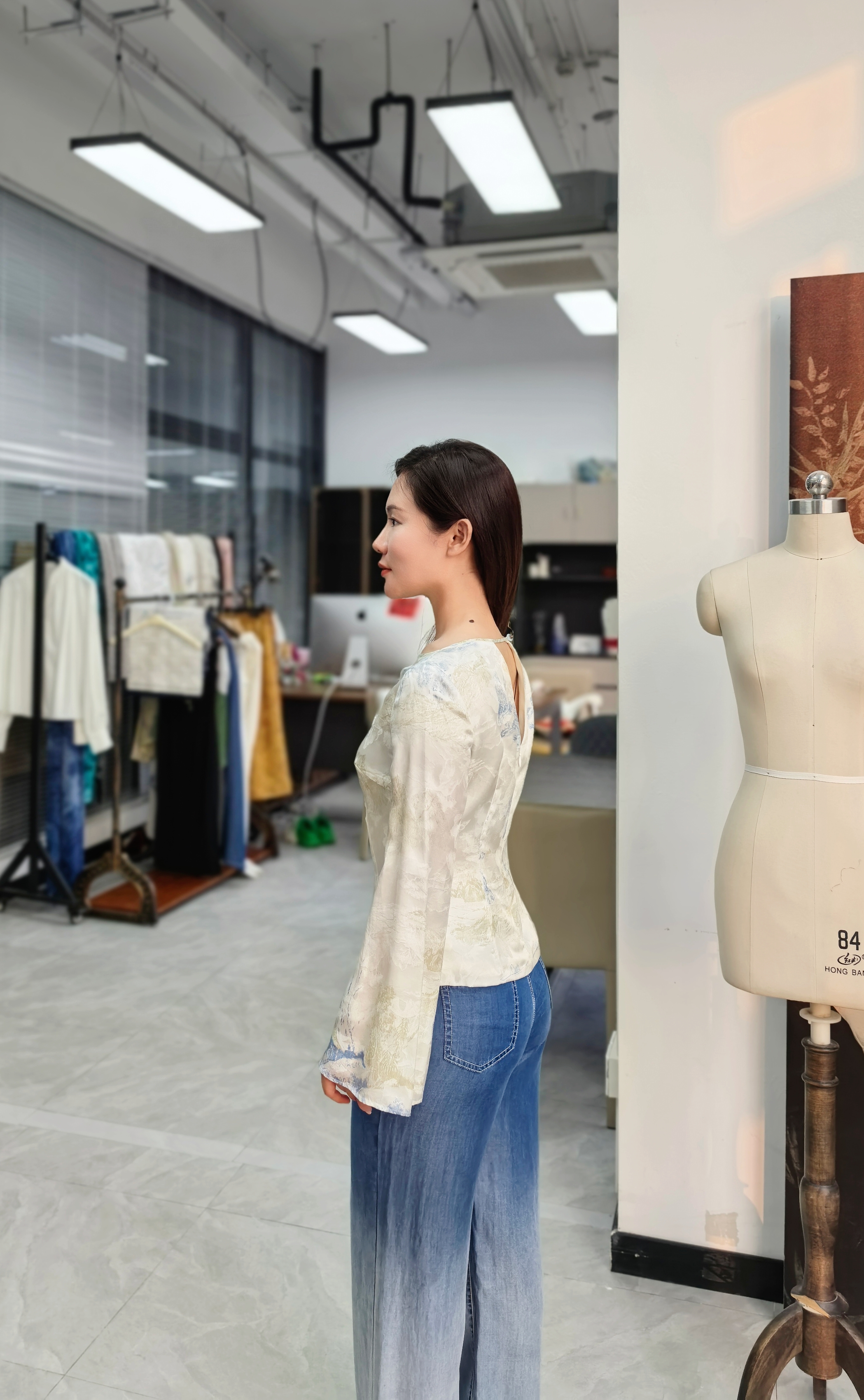 这件上衣将《千里江山图》的山水元素融入设计中,呈现出一种静谧而深远的自然美,富有文化内涵。