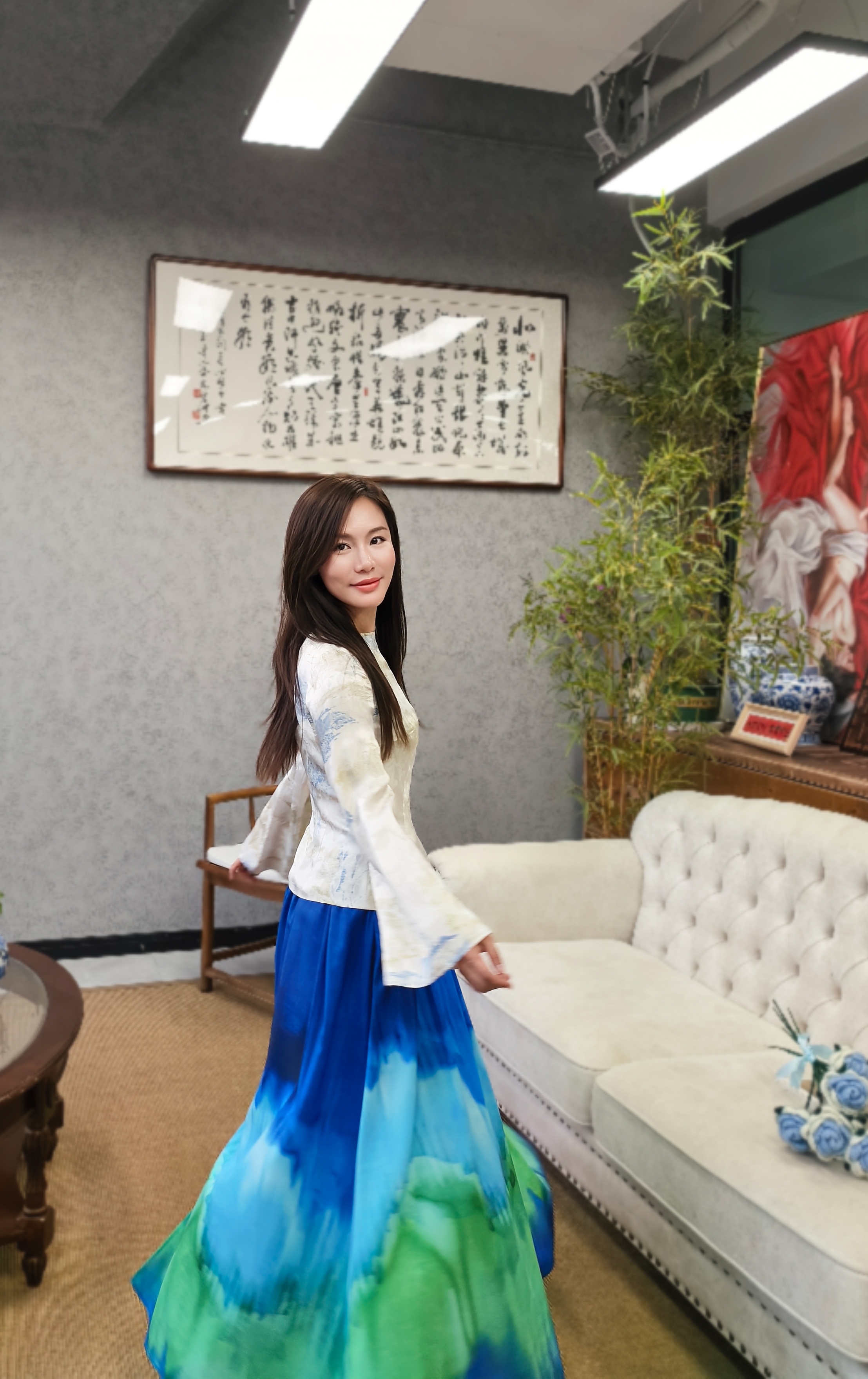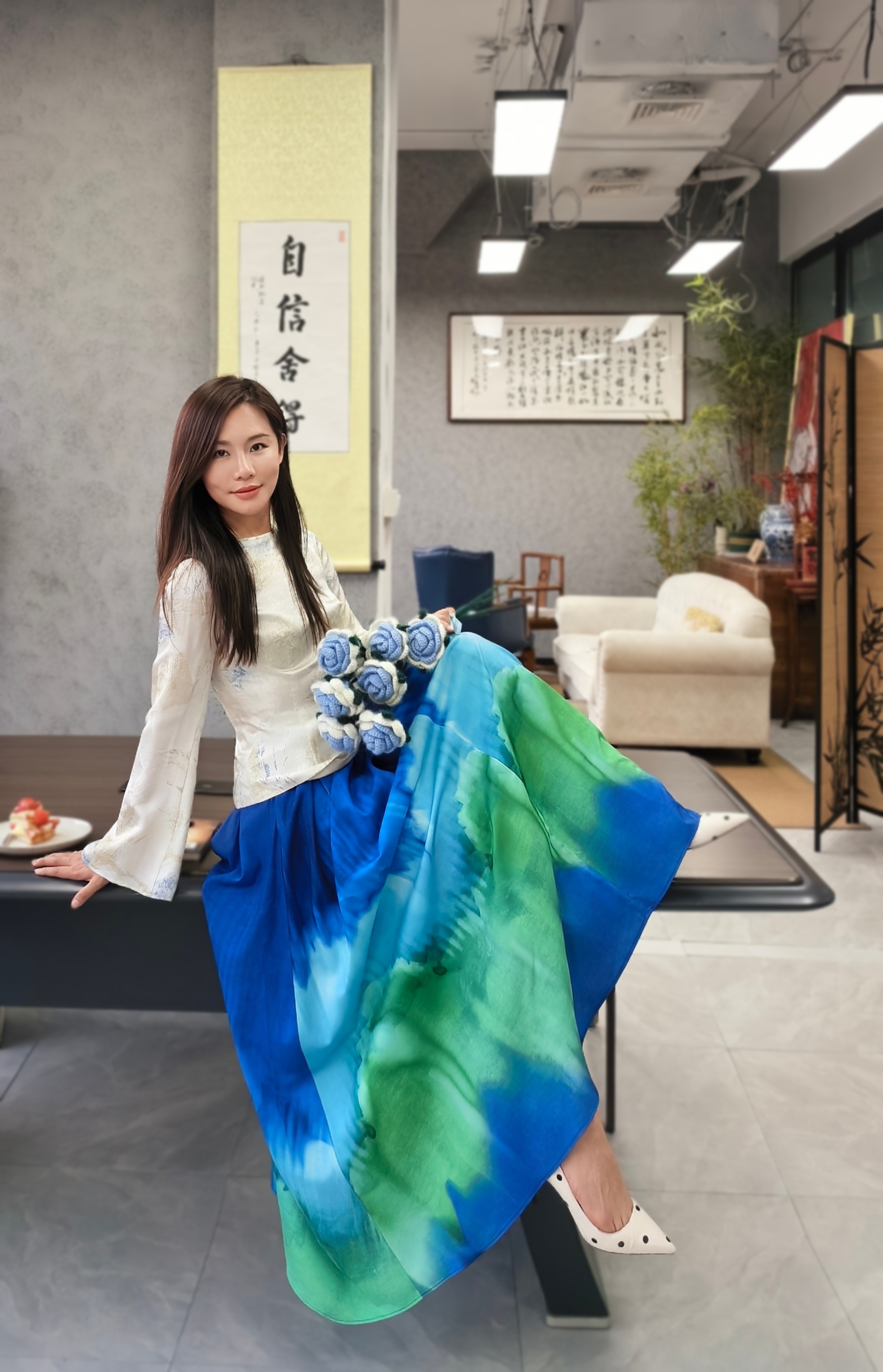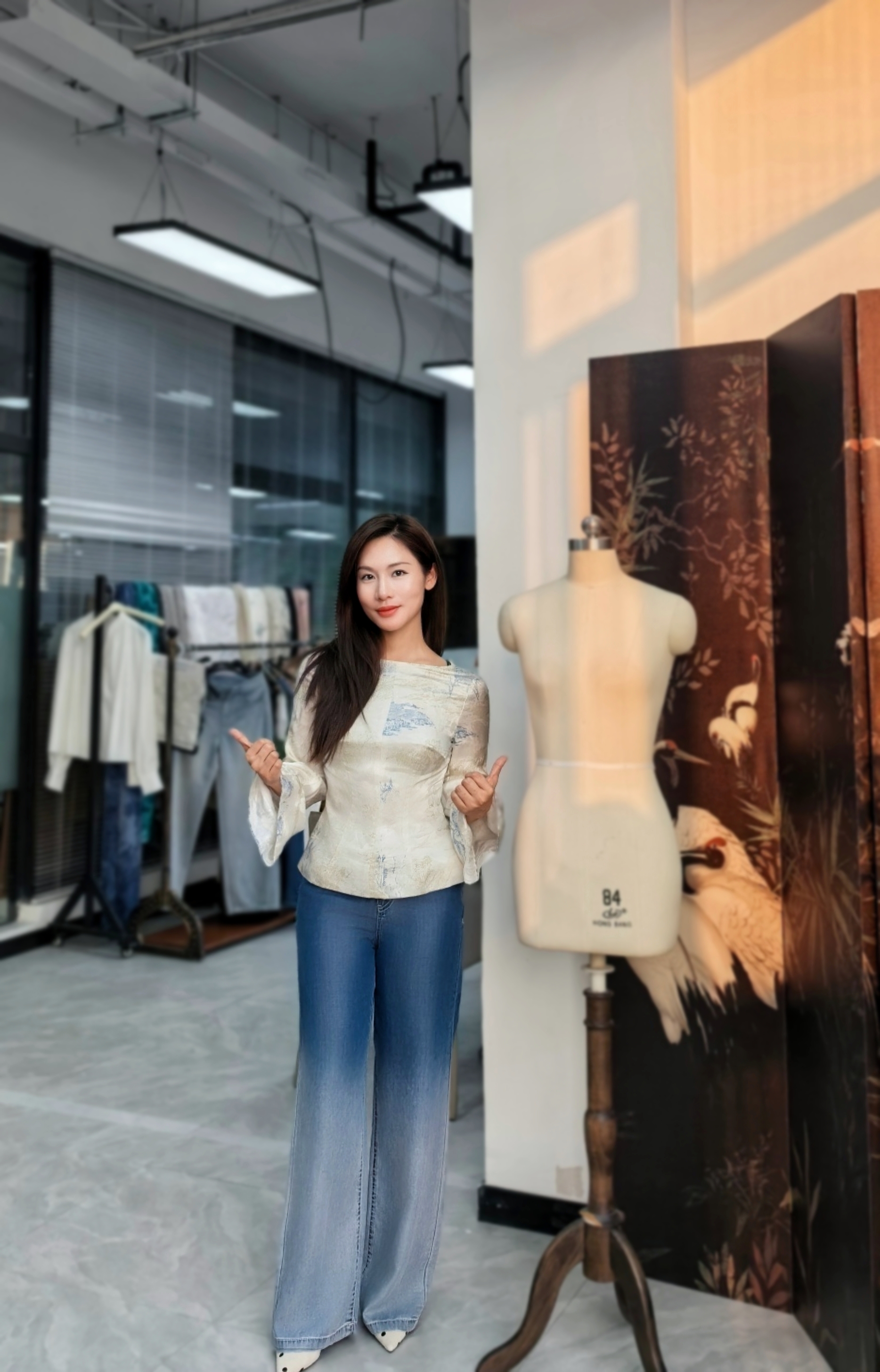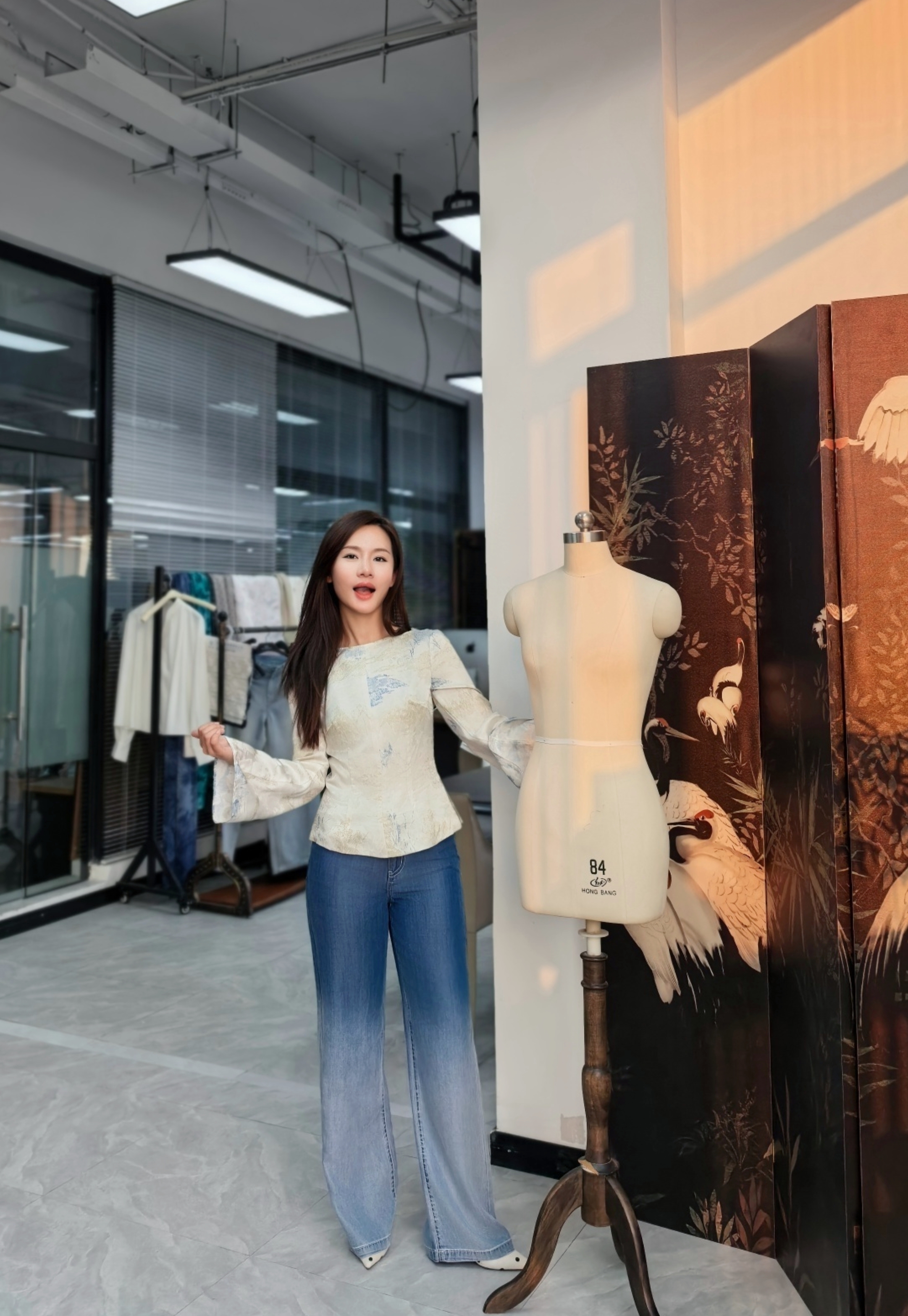 这件上衣将《千里江山图》的山水元素融入设计中,呈现出一种静谧而深远的自然美,富有文化内涵。