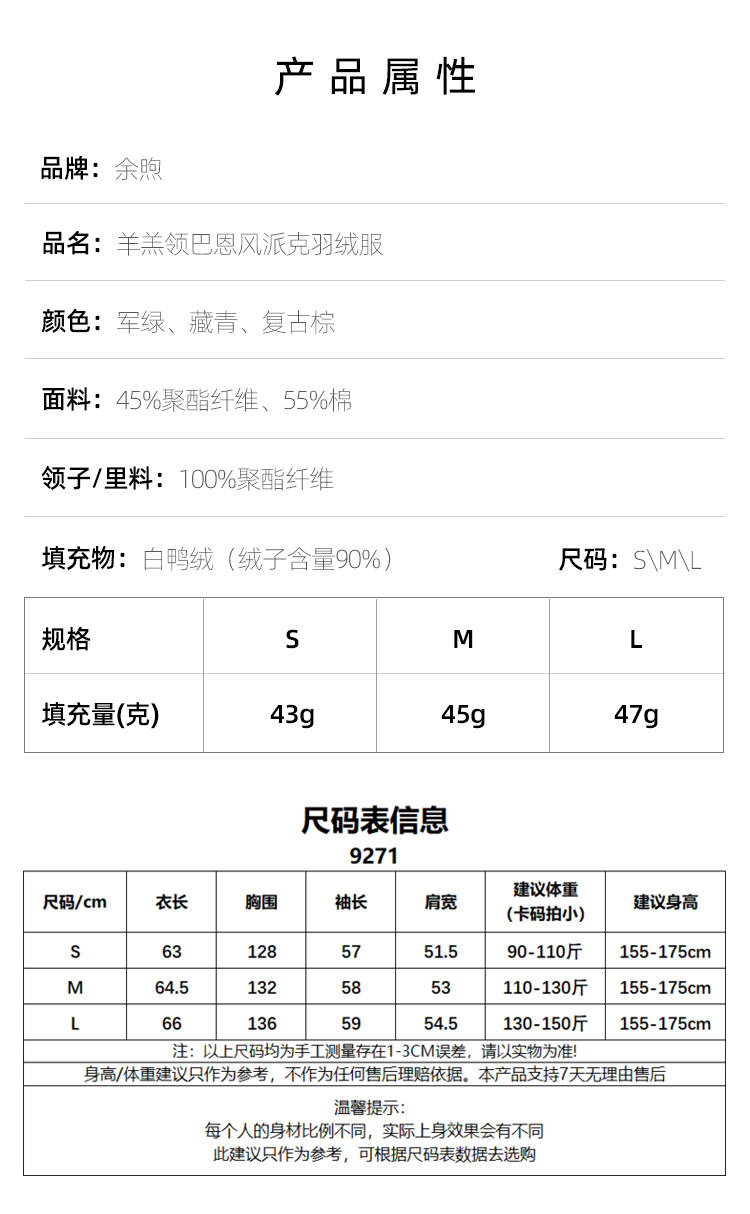 衣服采用55%棉+45%聚酯纤维混纺的高密度面料,面料高捻高密织造,有效预防跑绒钻绒,轻柔好打理,而且穿着过程不易变形。