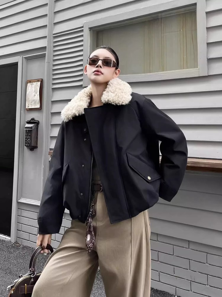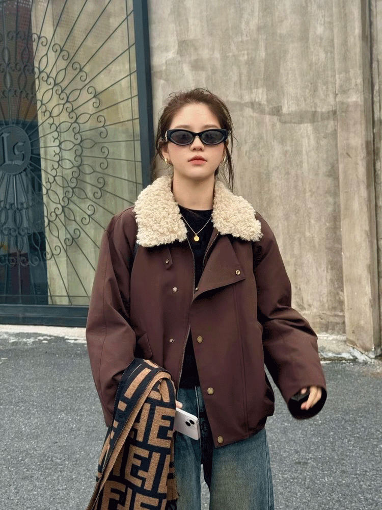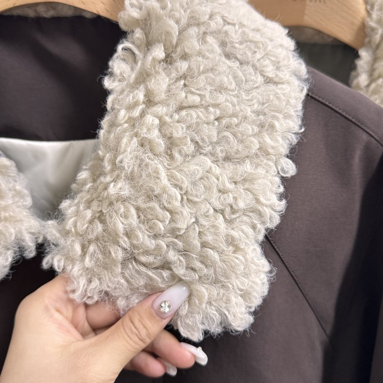 这带着卷曲的羊羔毛领,还很蓬松柔软、手感特别糯滑。