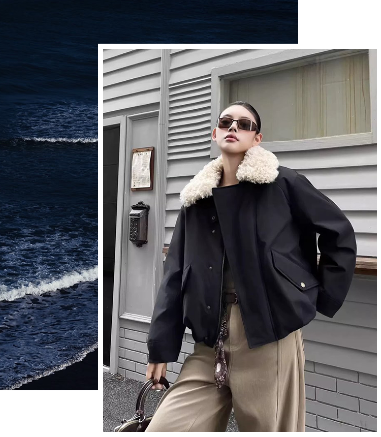 典的藏青色适配所有秋冬穿搭,大毛领锁住了脖颈暖意,又添几分松弛贵气感。