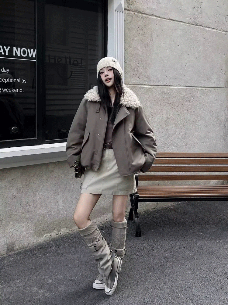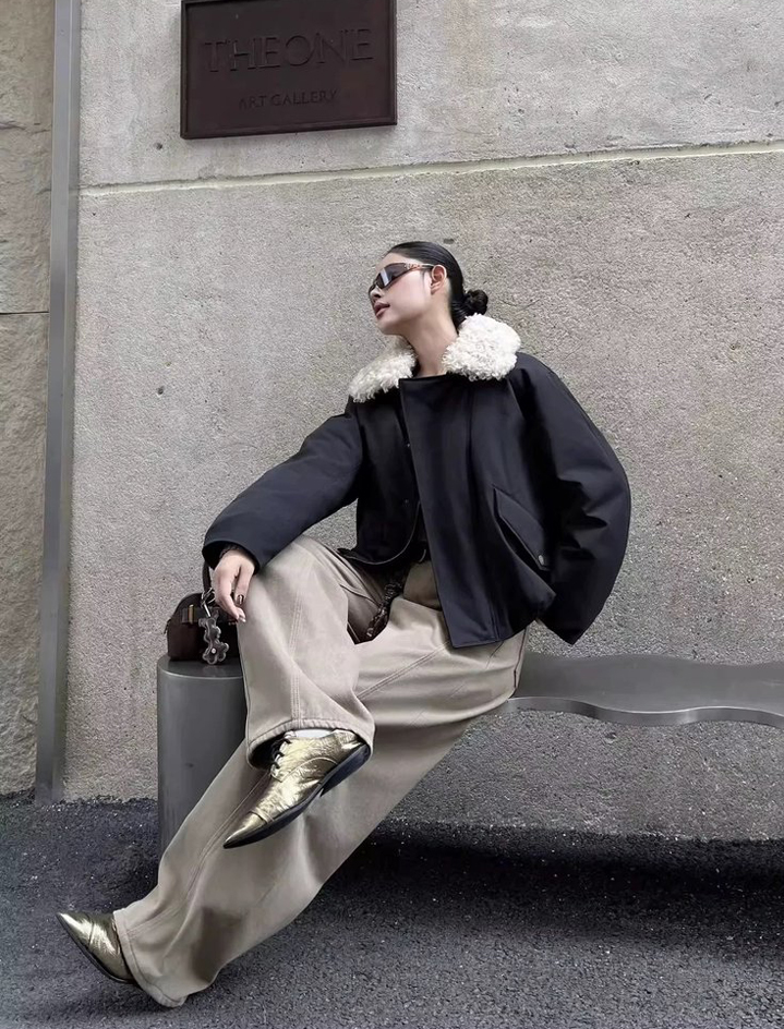 一眼吸睛的羊羔大毛领,软软糯糯地翻折在肩膀上,亦或是用衣领的扣子使其立起来,呵护住脖颈,积蓄静谧的温暖之力。