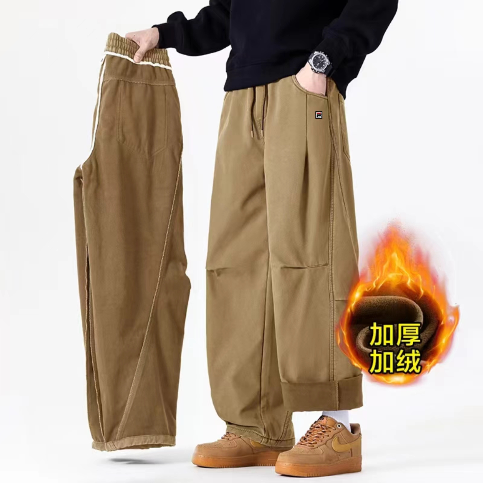 高品质加绒加厚刺绣全棉水洗休闲工装裤】采用新疆棉(100棉)水洗面料,加绒加厚面料,无惧严寒酷冬,立体裁剪,大工装口装,上身潮流有型,重工制作,手感柔软,不掉色。两侧大口袋设计,上身版型非常丸美。回头率十足的一款工装裤,做工质量WAN 美到位,男女同款