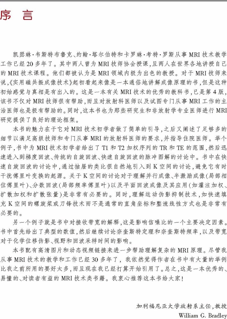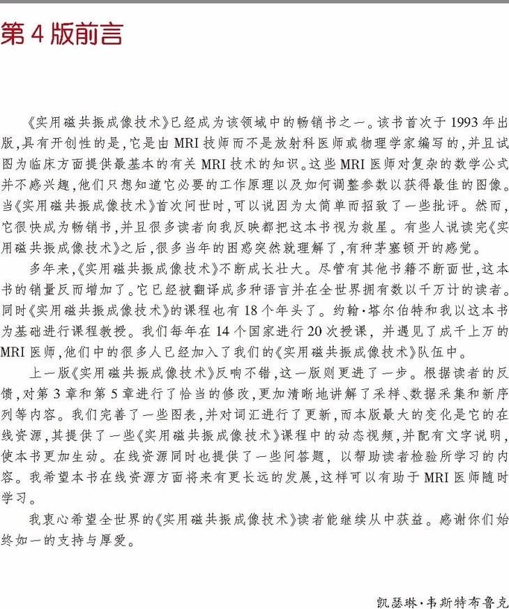 自1993年第1版问世以来,《实用磁共振成像技术》已成为放射诊断医师、放射技师、放射科住院医师、放射研究者以及其他相关人员进行磁共振成像研究的标准。本书是广大医学生学习MRI技术的必读教程。此外,在MR仪器、原理、脉冲序列、图像采集和美国放射技师注册学会(ARRT)提供的MRI高级考试的成像参数方面,《实用磁共振成像技术》是业界公认的首选参考书和学习指南。